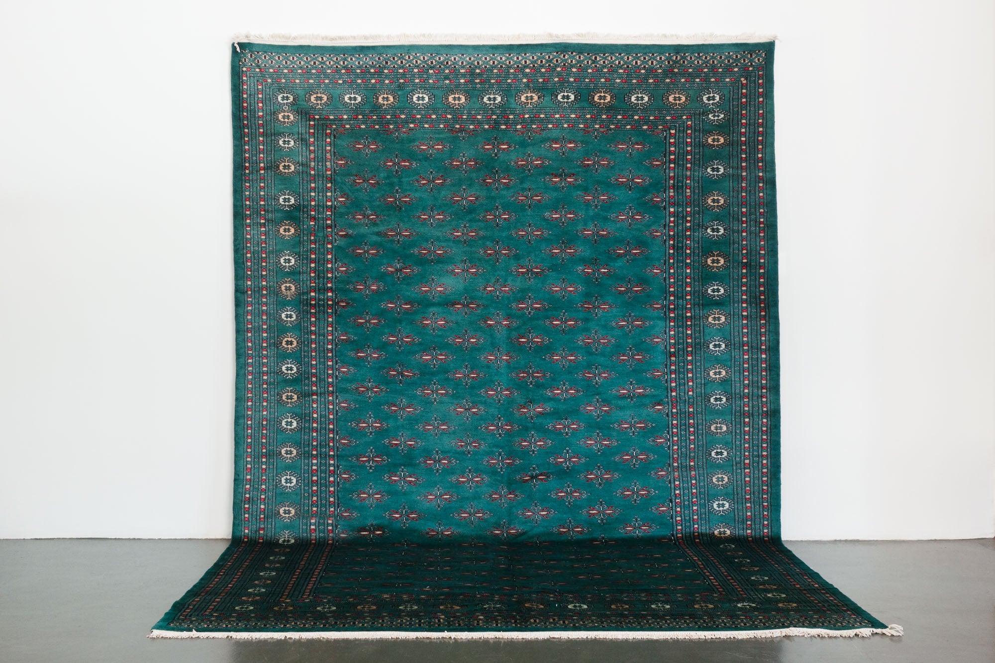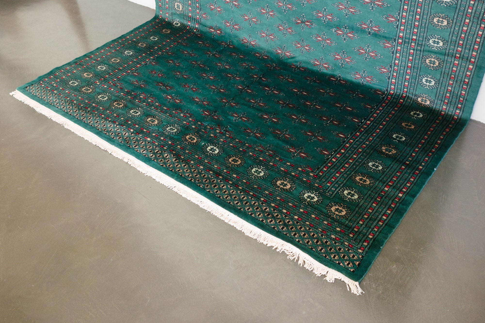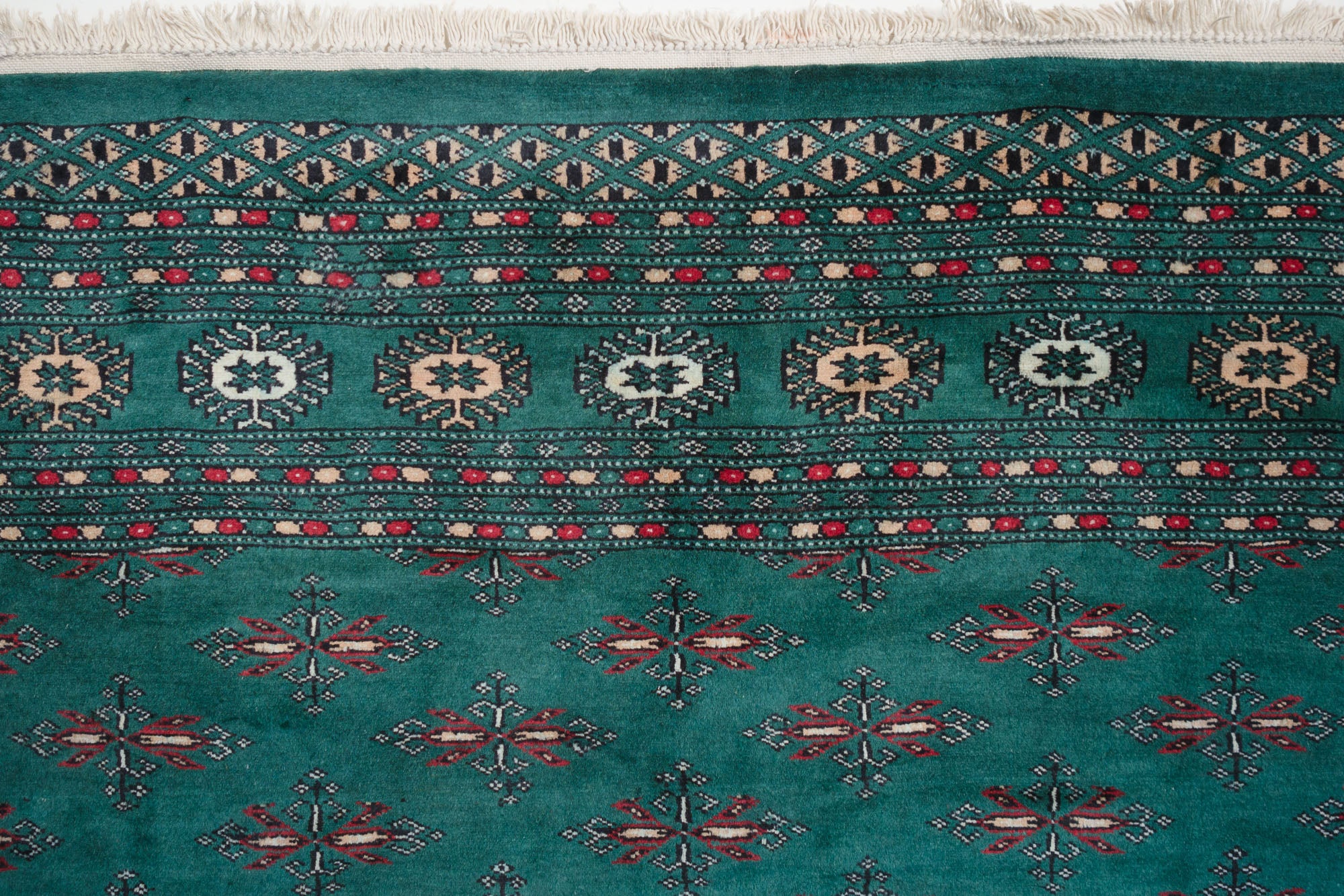 name: Milaorigin: Pakistanstyle: peshawar bokhara, rug, carpetmaterial: hand knotted woolcolors: green, tan, cream, black, red, whiteage: vintage, 1940-1970condition: good, age related wear - see picturesappraised value: $3548sku: pk-220