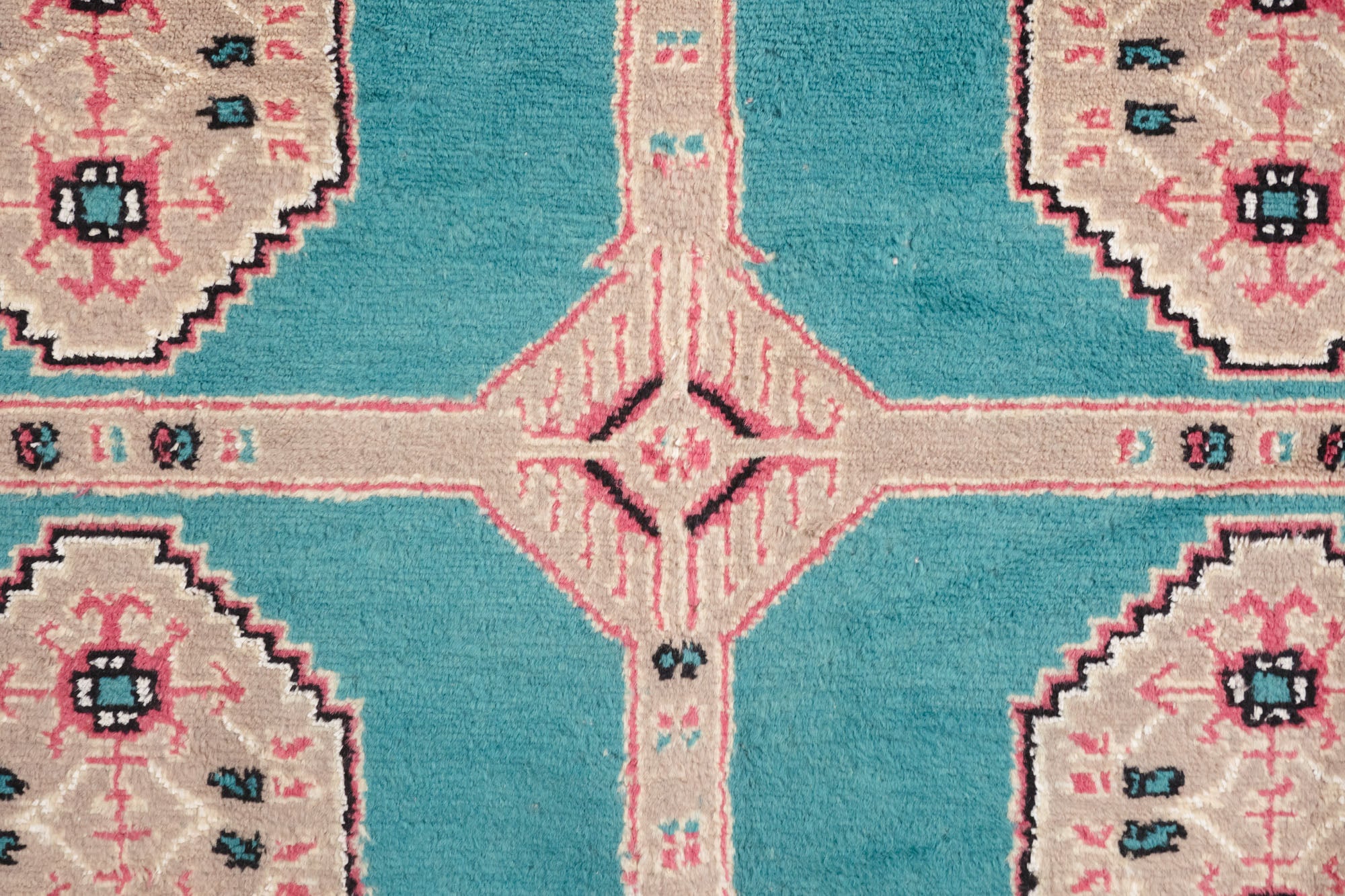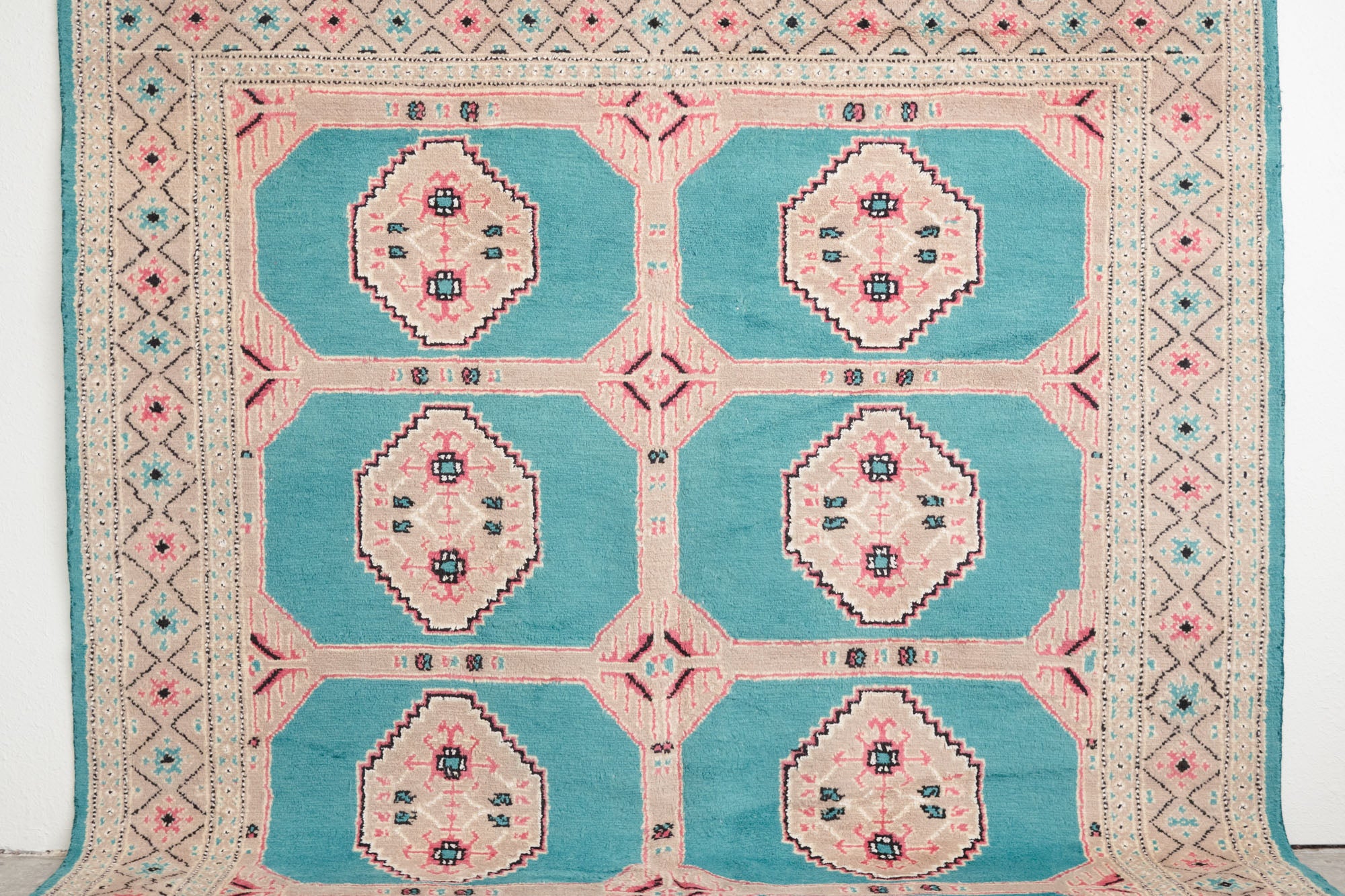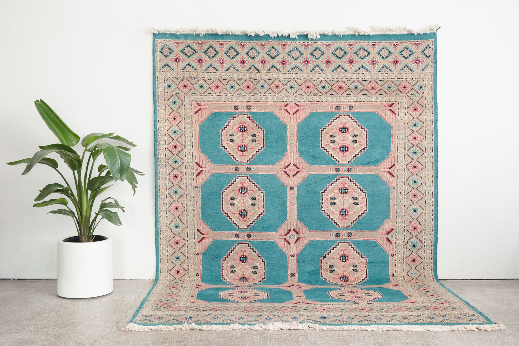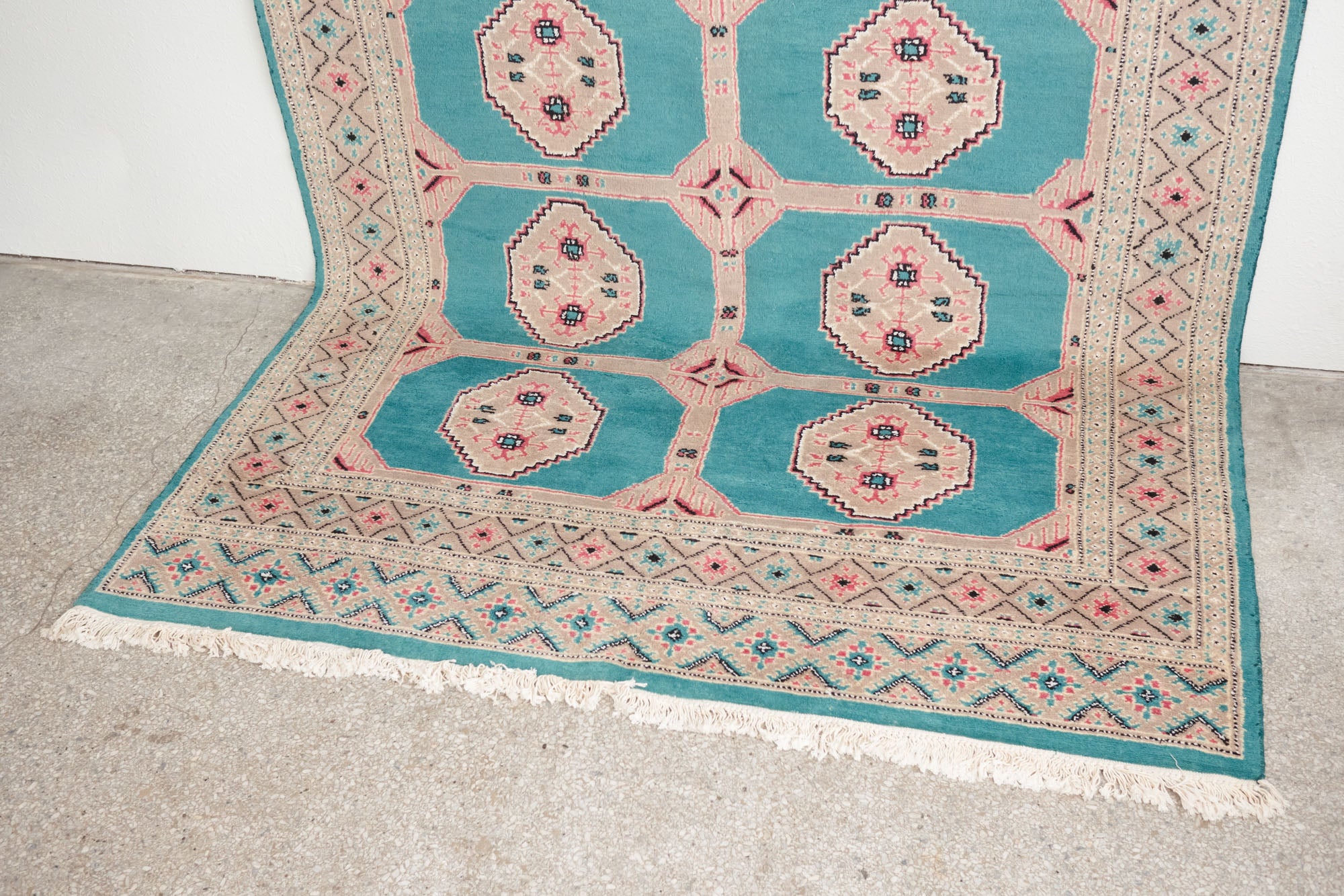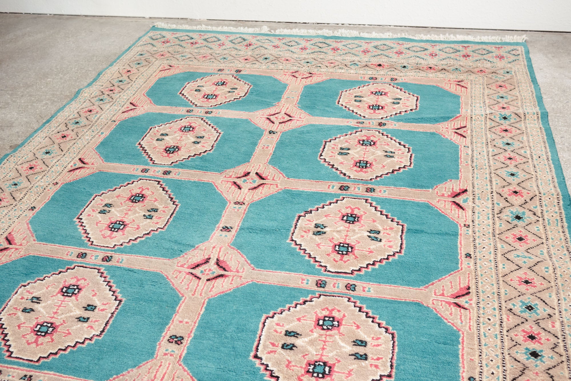 name: Jabranstyle: hand knotted, Pakistani, Peshawar, Bokhara, rug, carpetmaterial: woolcolors: teal, pink, black, cream, mauve, tanage: vintagecondition: good, age related wear - see pictures