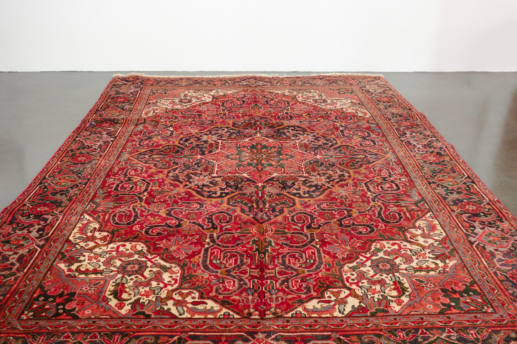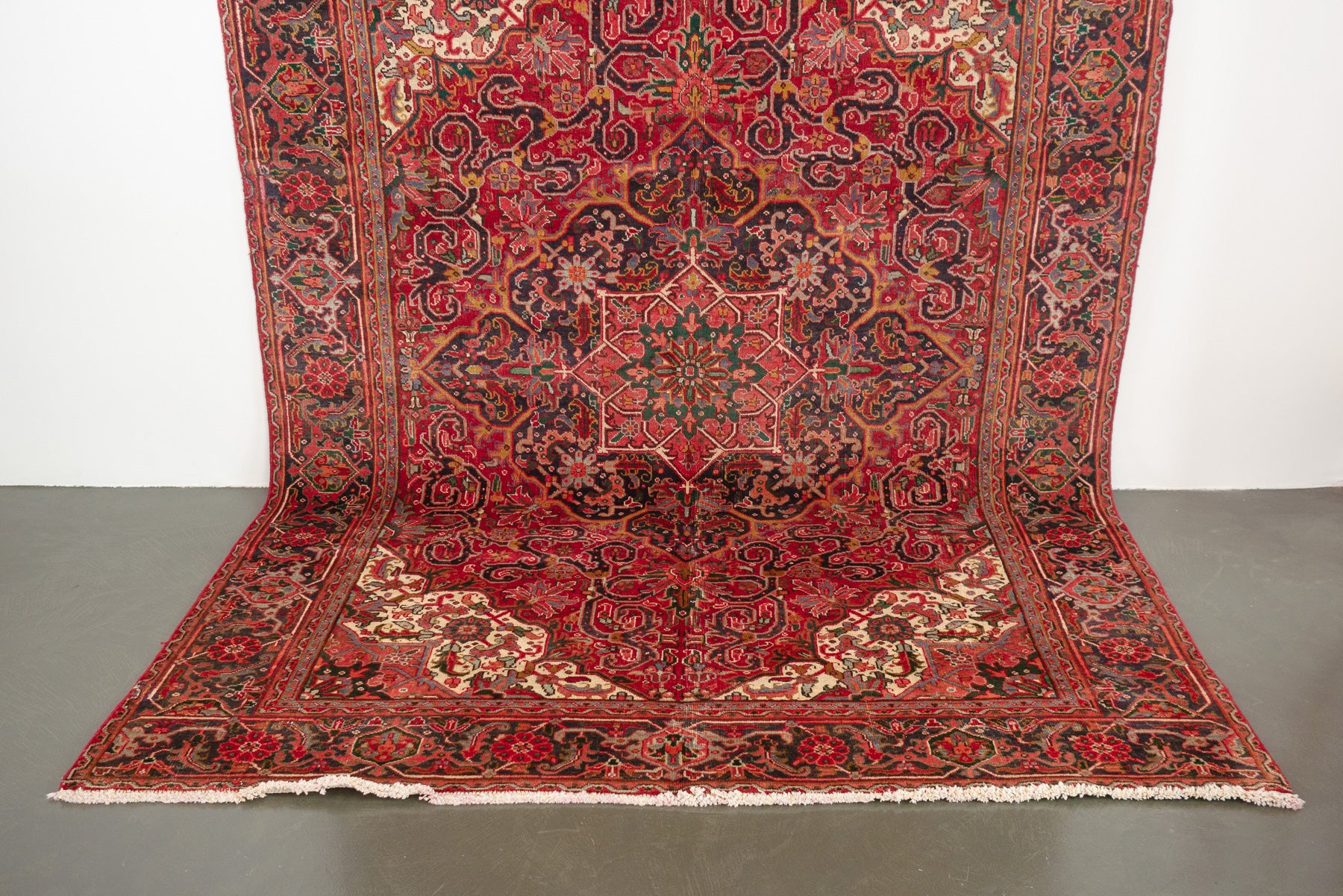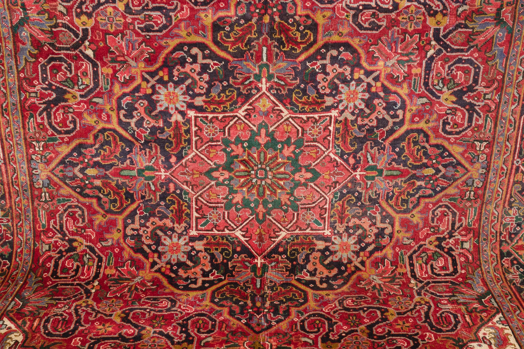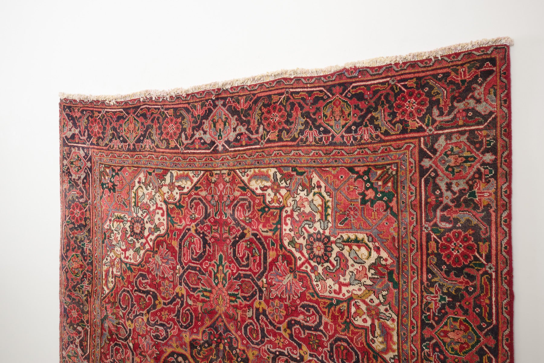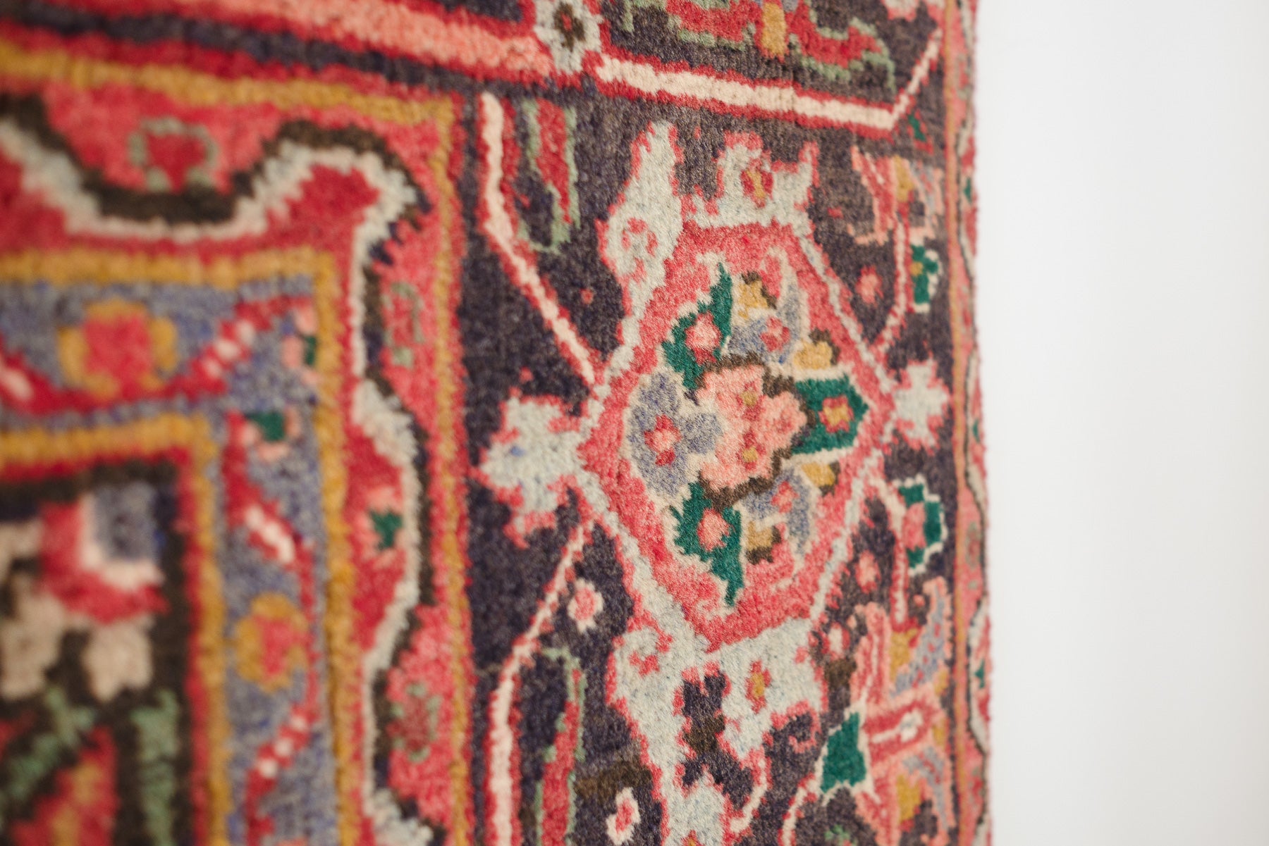 name: Zandorigin: Iran (Persian), Herizstyle: rug, carpetmaterial: hand knotted woolcolors: red, navy, pink, yellow, green, blues, cream, blackage: vintage, 1950-1960condition: good, age related wear - see picturesappraised value: $4,70090" x 126" (closest standard rug size is 7.5x10.5)Free domestic shipping on all rugs.Contact us for an international shipping quote.