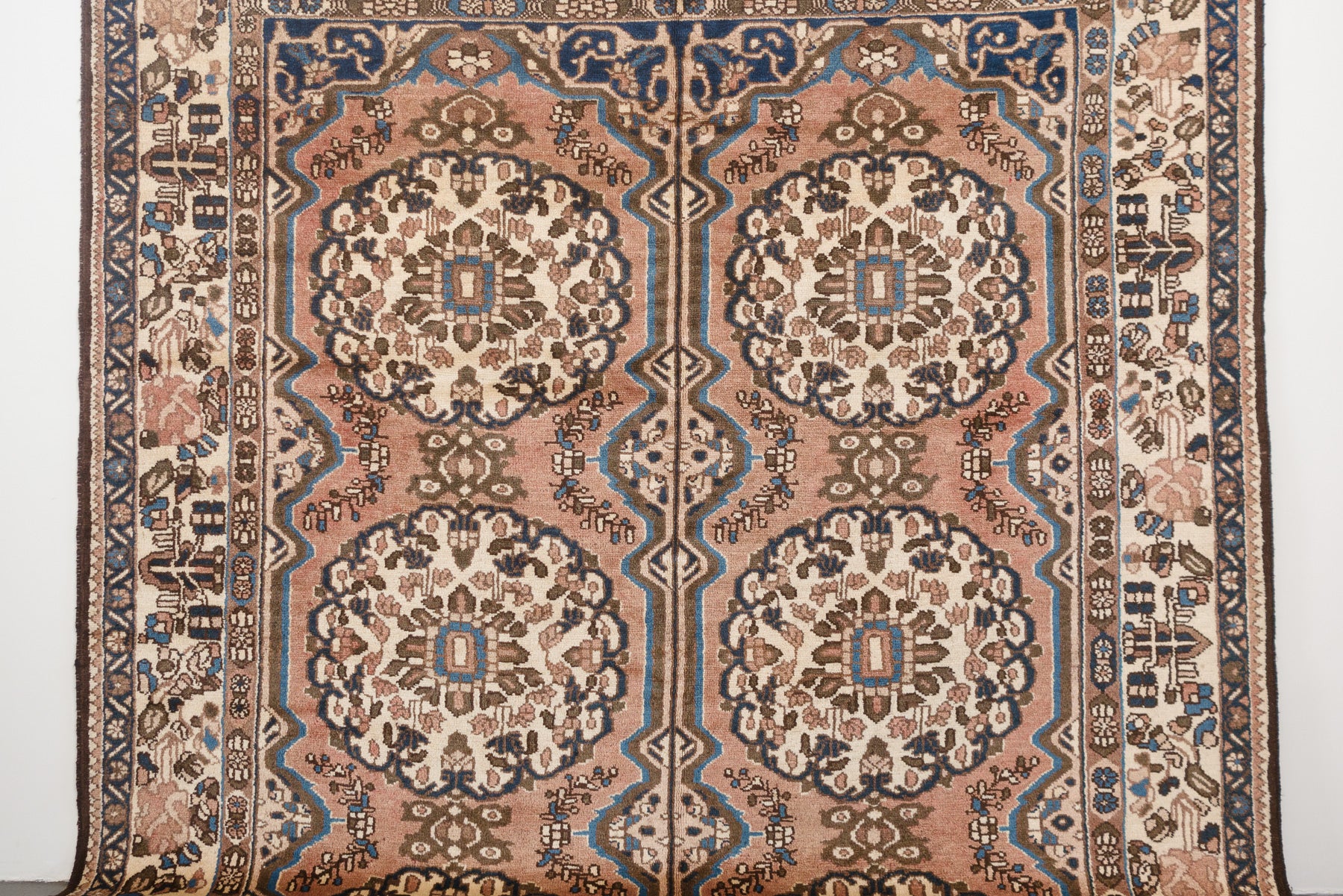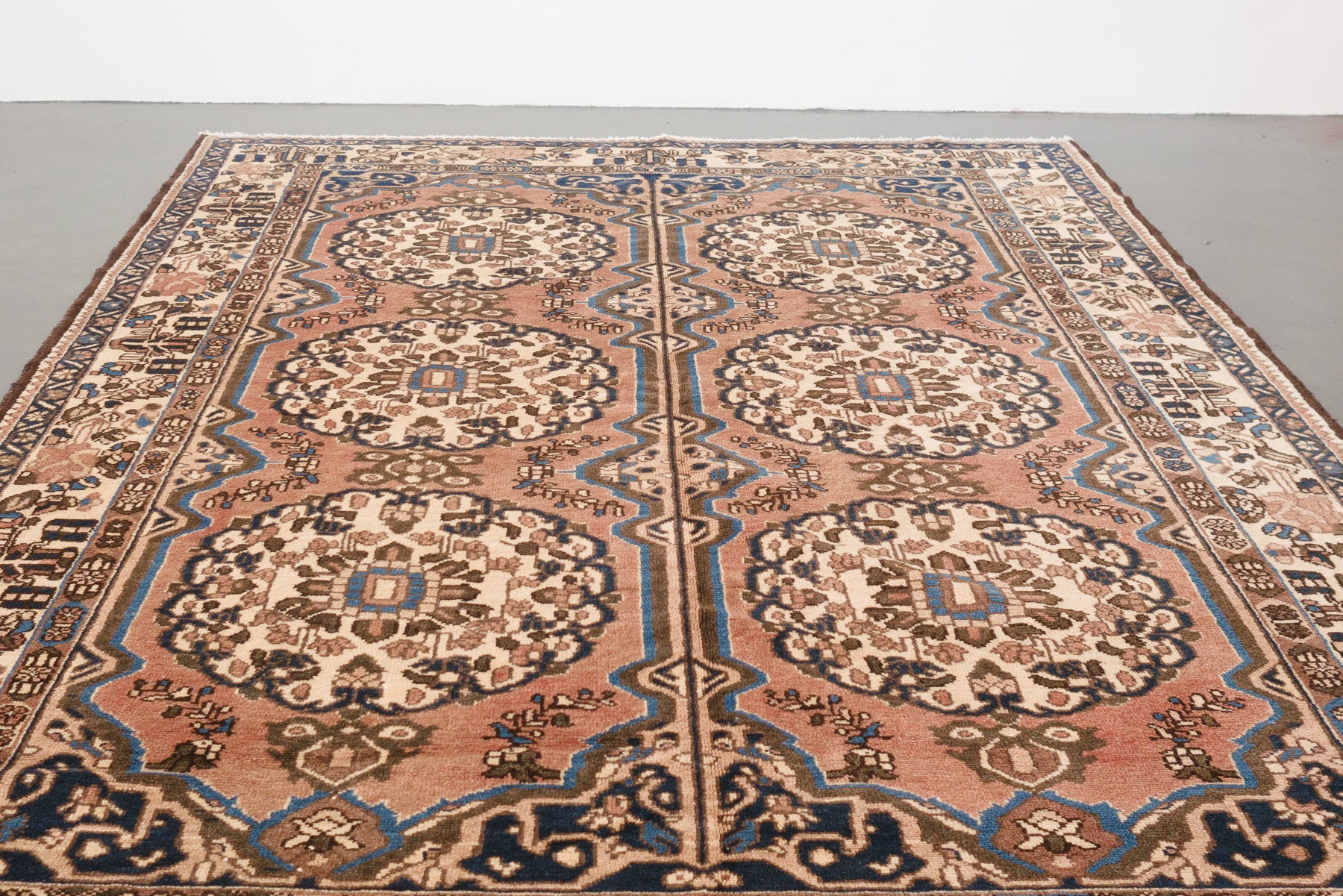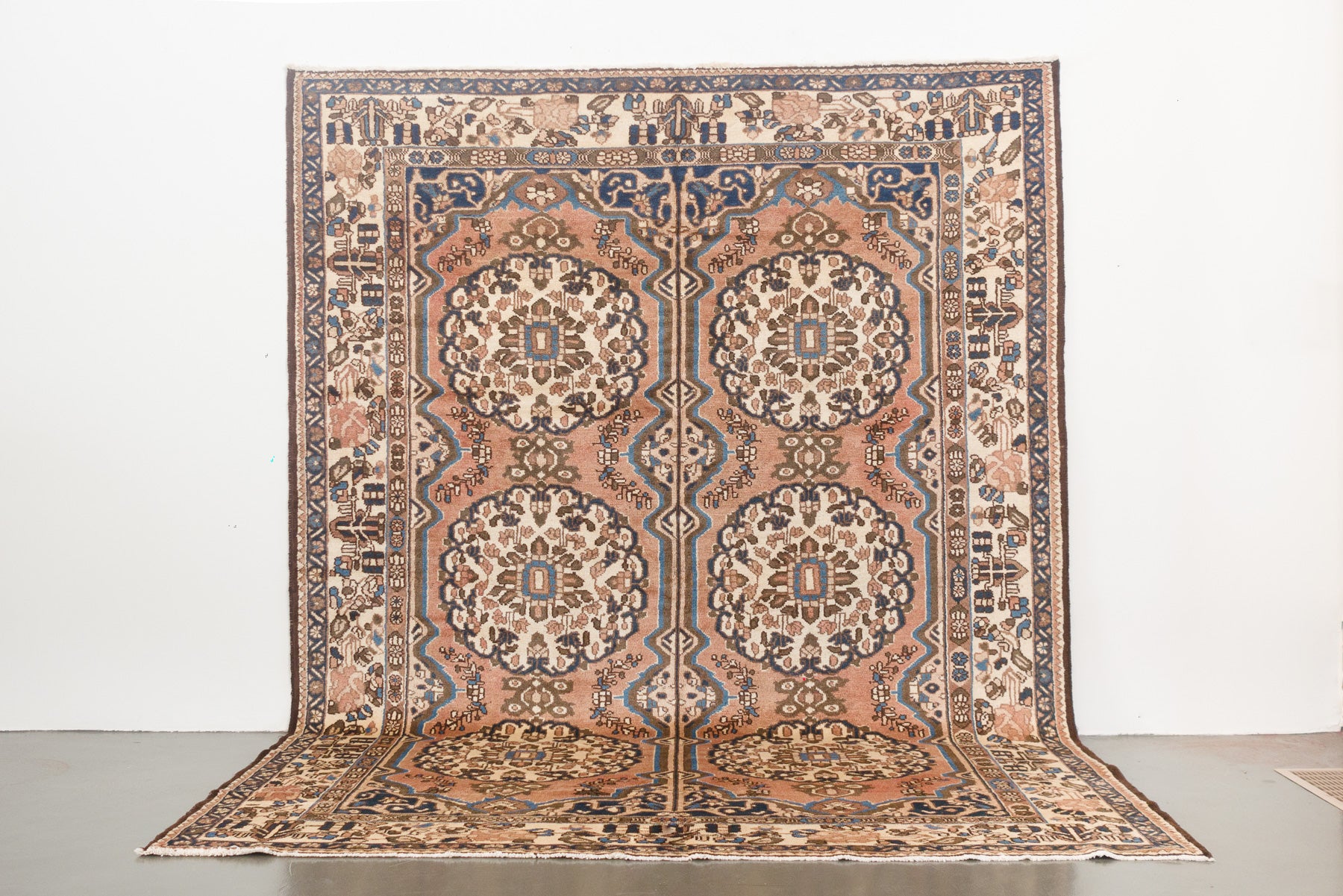 name: Zuraborigin: Iran (Persian), Bakhtiaristyle: rug, carpetmaterial: hand knotted woolcolors: browns, camel, tan, blues, navy, pink, green, gray, creamage: vintage, 1960-1970condition: good, age related wear - see picturesappraised value: $4,50089" x 120"(closest standard rug size is 7.5x10)Free domestic shipping on all rugs.Contact us for an international shipping quote.