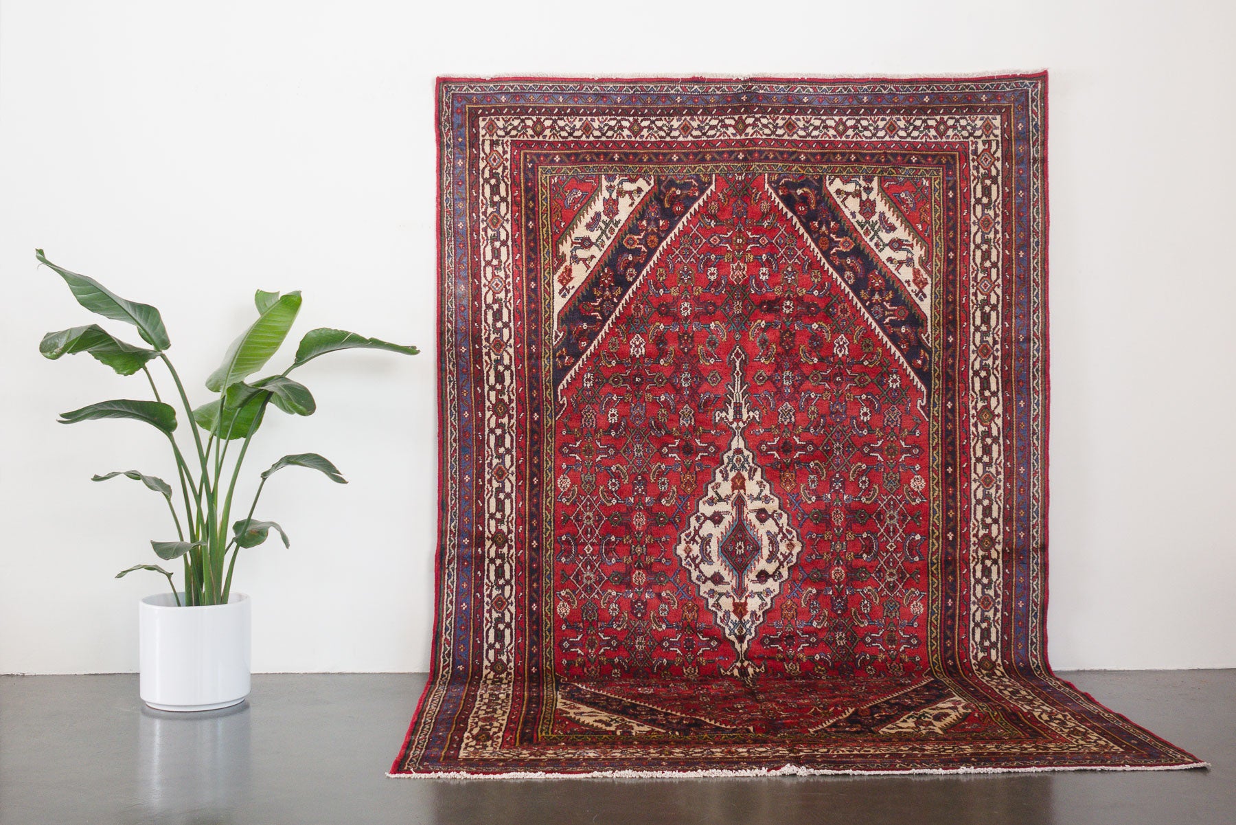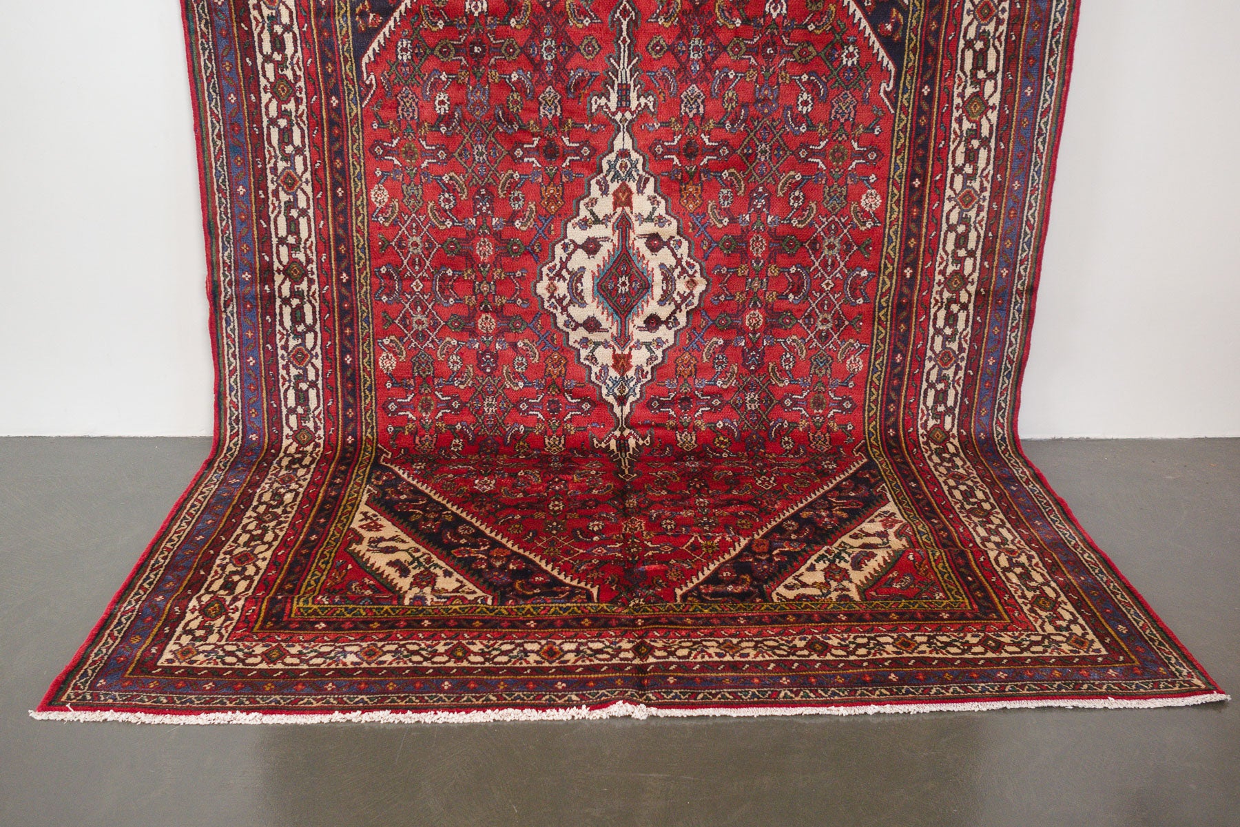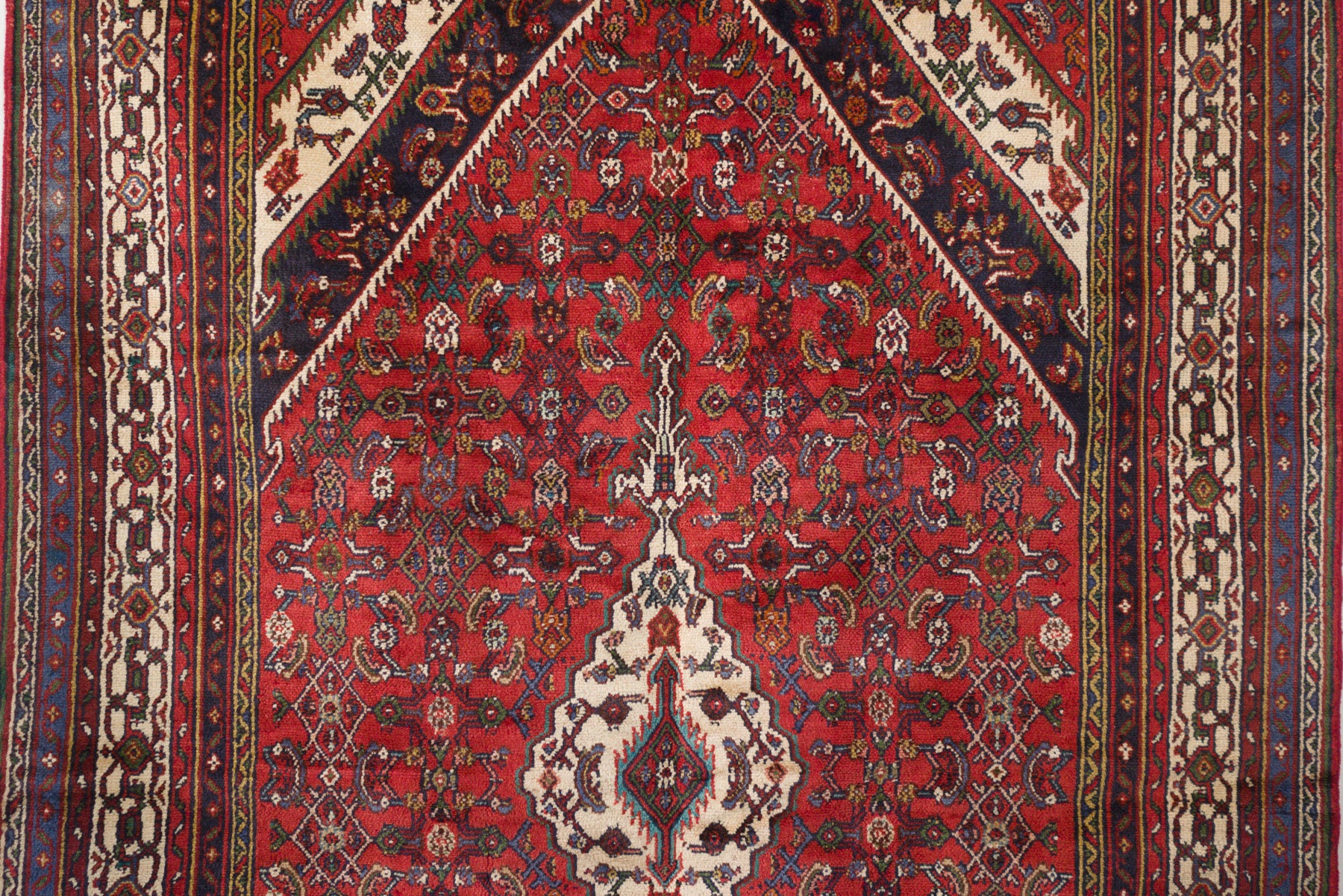name: Shahparorigin: Iran (Persian), Bayakstyle: rug, carpetmaterial: hand knotted woolcolors: red, navy, cream, pinks, gold, greens, browns, bluesage: vintage, 1940-1970condition: good, age related wear - see picturesappraised value: $3,160