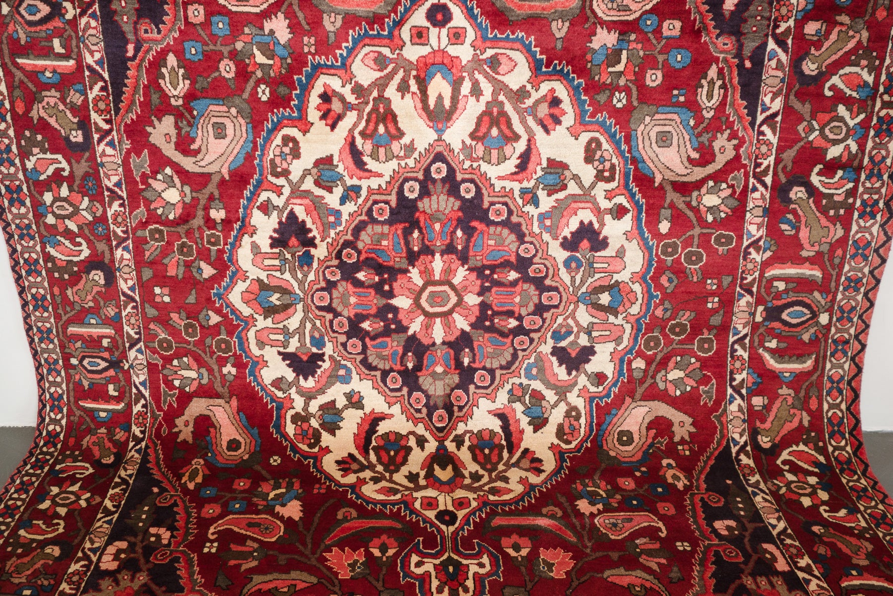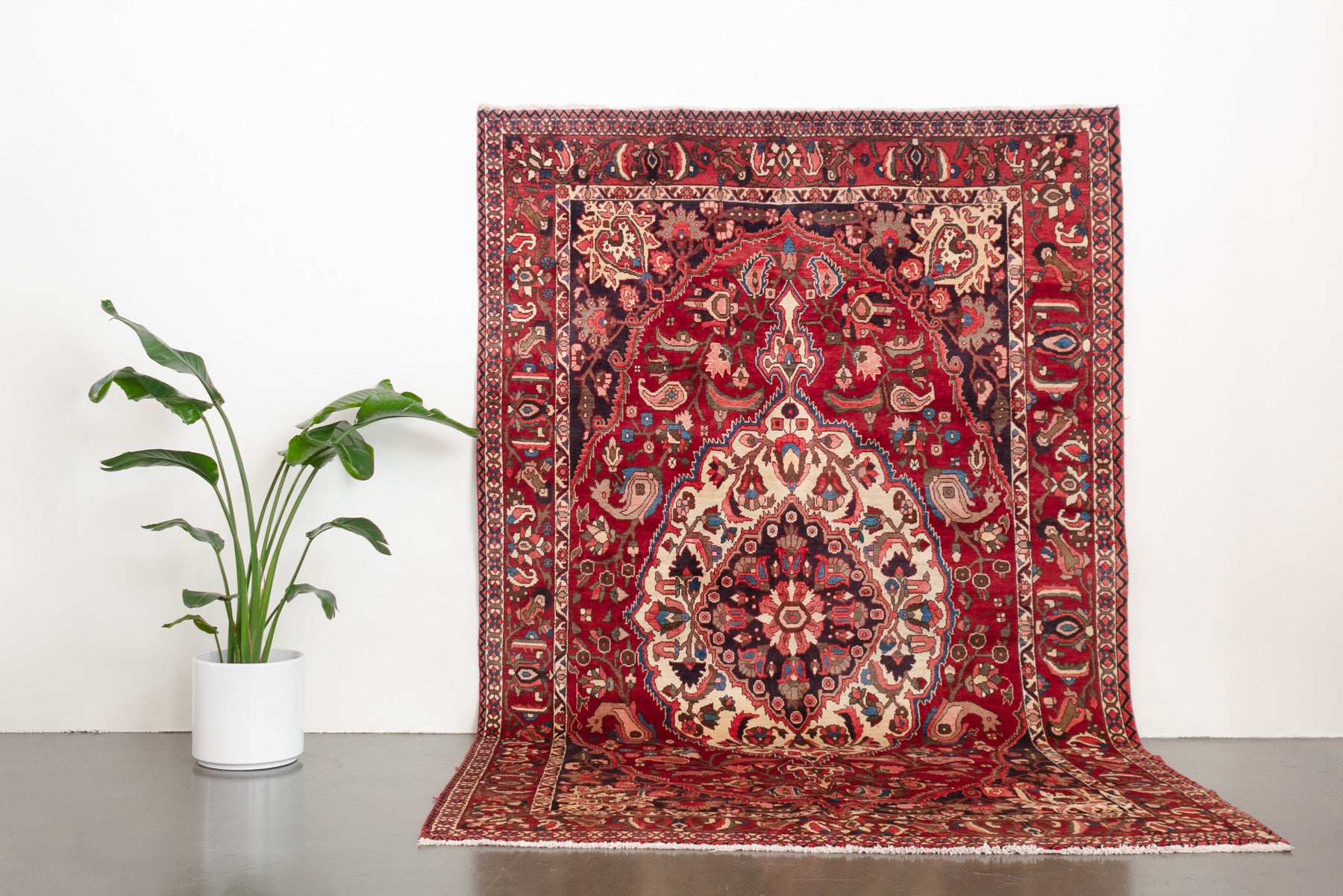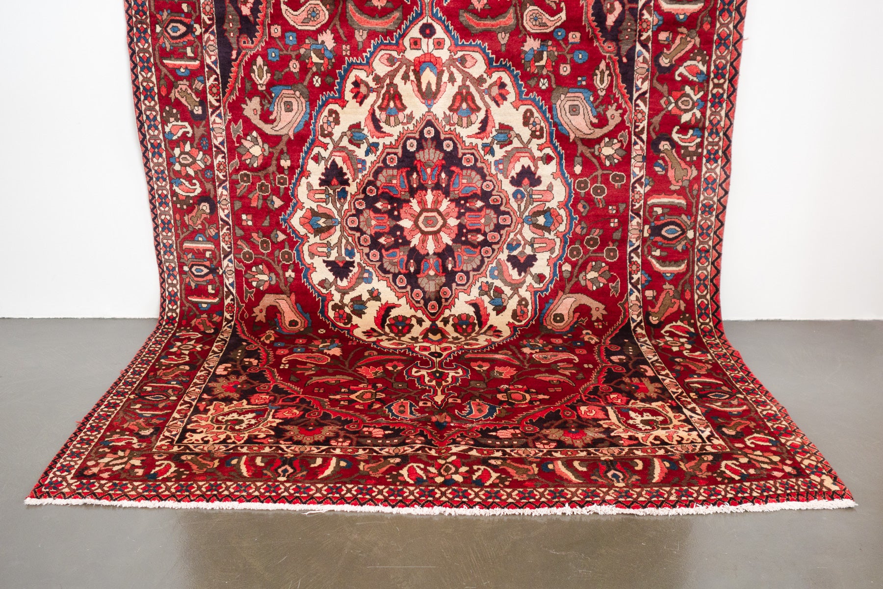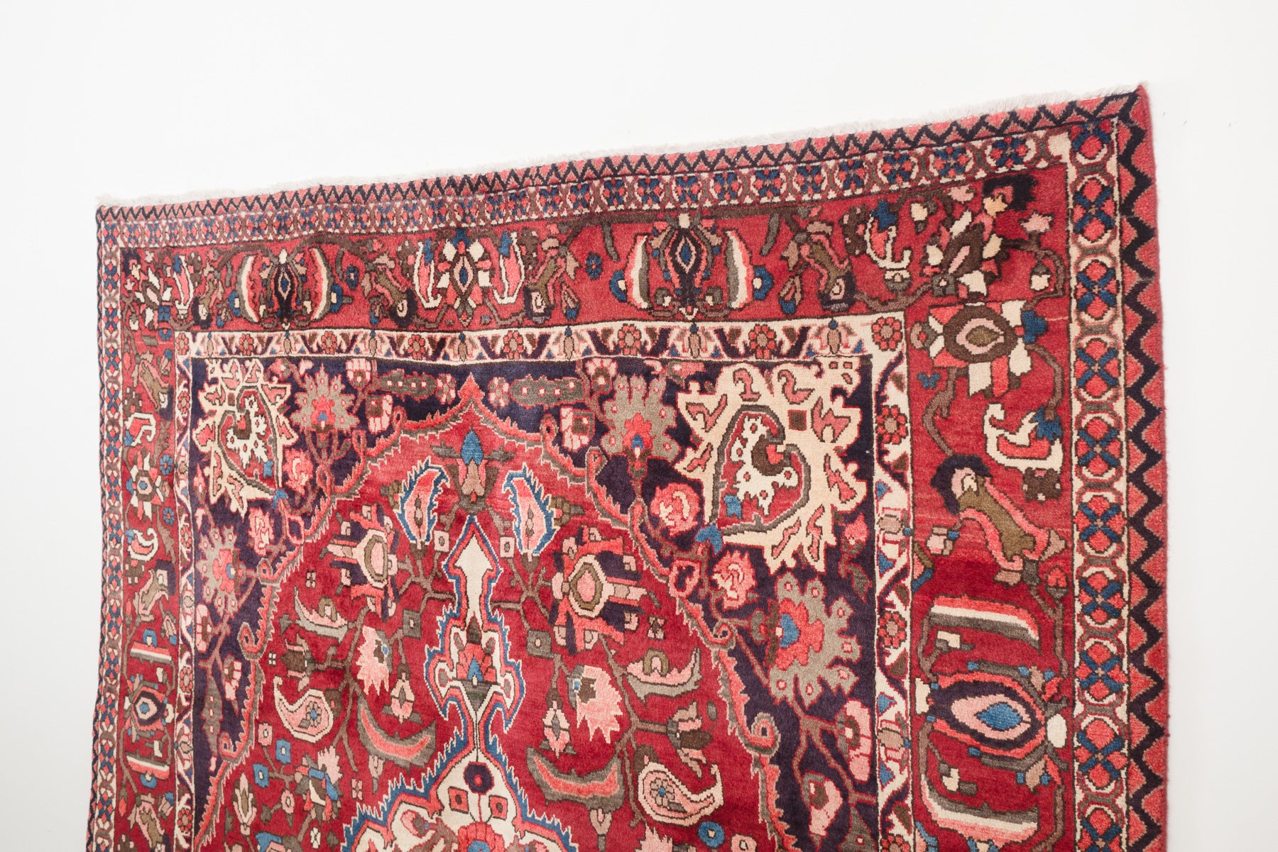 name: Idinorigin: Iran (Persian), Bakhtiaristyle: rug, carpetmaterial: hand knotted woolcolors: reds, pink, blues, navy, orange, browns, black, creamage: vintage, 1950-1960condition: good, age related wear - see picturesappraised value: $4,50081" x 128"(closest standard rug size is 7x11)Free domestic shipping on all rugs.Contact us for an international shipping quote.