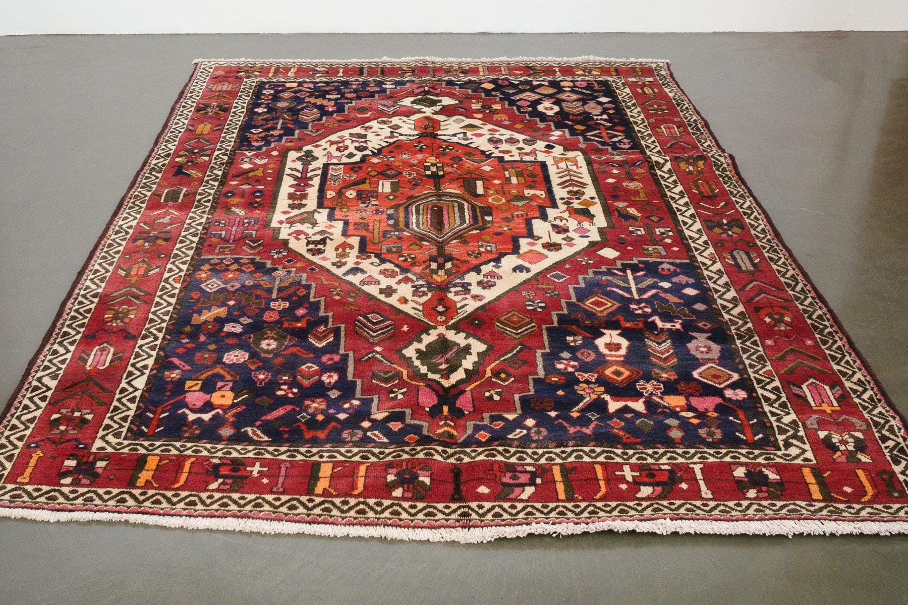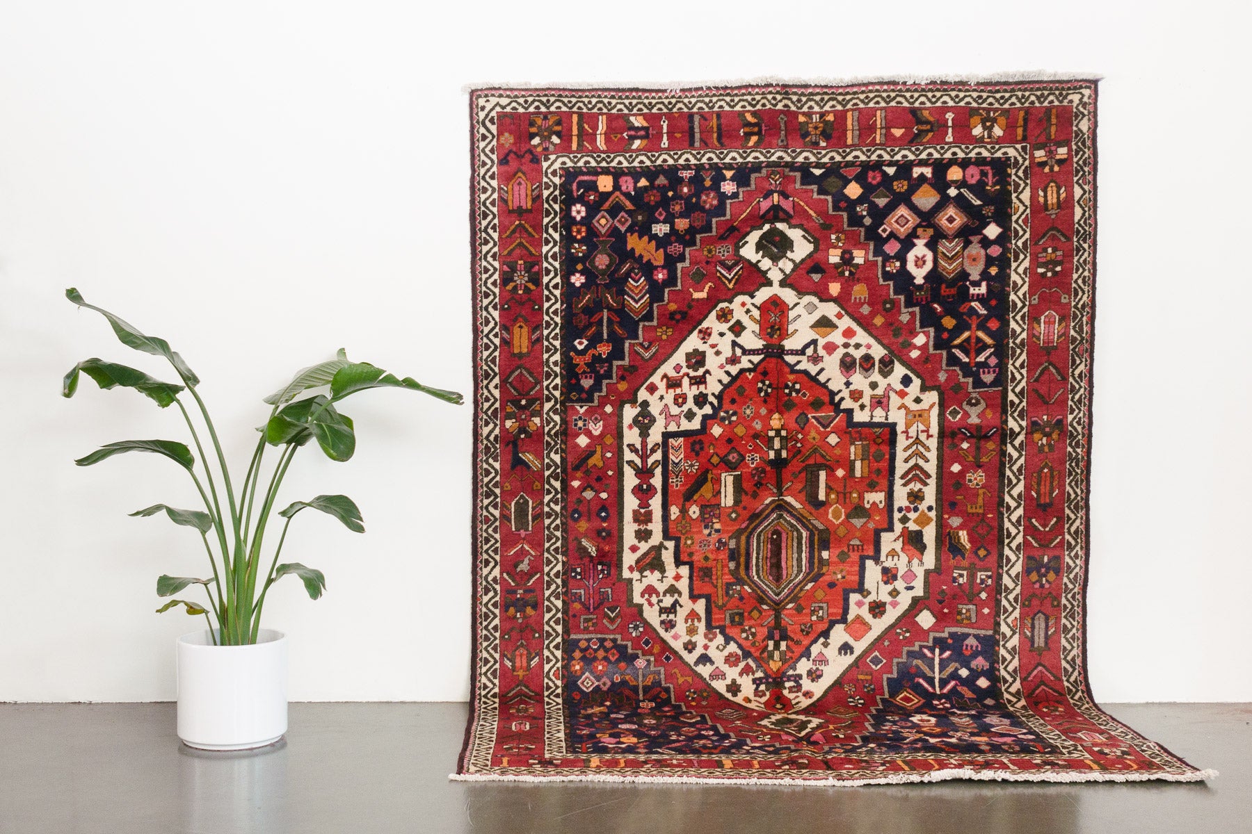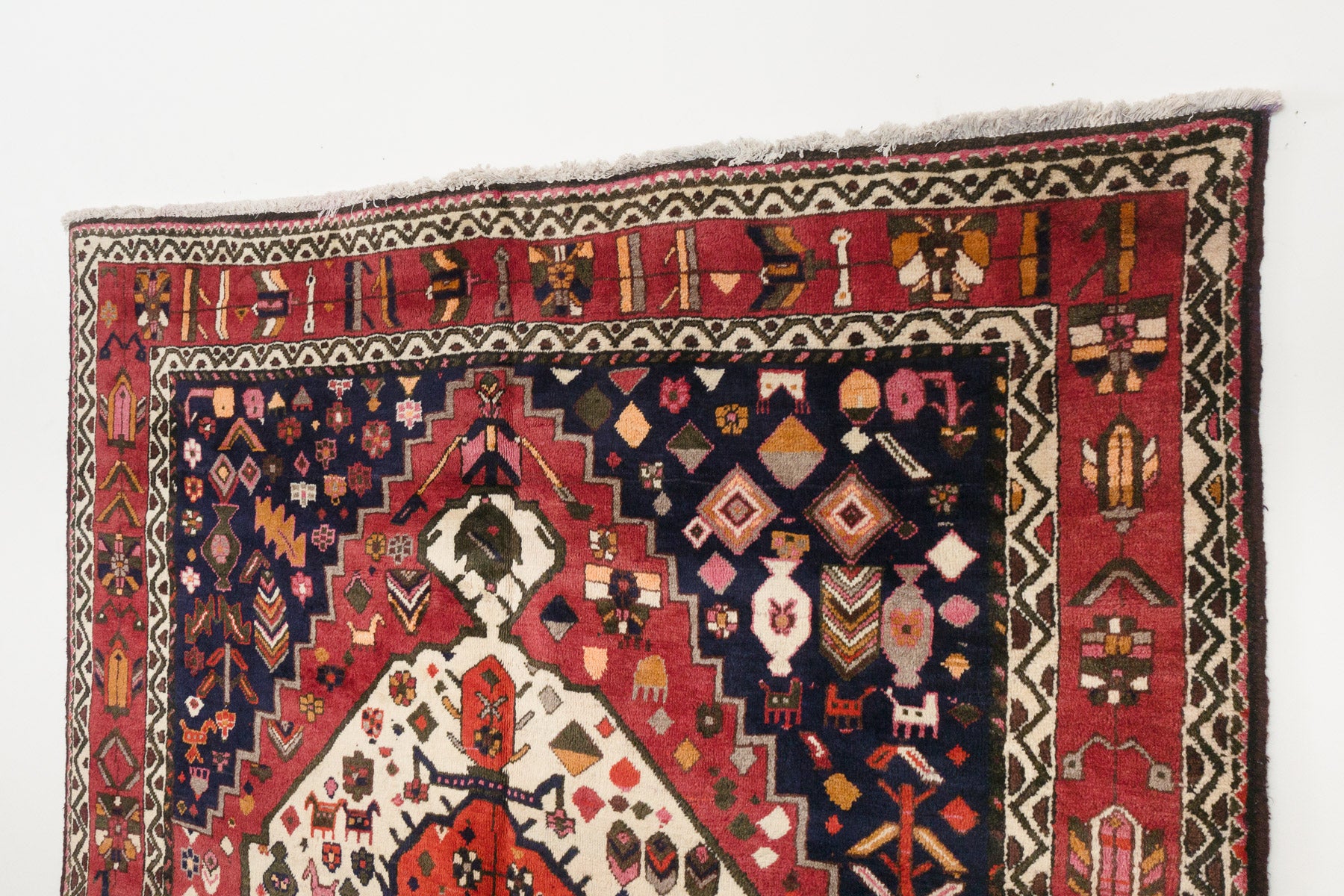 name: Afrandorigin: Iran (Persian), Baktiaristyle: rug, carpetmaterial: hand knotted woolcolors: red, black, blue, orange, yellow, greens, pink, gray, creamage: vintagecondition: good, age related wear - see picturesappraised value: $3,500