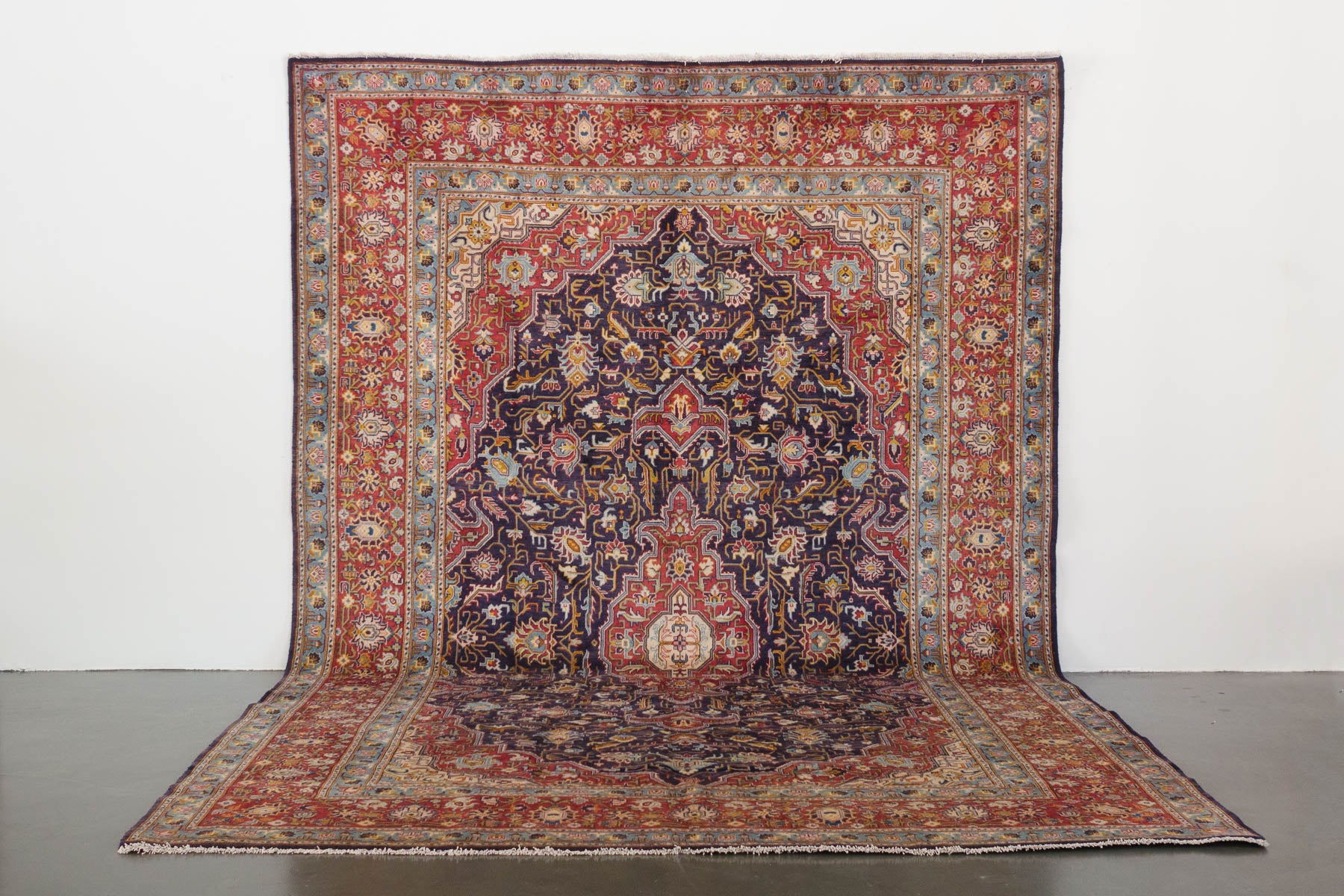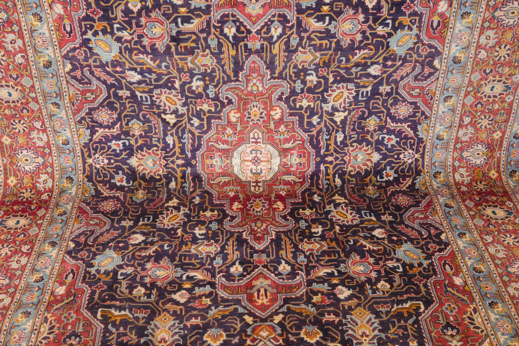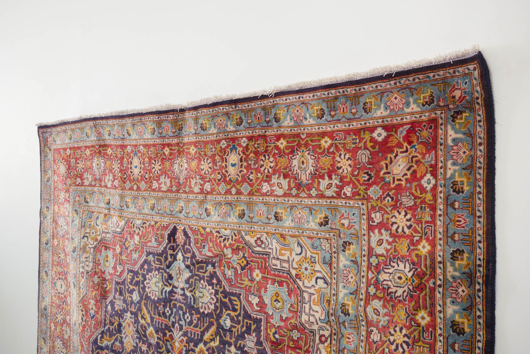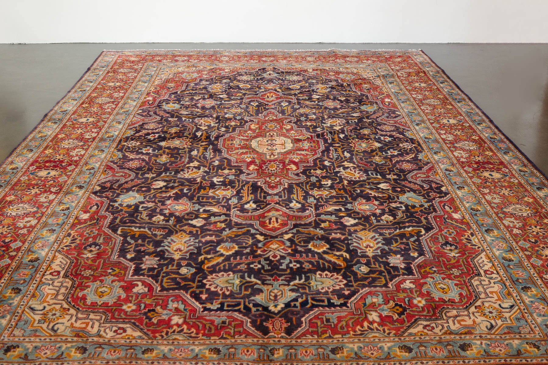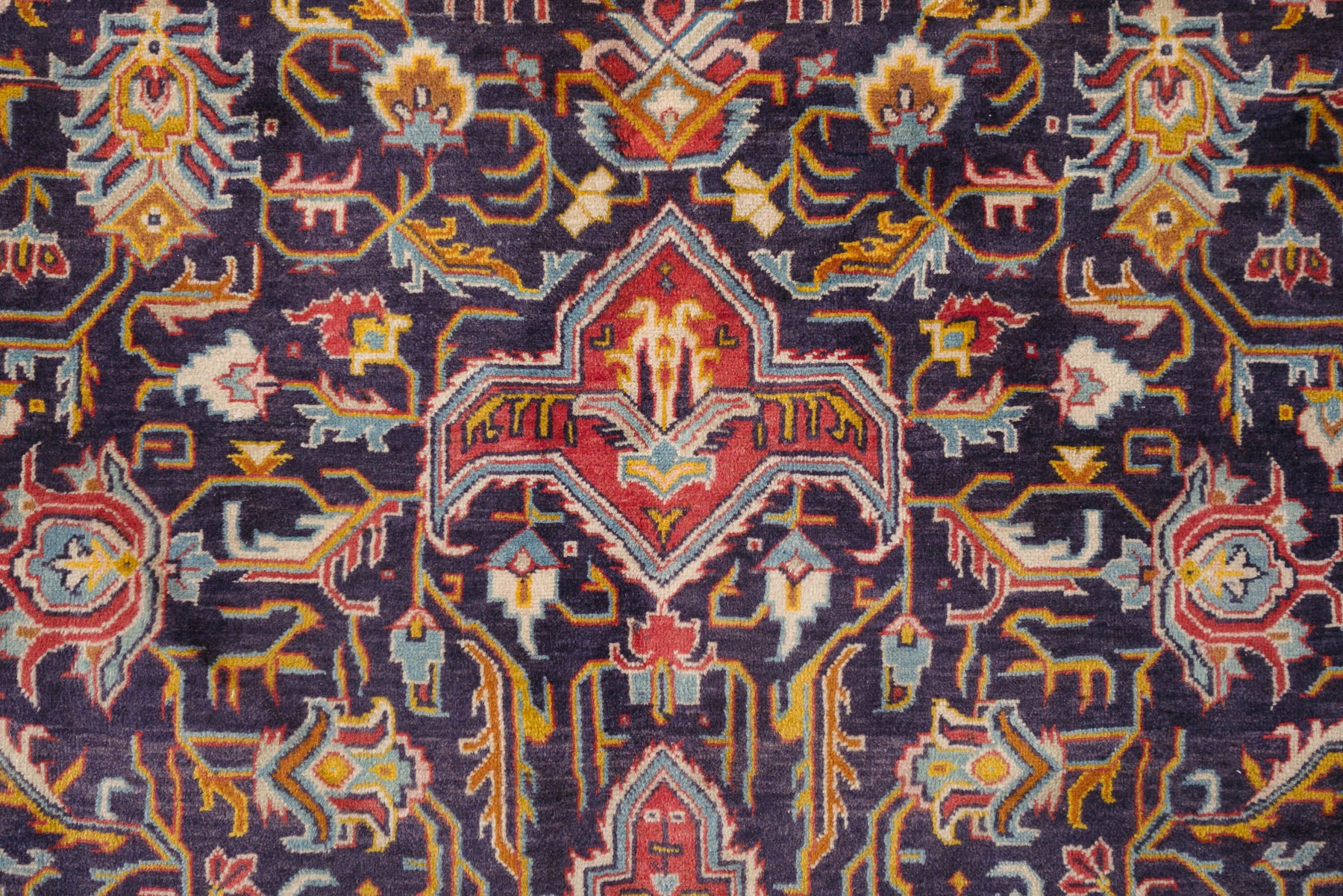 name: Sattarstyle: hand knotted, Persian, Bayak, rug, carpetmaterial: woolcolors: navy, reds, cream, yellow, orange, browns, blackage: vintage condition: good, age related wear - see pictures96" x 147" (closest standard rug size is 8x12)Free domestic shipping on all rugs.Contact us for an international shipping quote.