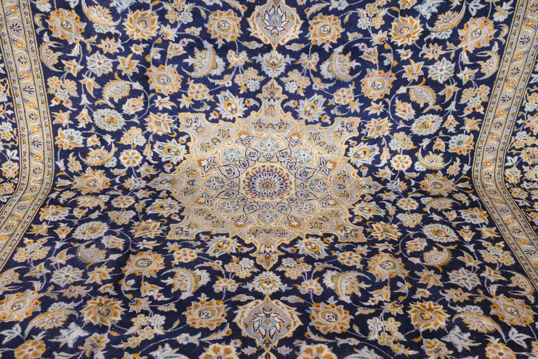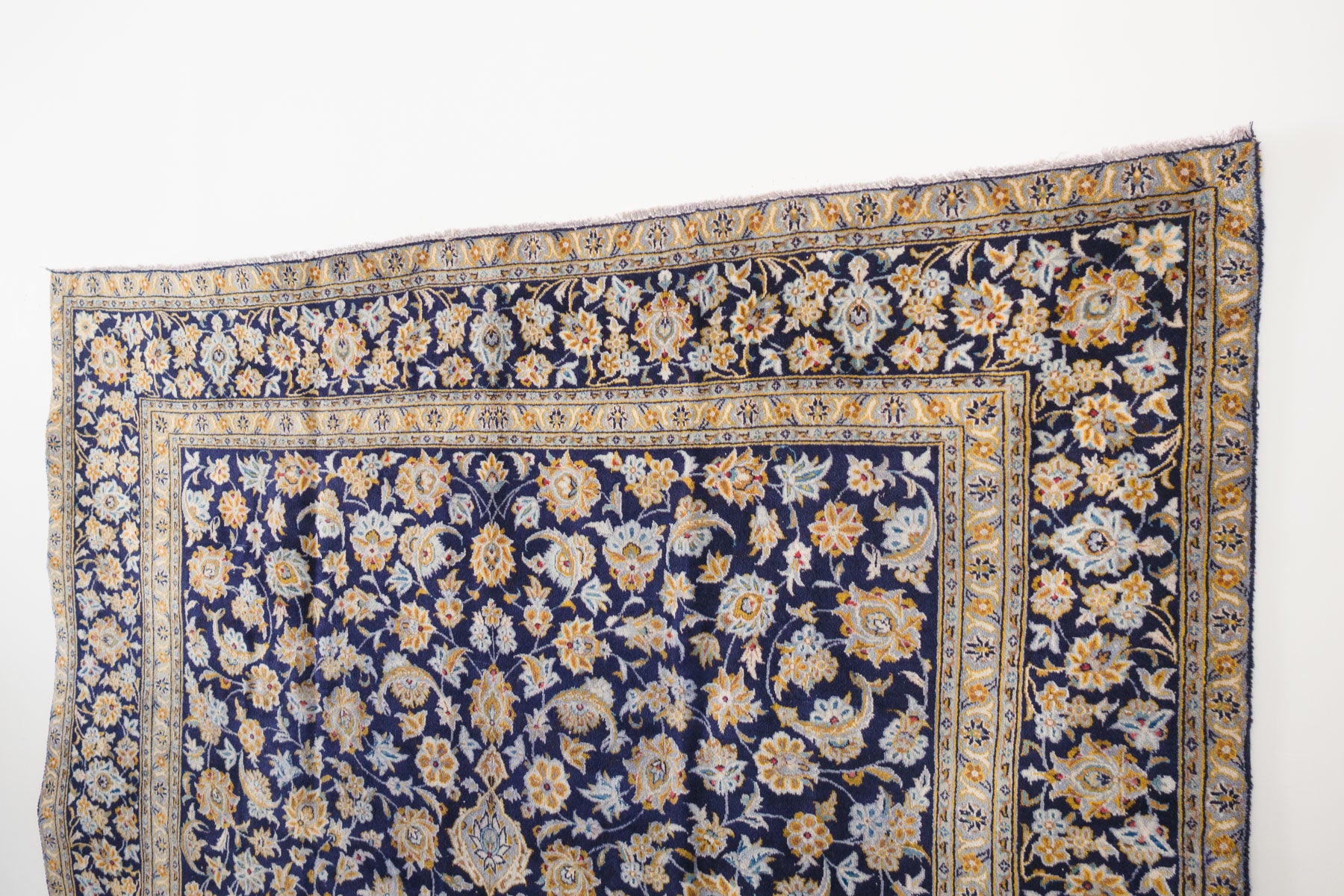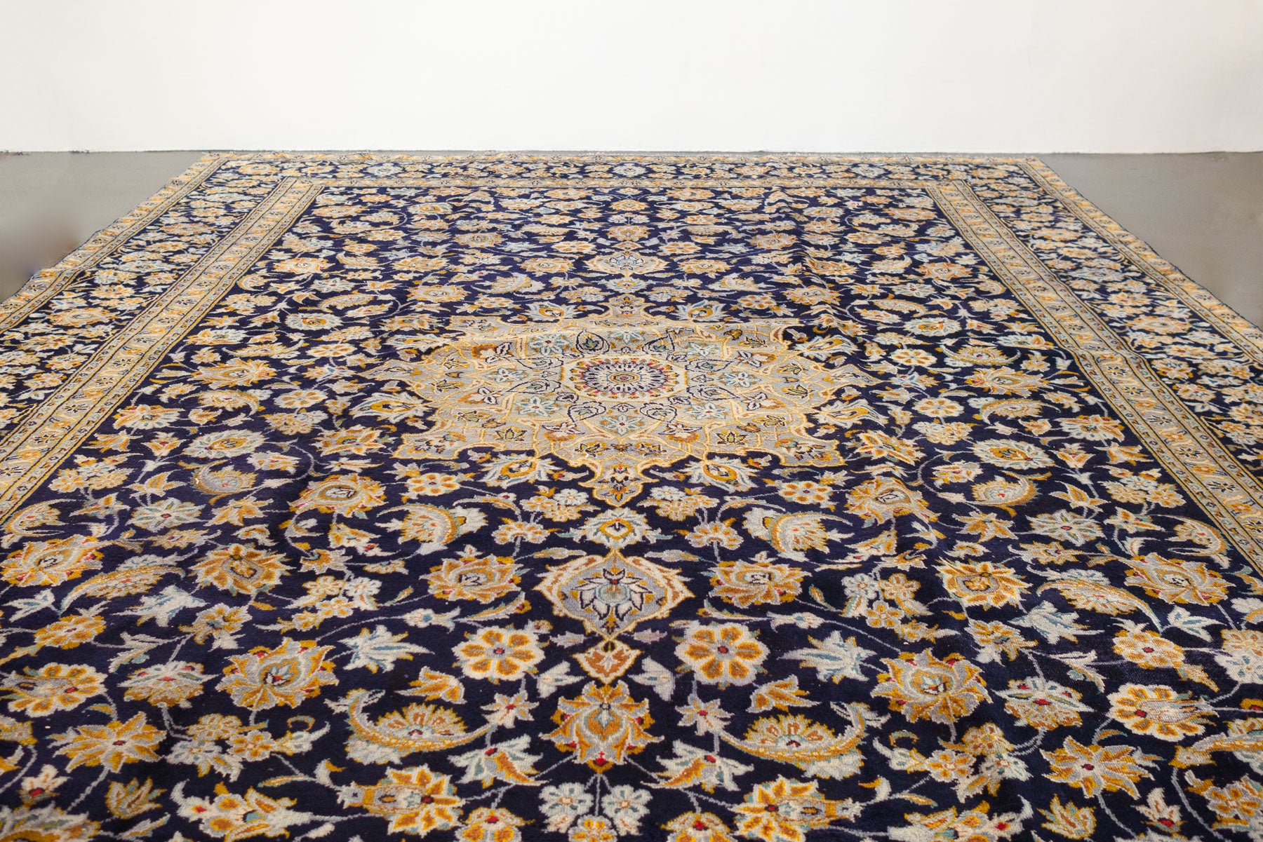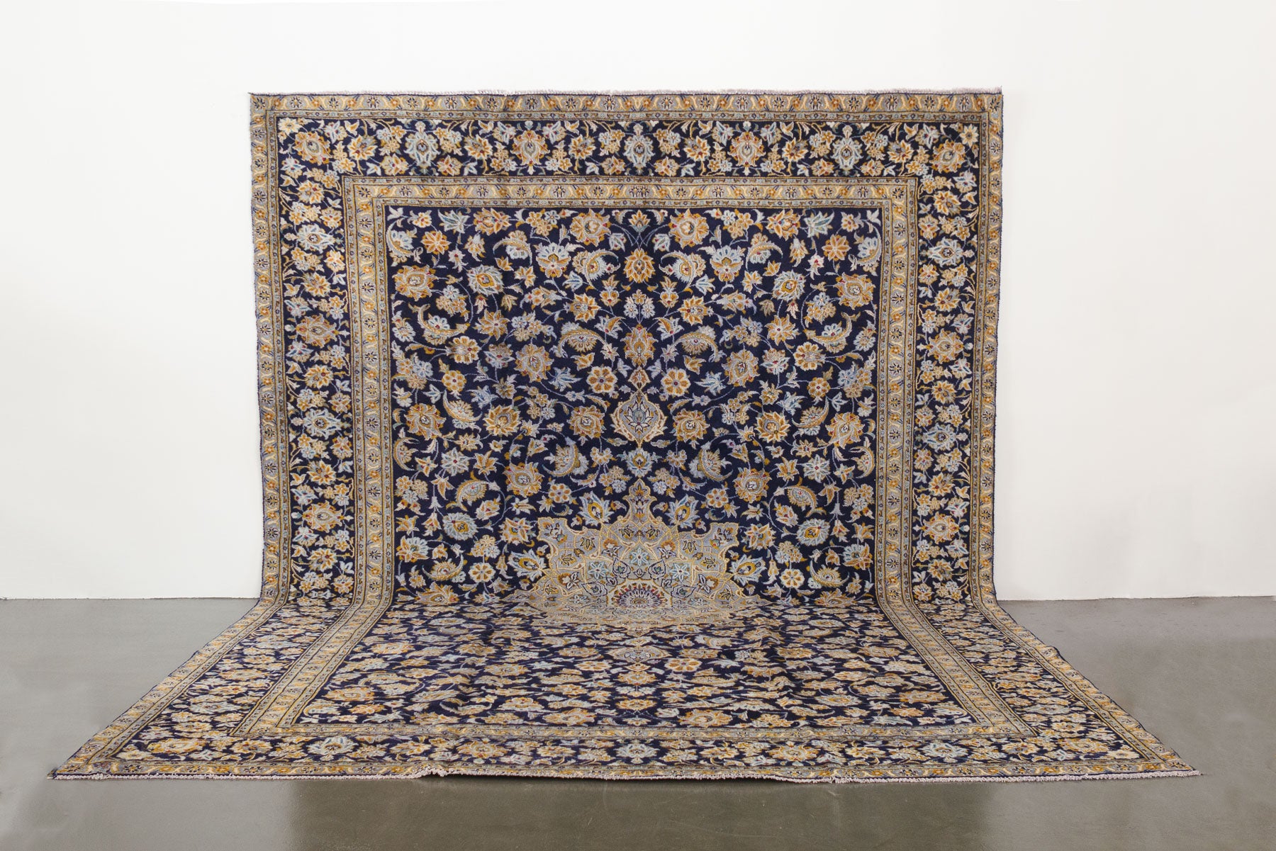 name: Nikaorigin: Iran (Persian)style: rug, carpetmaterial: hand knotted woolcolors: navy, blues, gray, yellows, redage: vintage condition: good, age related wear - see pictures115" x 156" (closest standard rug size is 9.5x13)Free domestic shipping on all rugs.Contact us for an international shipping quote.