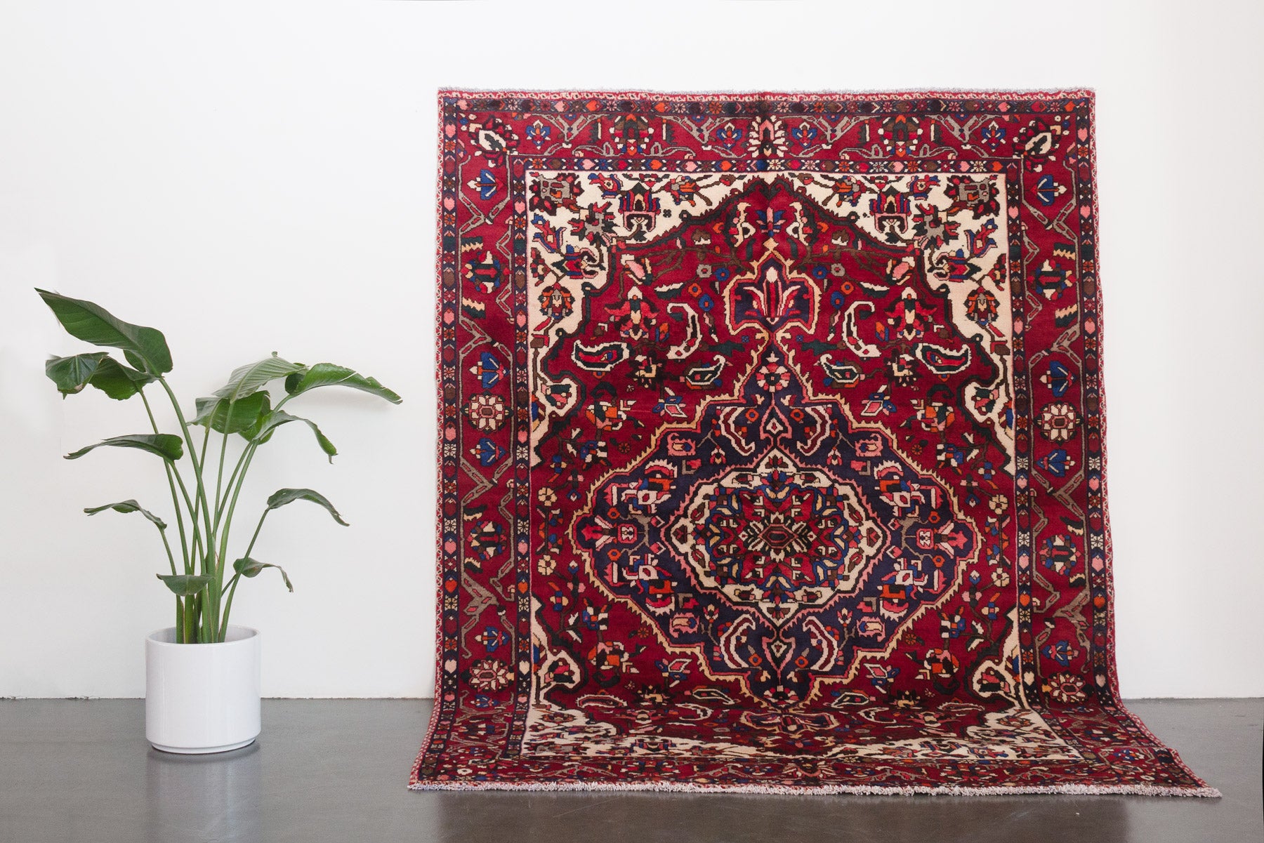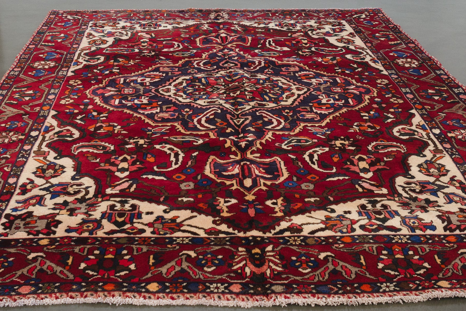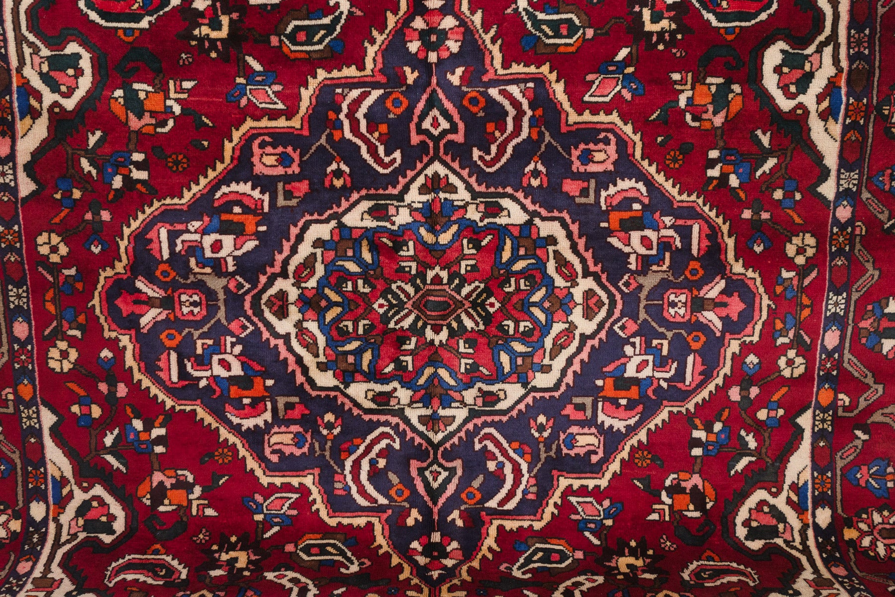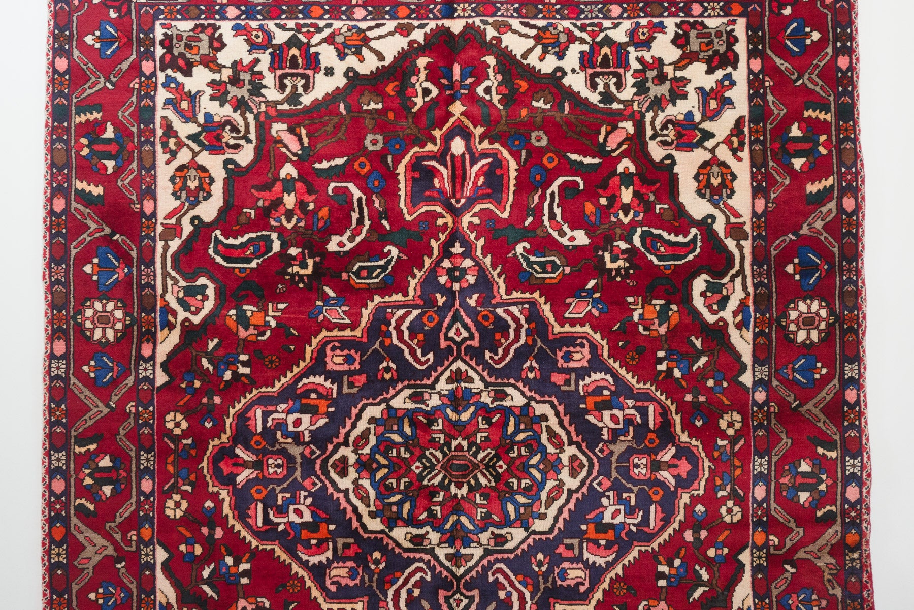 name: Dadmehrorigin: Iran (Persian), Bakhtiaristyle: rug, carpetmaterial: hand knotted woolcolors: red, blues, navy, pink, brown, orange, black, creamage: vintagecondition: good, age related wear - see picturesappraised value: $5000