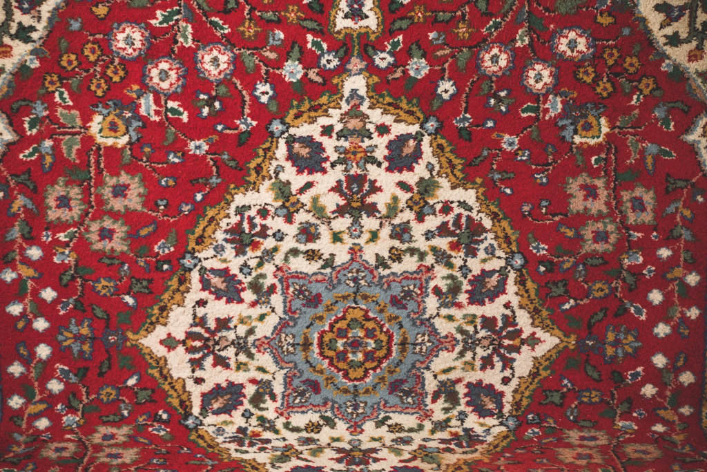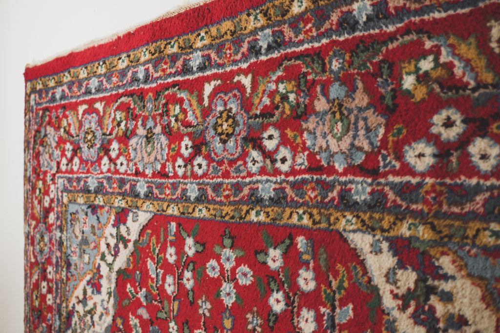 This vintage Persian Isfahan style handwoven wool rug has a red base with shades of blue, brown, green and cream accents. It's in good overall shape with age related wear including a low pile spot and a hole. See pictures for detailed condition.