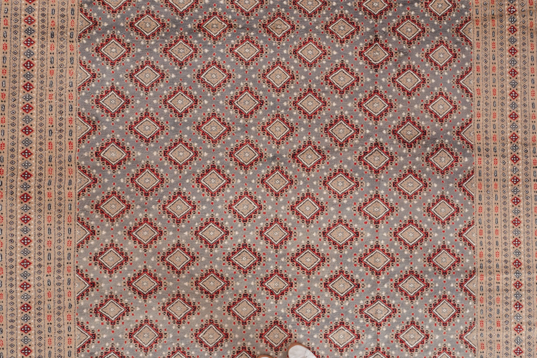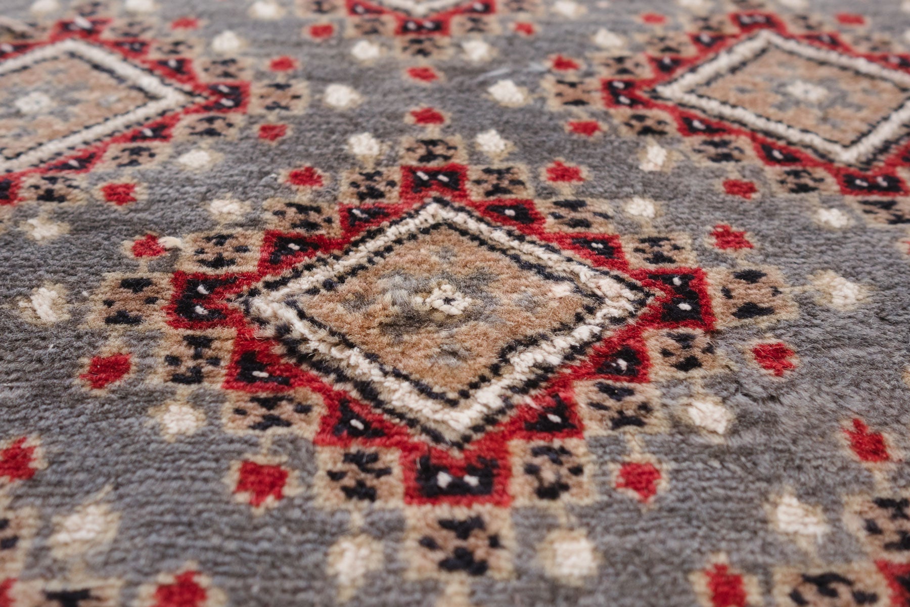 name: Dafiya style: hand knotted, Pakistani, Peshawar, Bokhara, rug, carpet material: wool colors:raspberry, grey, cream, mauve, black age: new condition: good, age related wear - see pictures