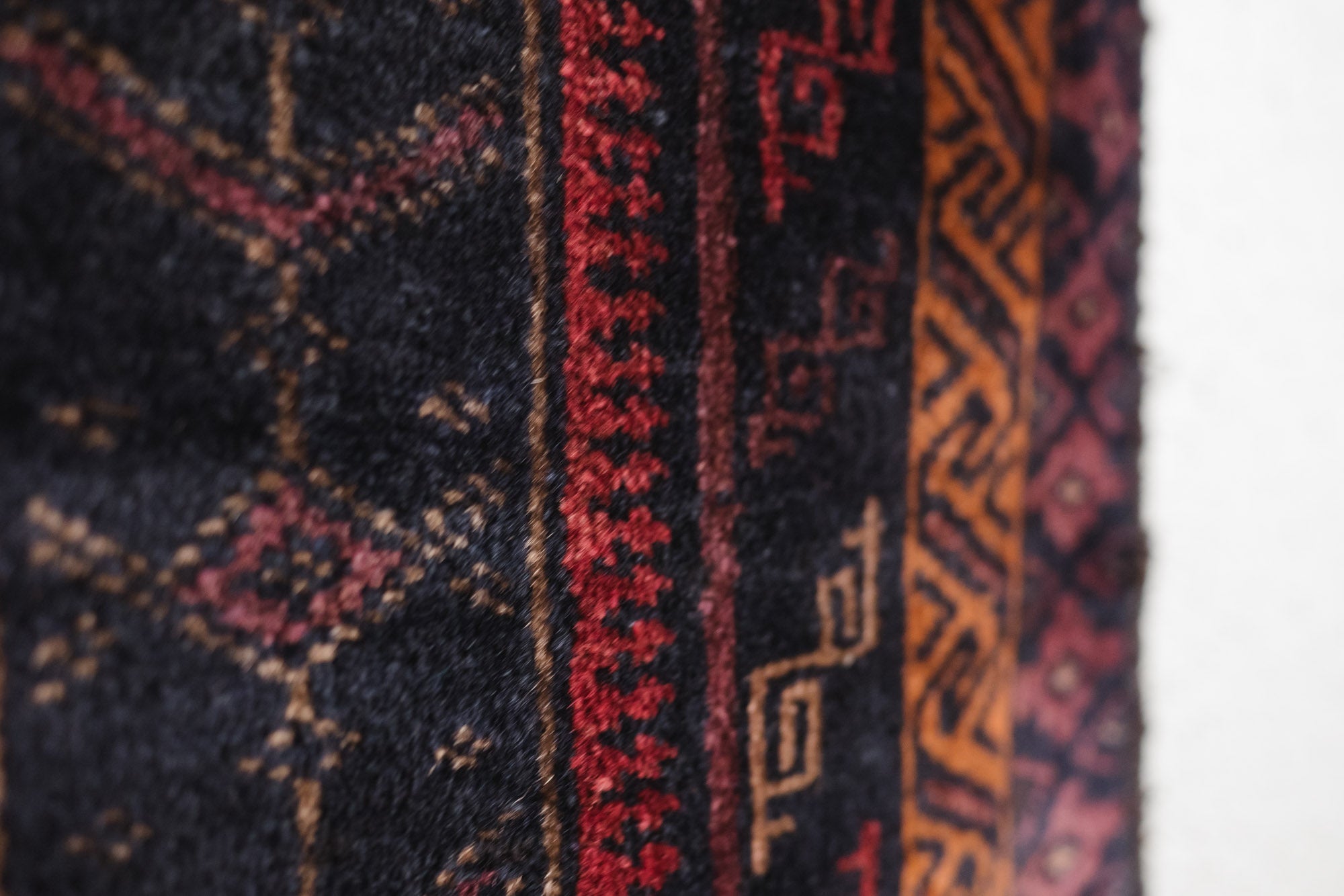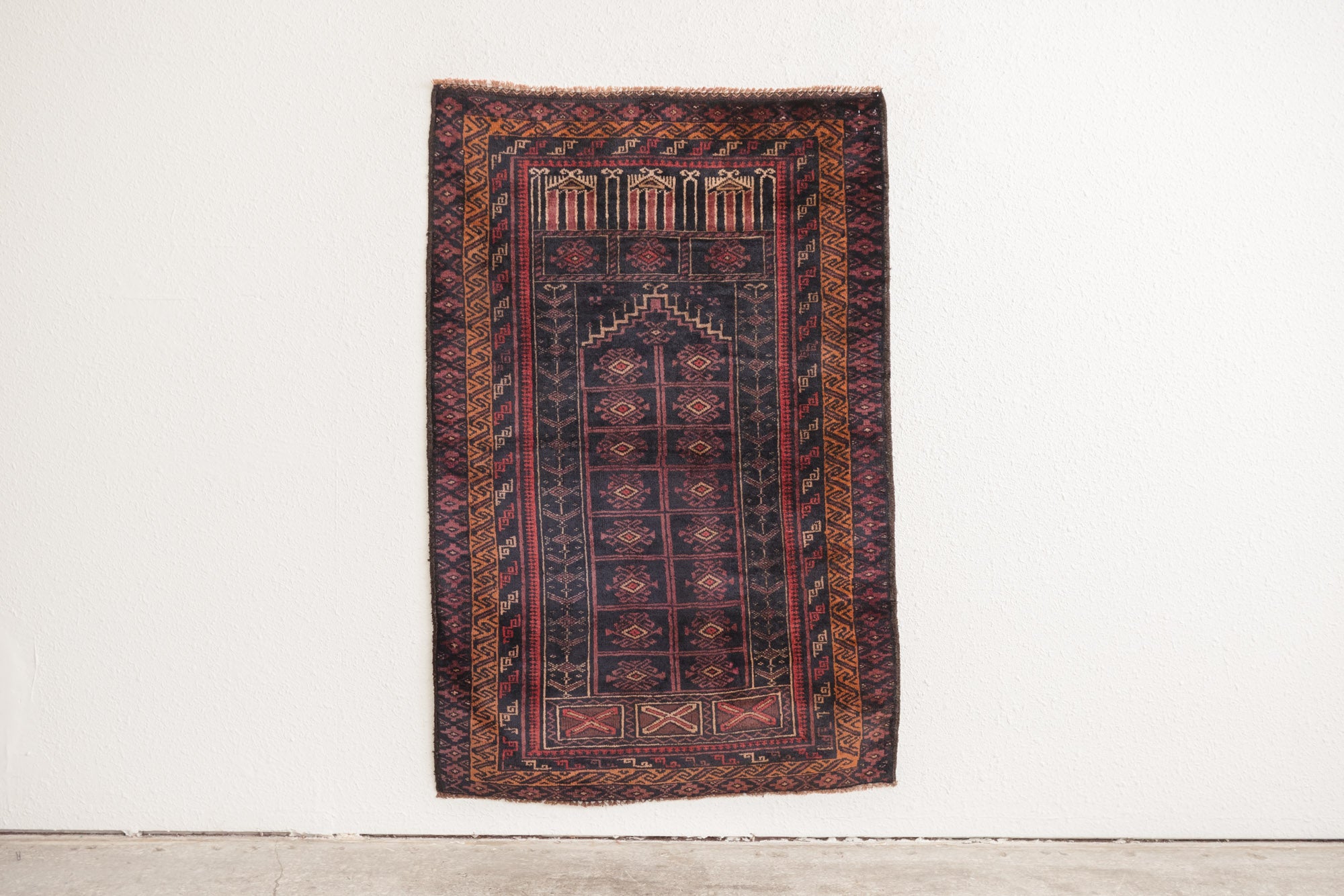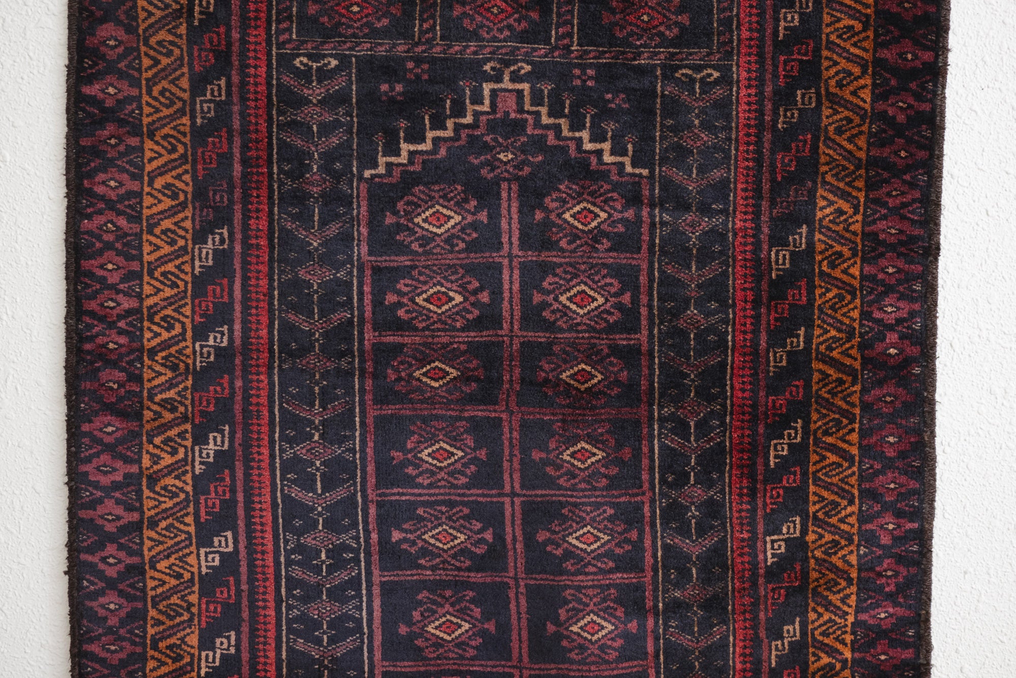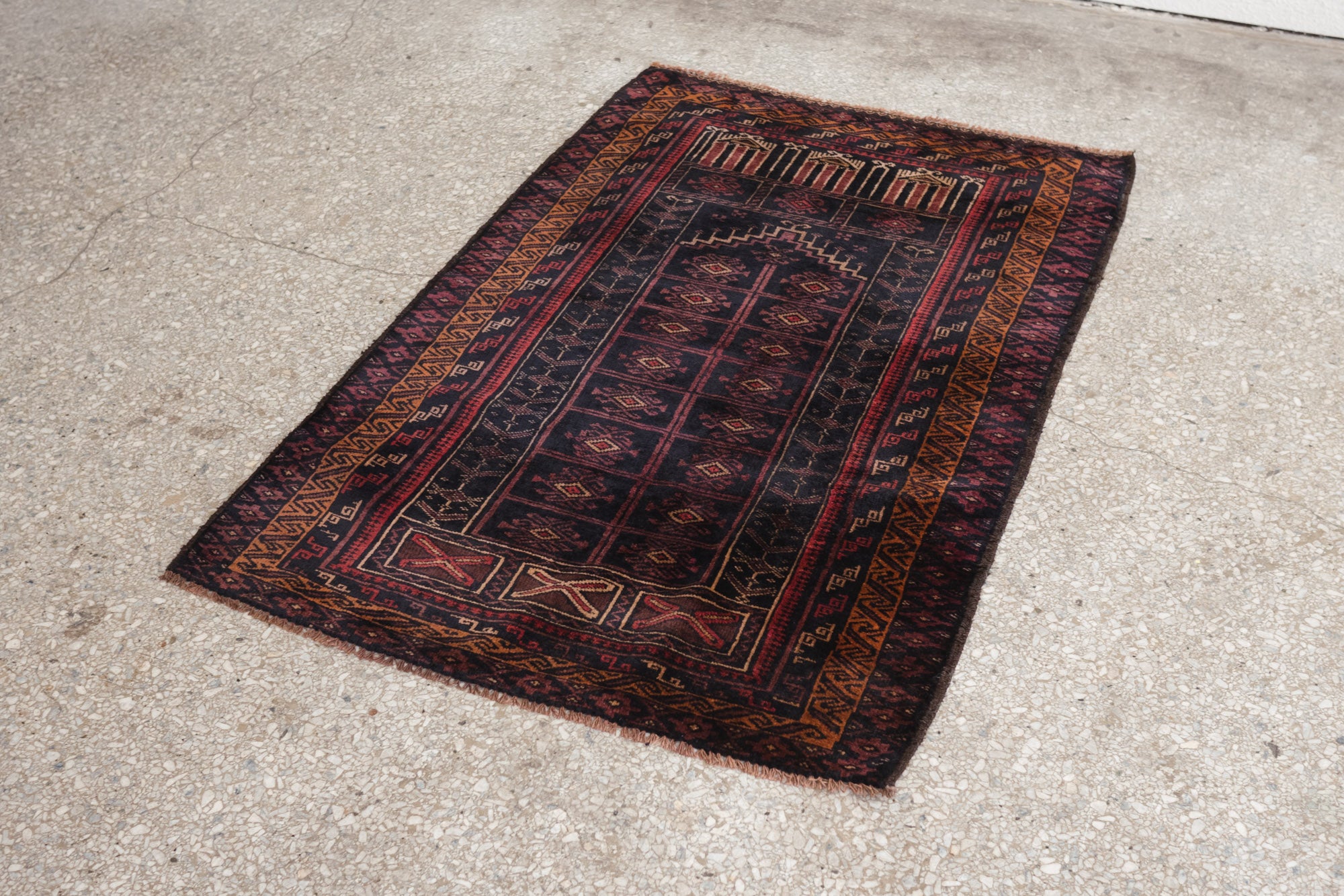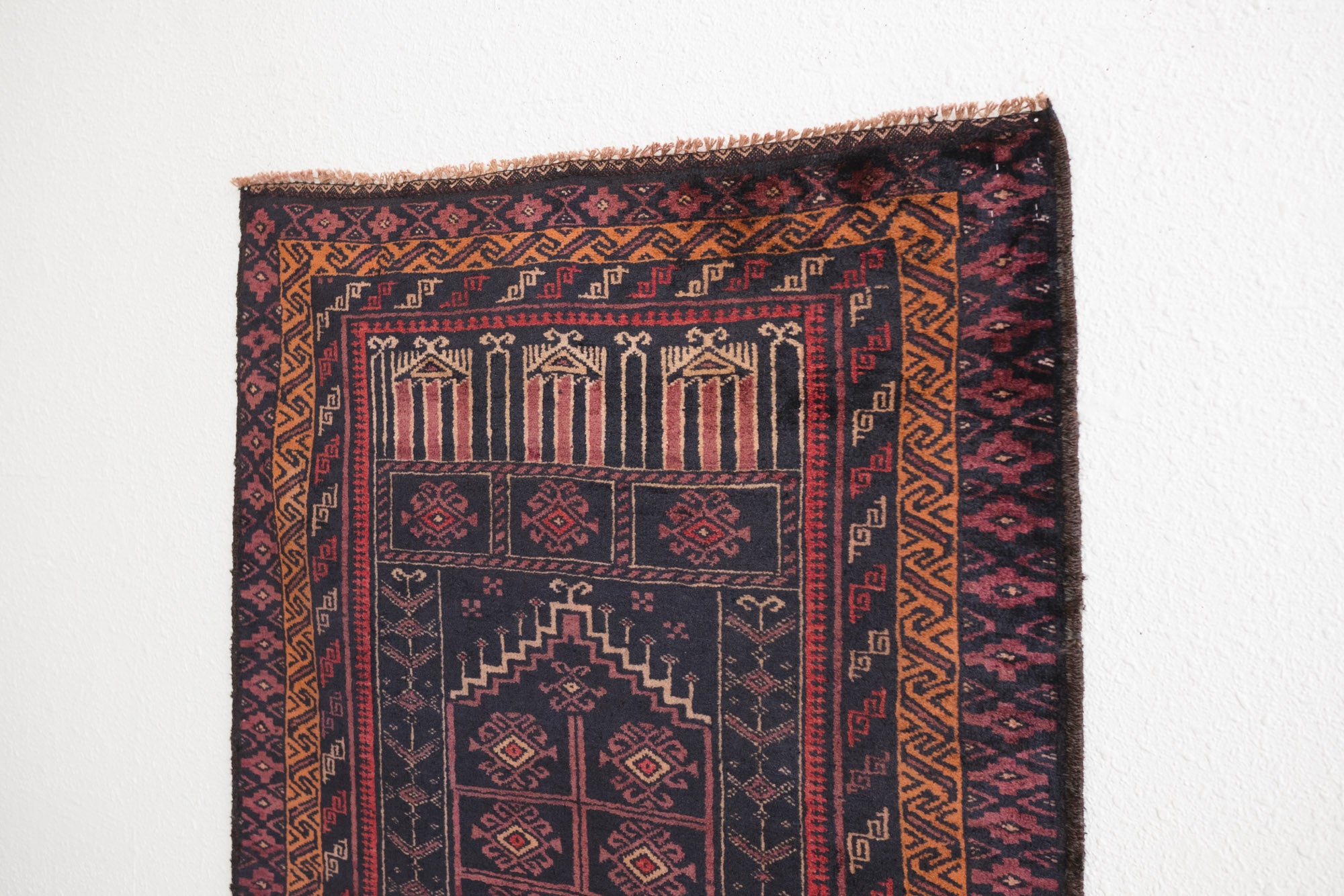 name: Zalanda style: hand knotted, Afghan, rug, carpet material: wool colors:red, orange, purple, camel, black age: vintage condition: good, age related wear - see pictures