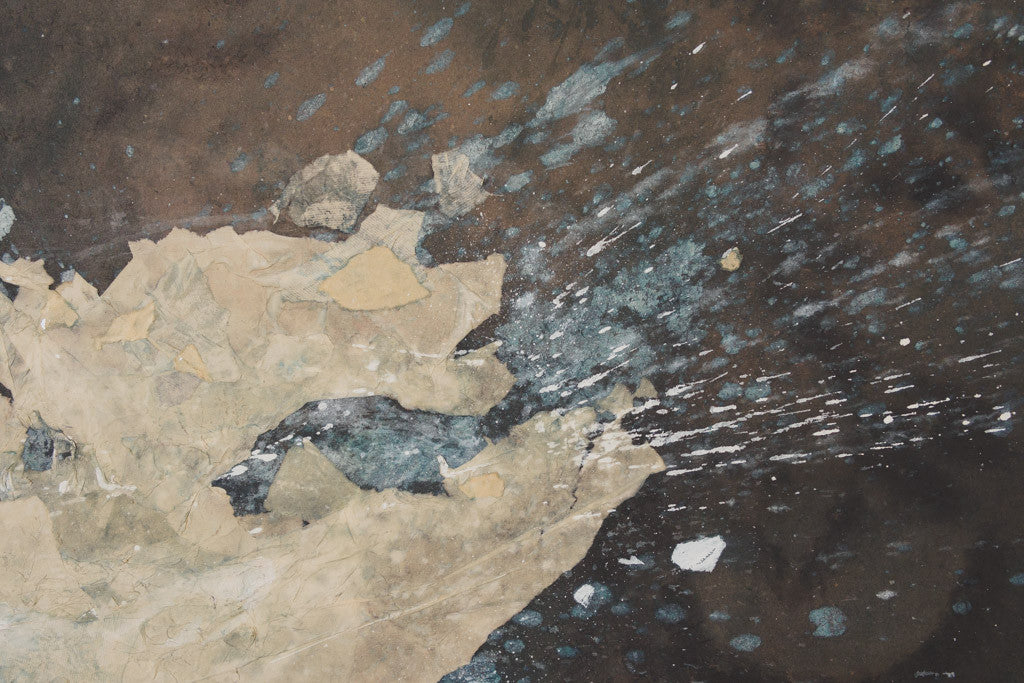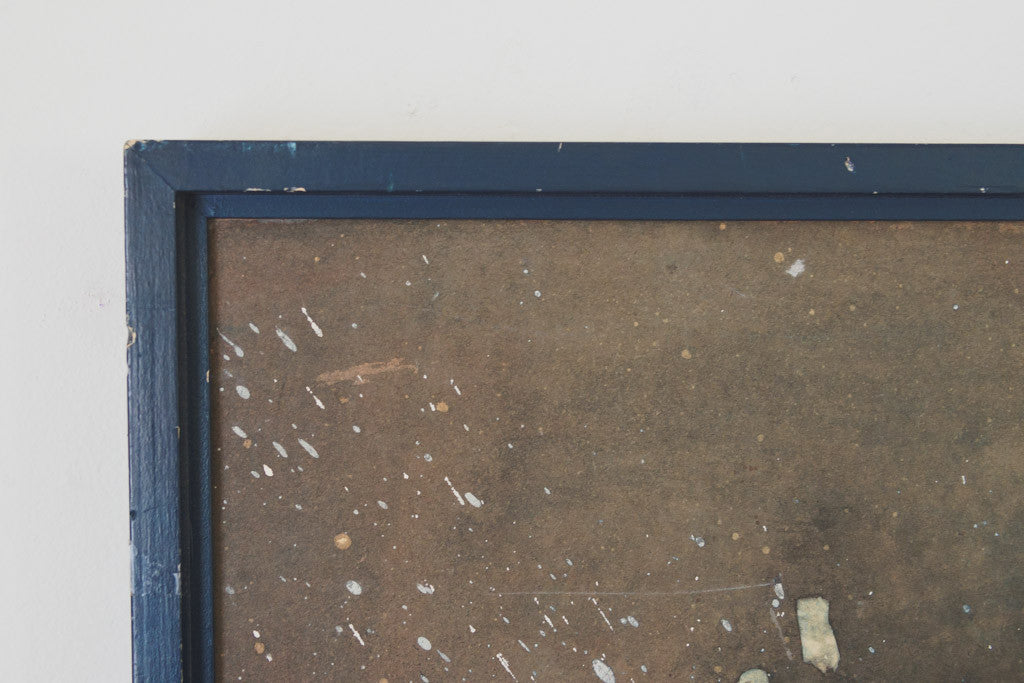 This unsigned vintage mixed media abstract painting has shades of brown, orange, white, blue and black with a navy wood frame. It's in good shape with age related wear. Please see pictures for detailed condition.