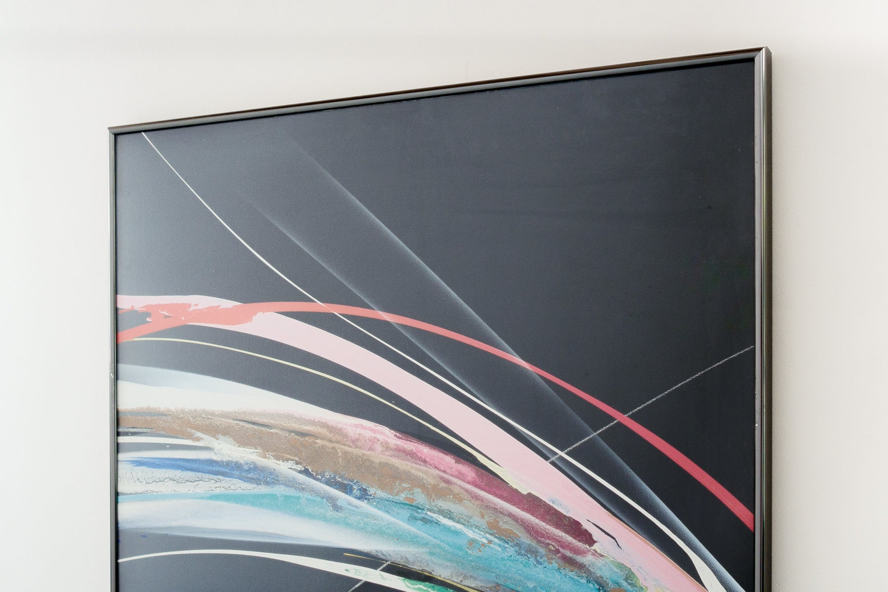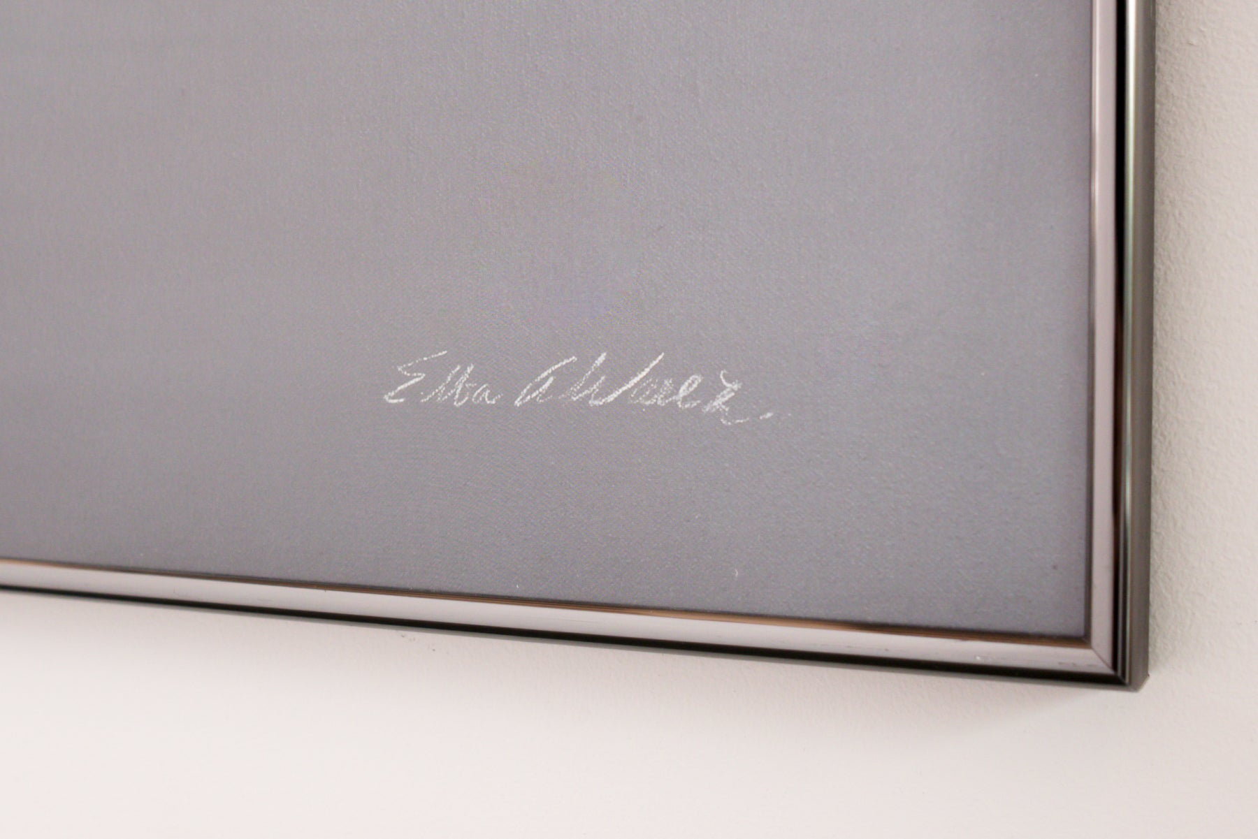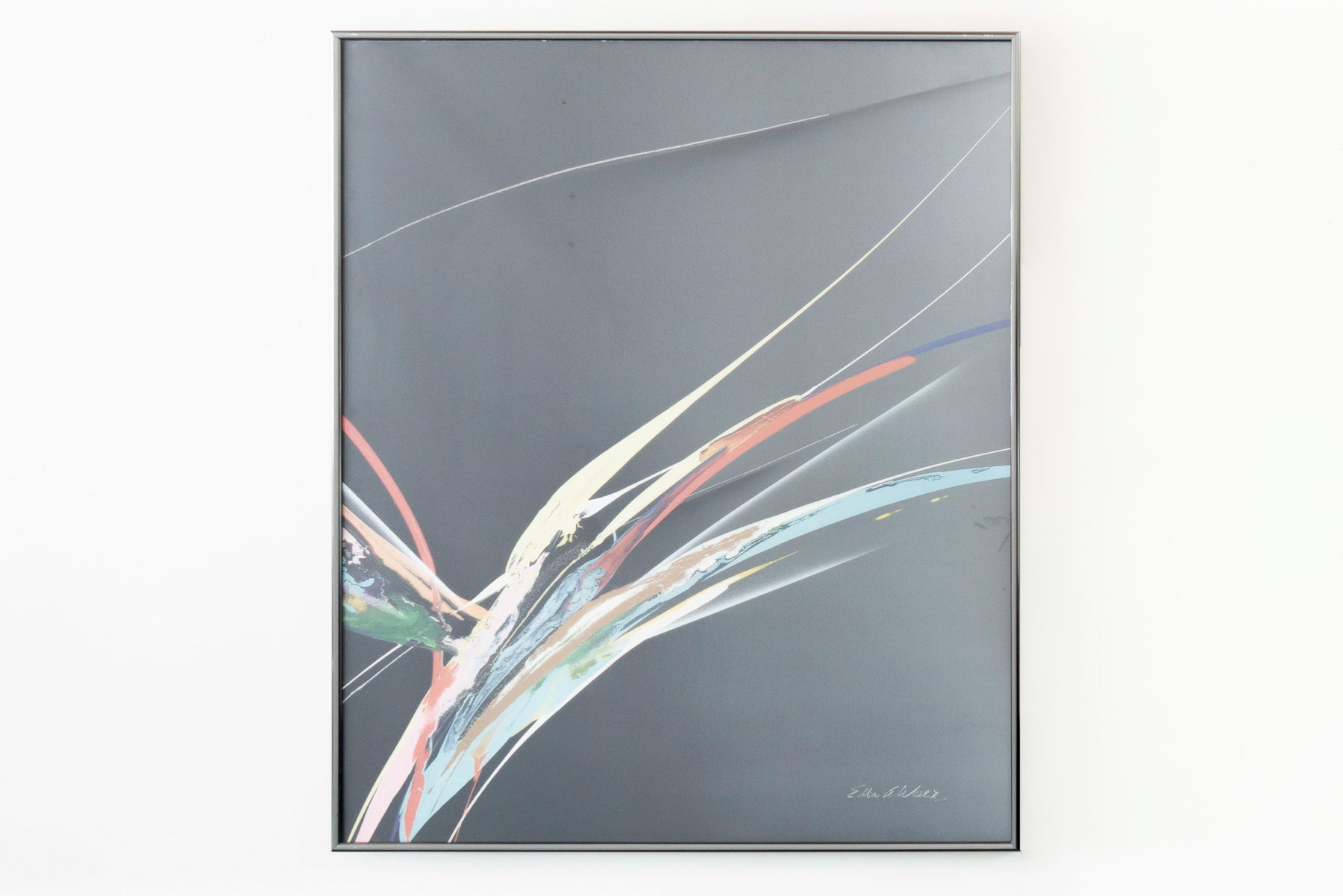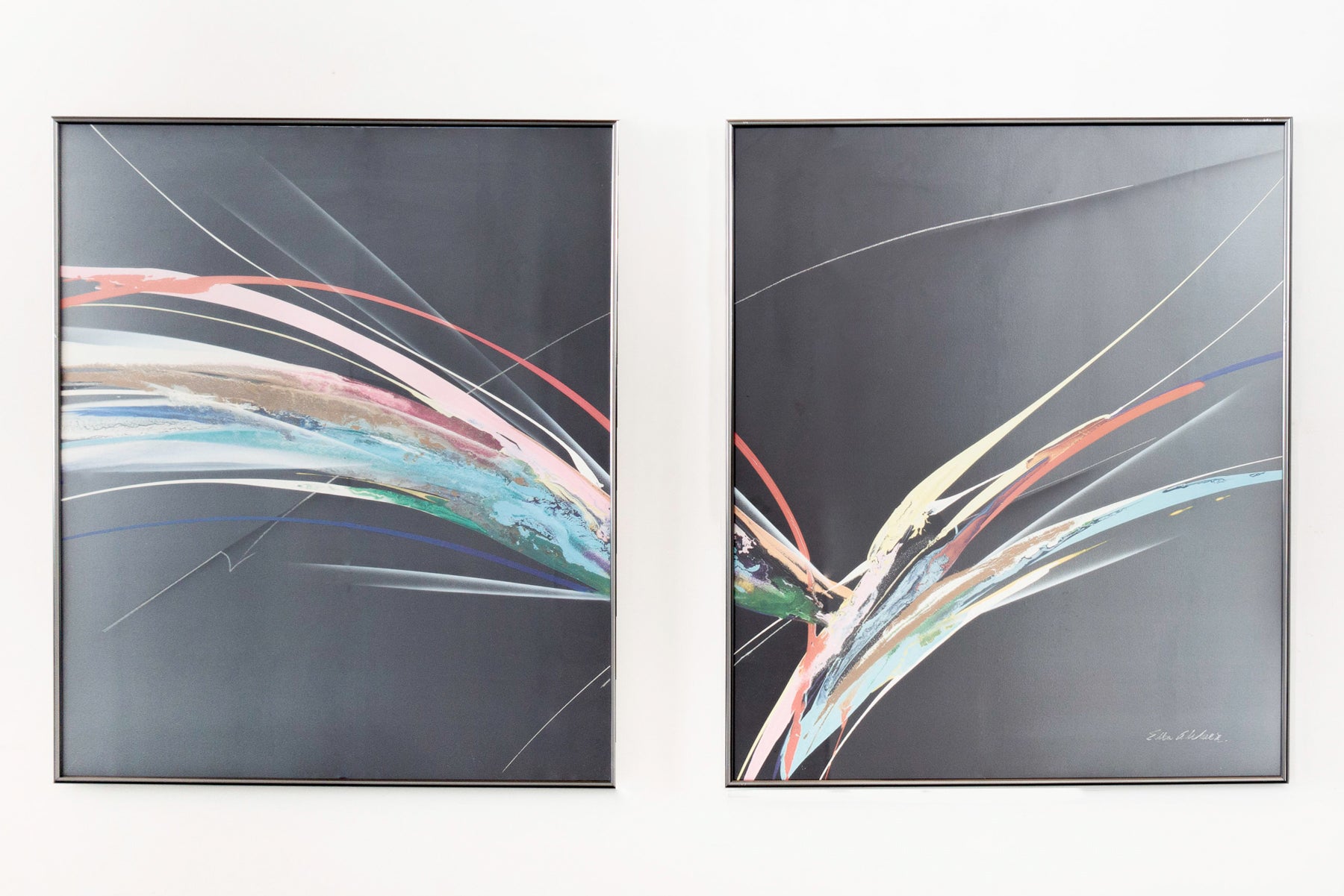 style: pair, modern, art, abstract, print material: metal, ink, paper, glass signed: Elba Alvarez age: vintage condition: good, age related wear - see pictures other: sold as a pair
