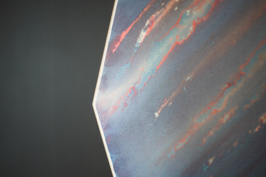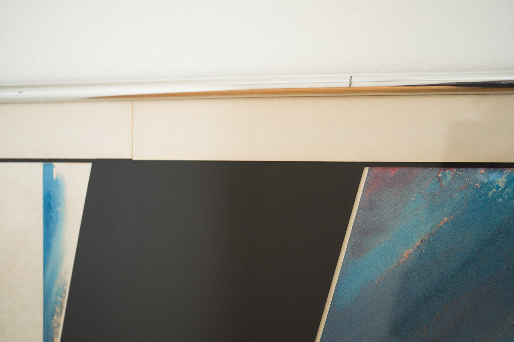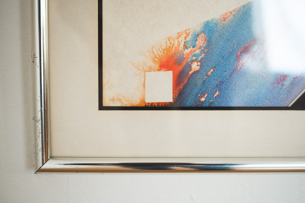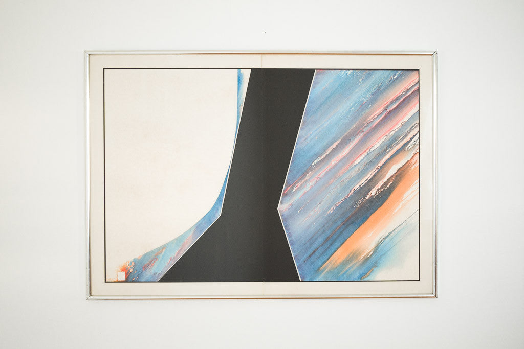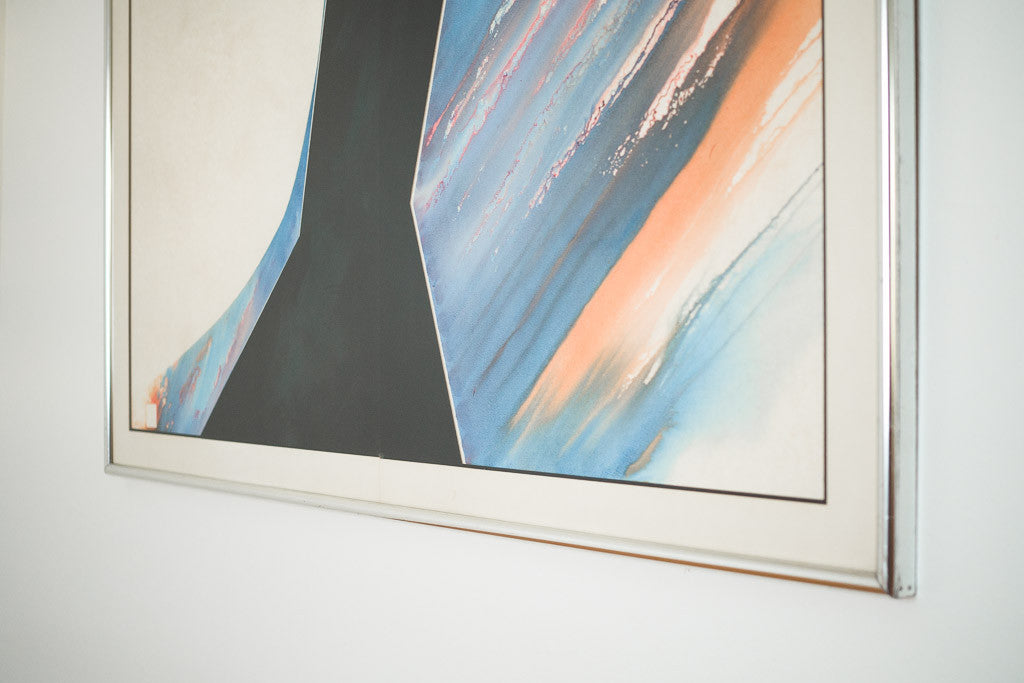 This large vintage watercolor abstract is chrome framed with glass and is in good shape with age related wear. See pictures for detailed condition.