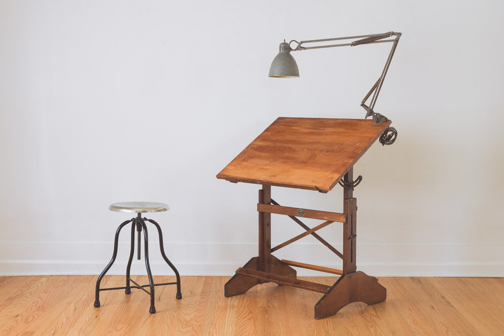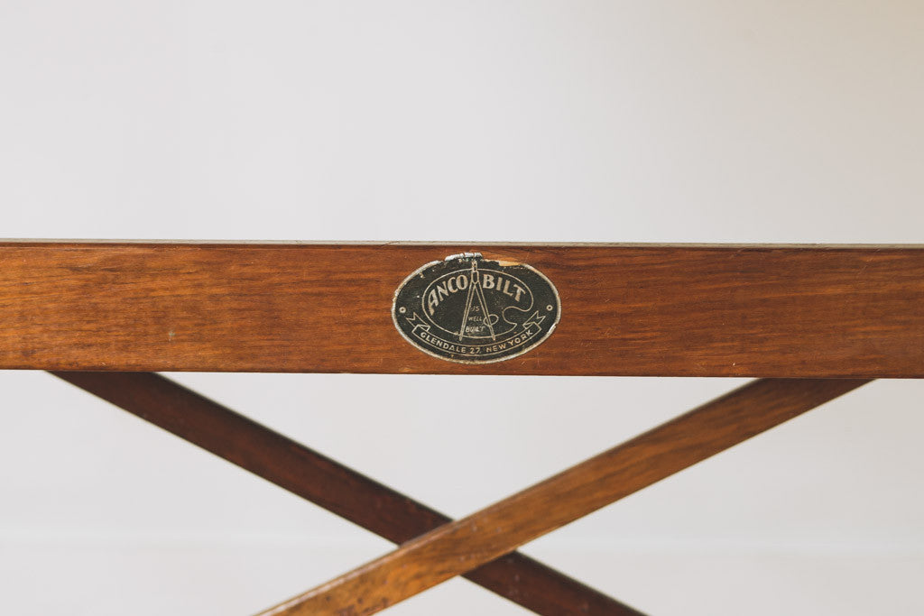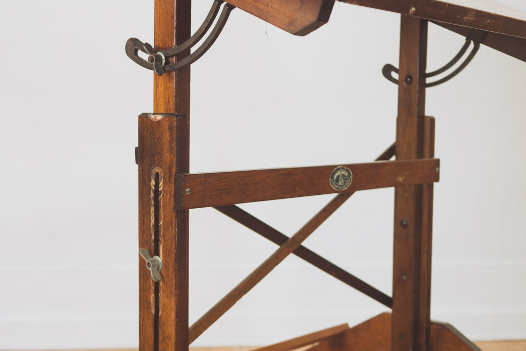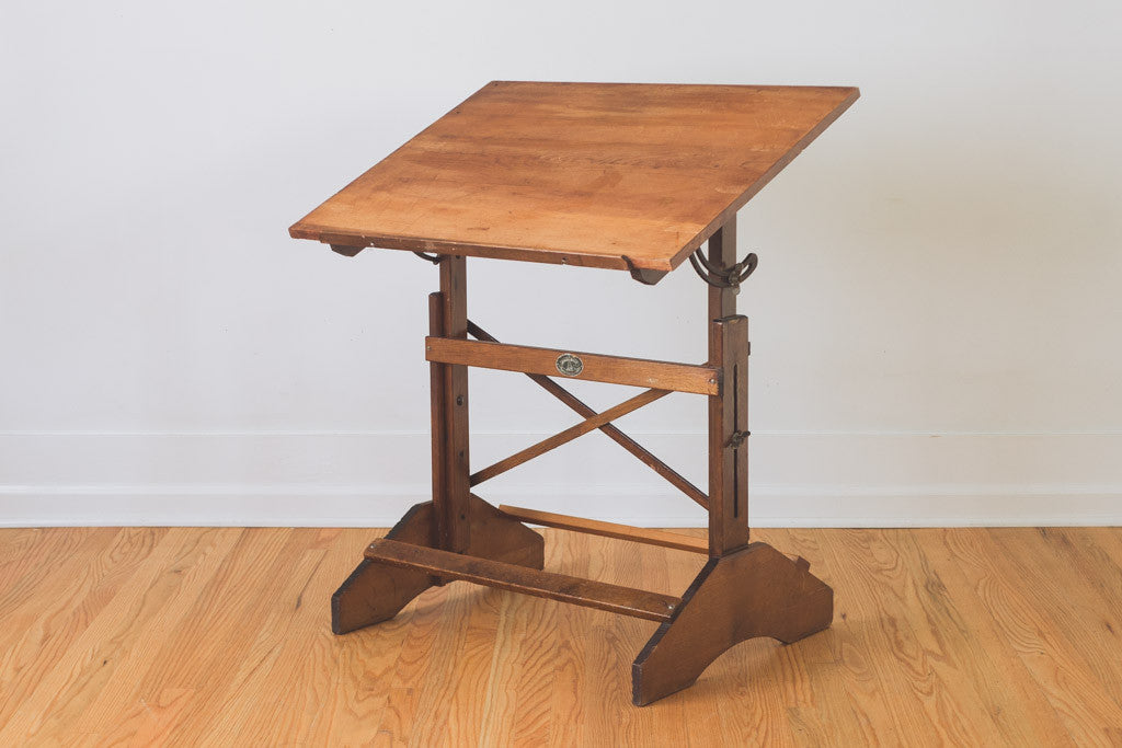 This vintage Anco Bilt drafting table has a dark wood stain, metal hardware and is adjustable in height and pitch. It's in good shape with age related wear. It would make a great standing or seated desk and because of its height and size it could also be used as a kitchen island or table. See pictures for detailed condition.