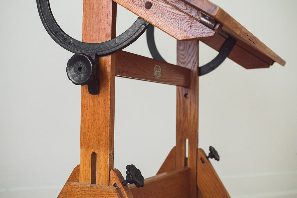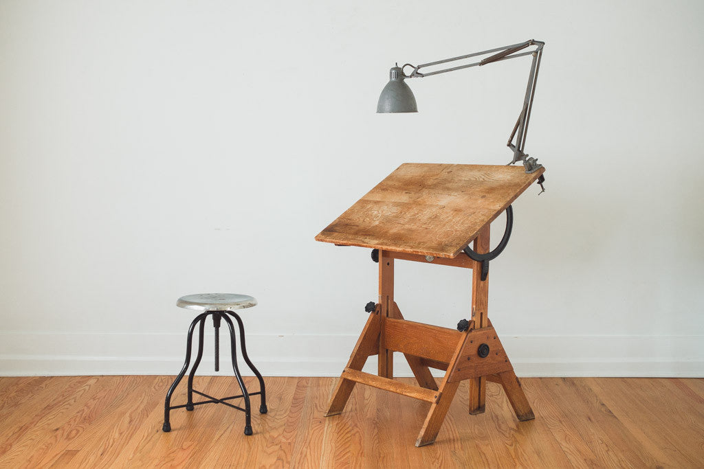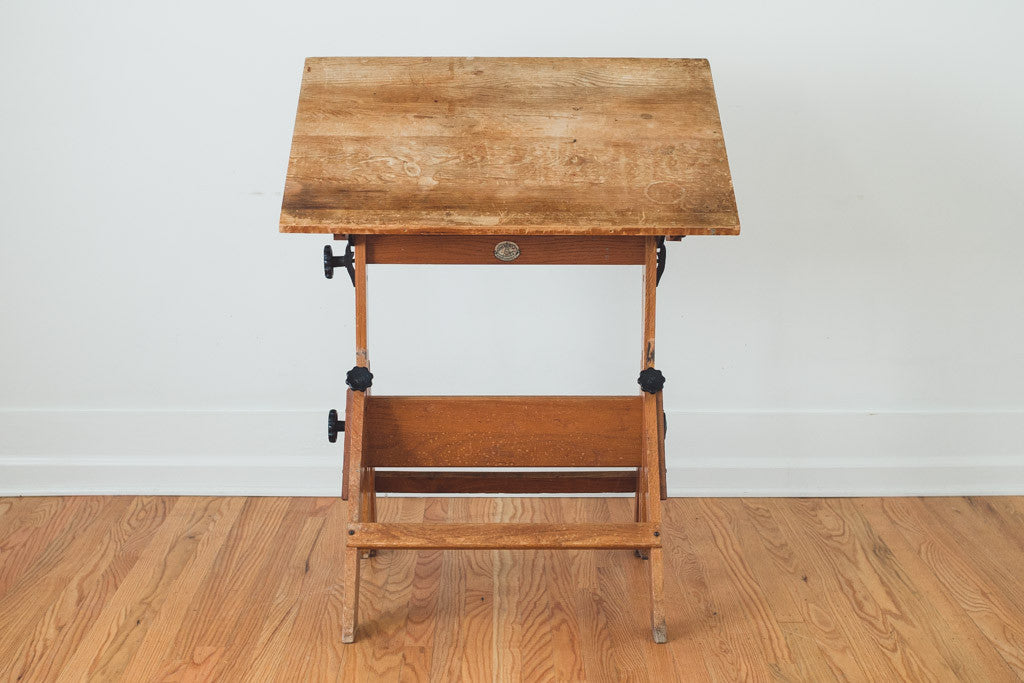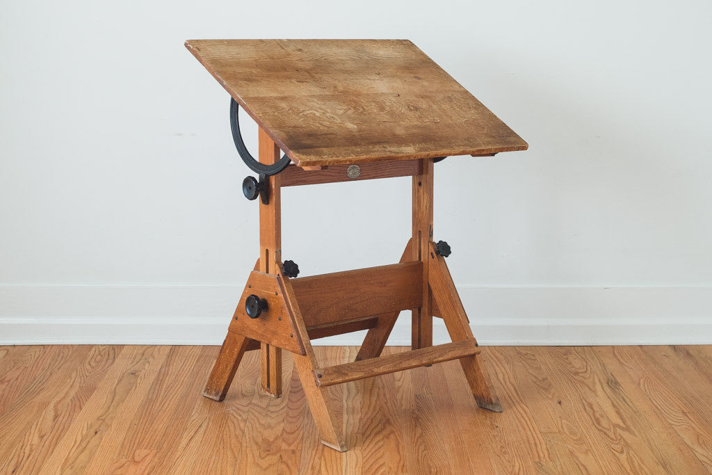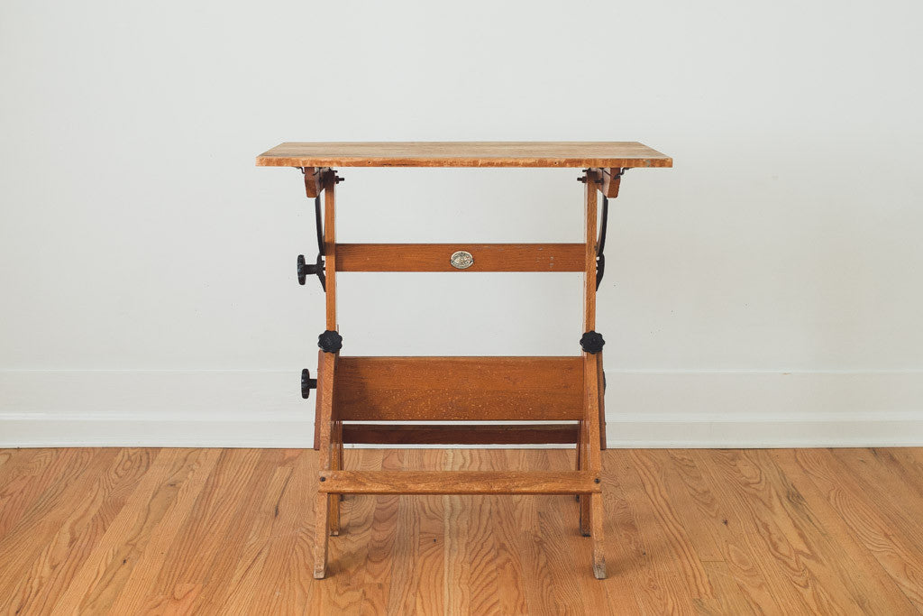 This vintage drafting table was made in the USA by Anco. It's adjustable in height and pitch, so it could also be used as a desk, bar or bistro table. It's in good shape with age related wear. See pictures for detailed condition.