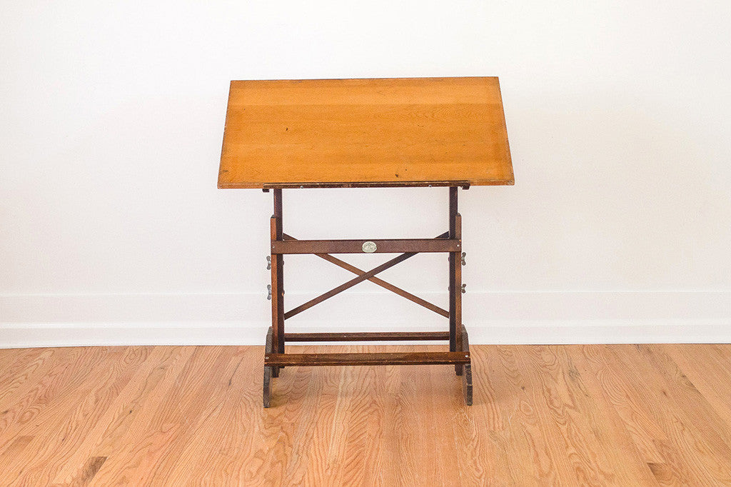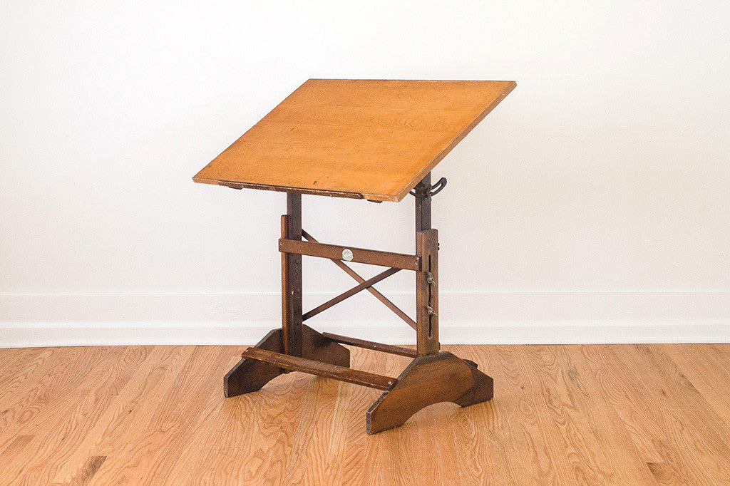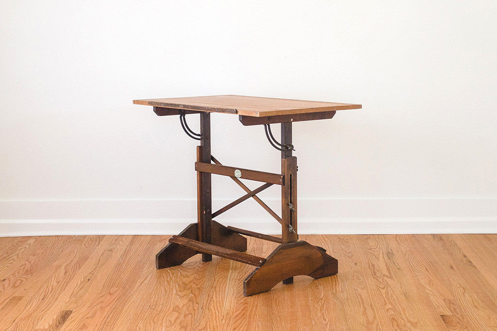 This vintage draftsman's table is a medium to smaller sized model made by Anco. It has easy to use metal hardware and is adjustable in height and pitch. The oak top and base on this piece have a nicely aged patina. This table is sturdy and in overall great shape besides the age-related wear. It would make a great standing or seated desk and because of its height and size it could also be used as a really cool kitchen island or bar table. Please see pictures for detailed condition of this piece.