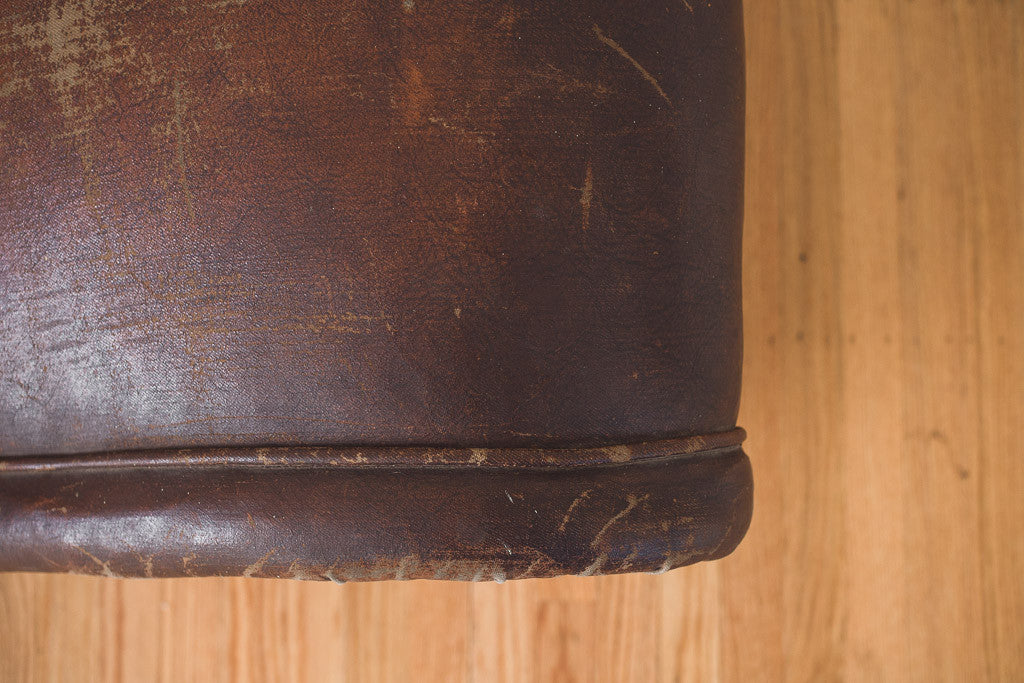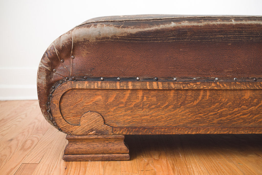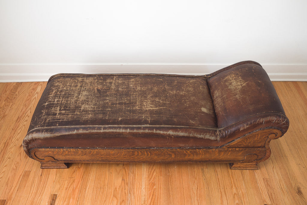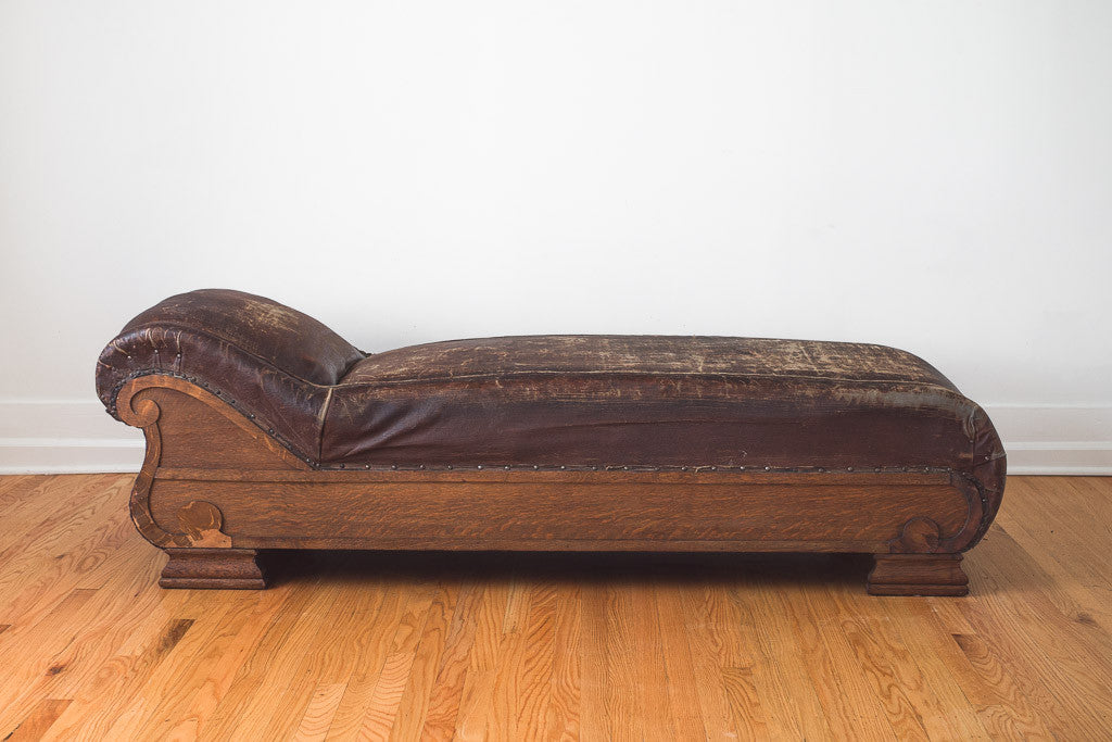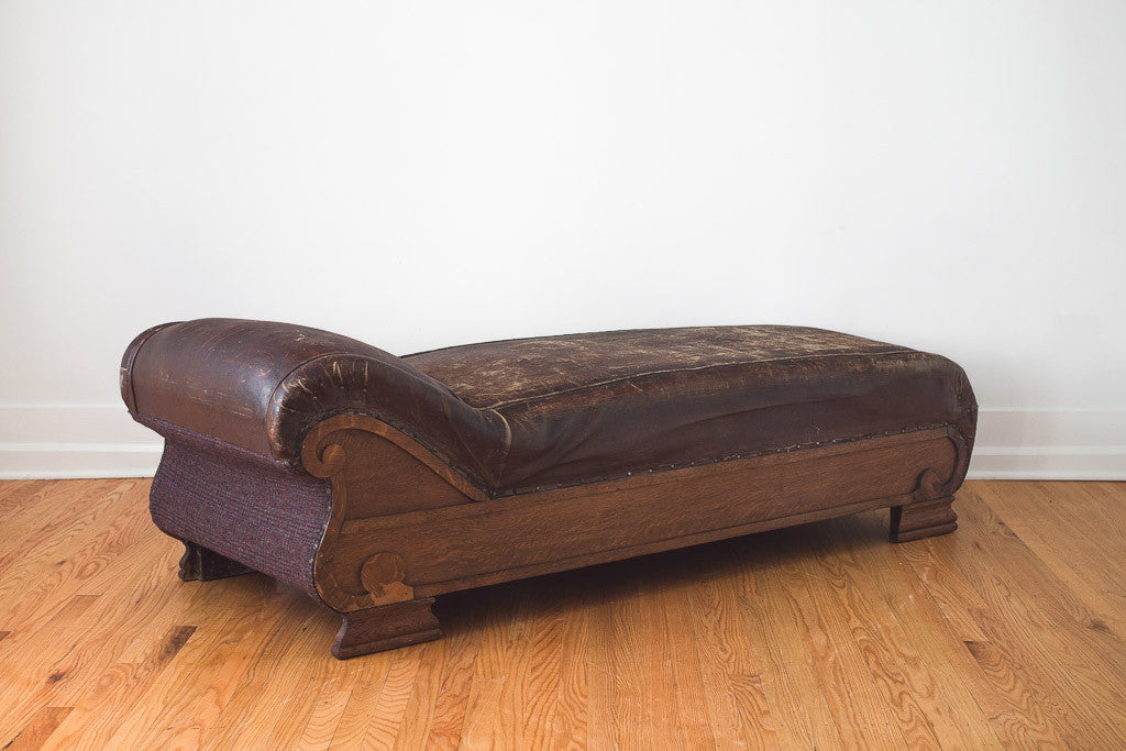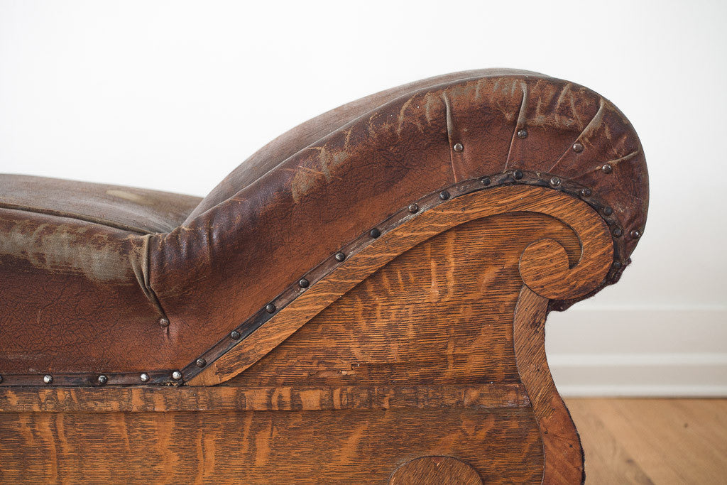 This distressed antique chaise has its original naugahyde upholstery and oak frame. It's comfortable and in good shape with age related wear, it also makes a nice bench. See pictures for detailed condition.