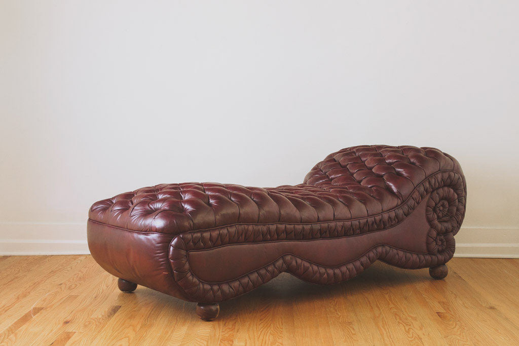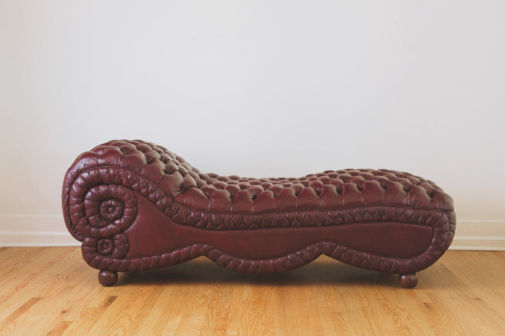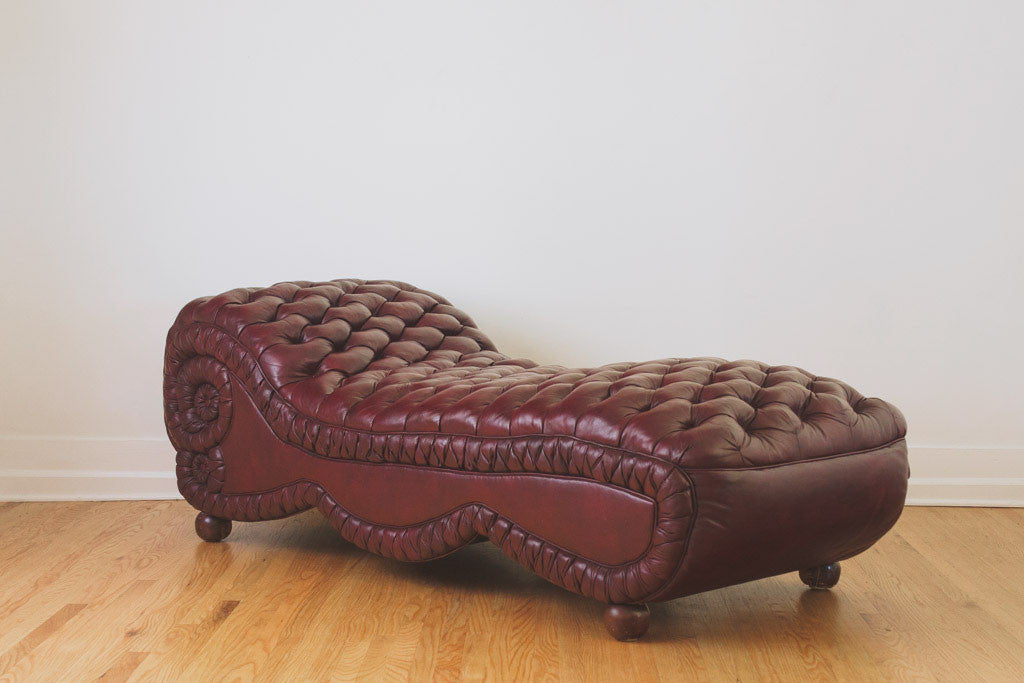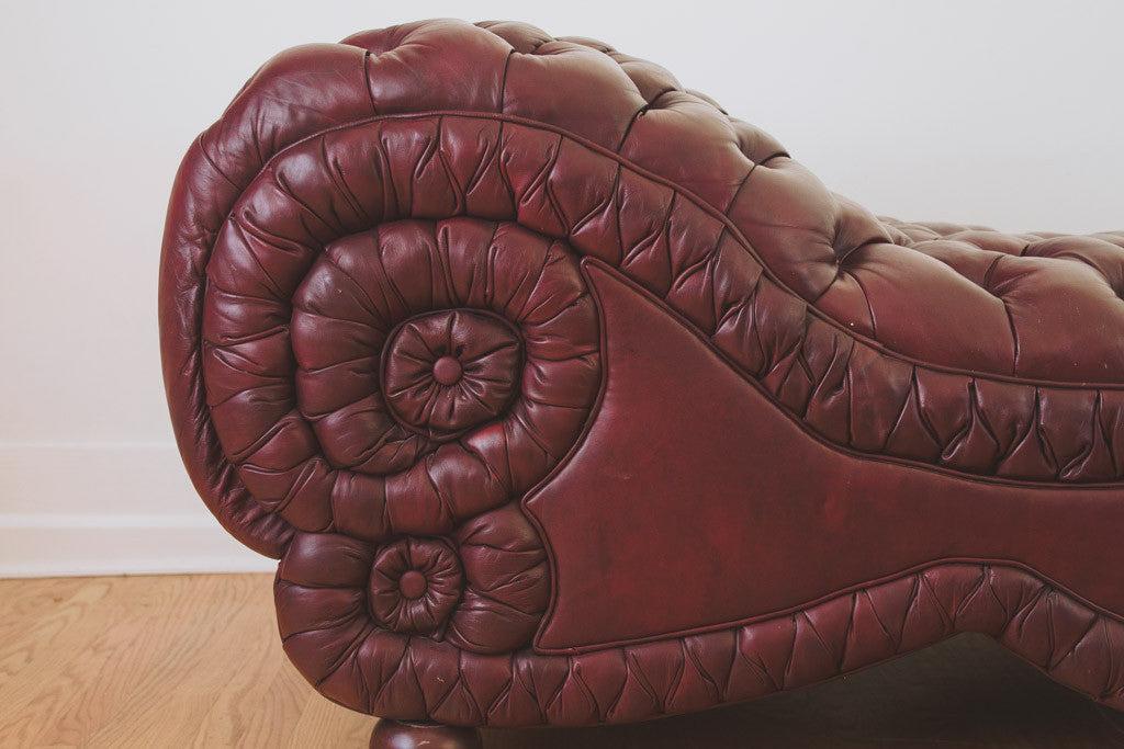 This tufted leather chaise has its original upholstery and wood feet. It's comfortable and in good shape with age related wear. See pictures for detailed condition.