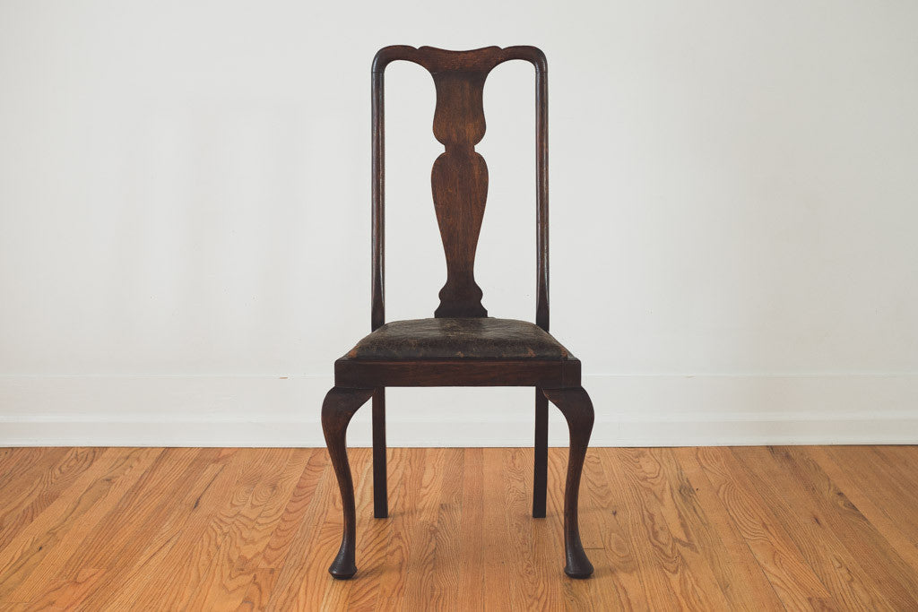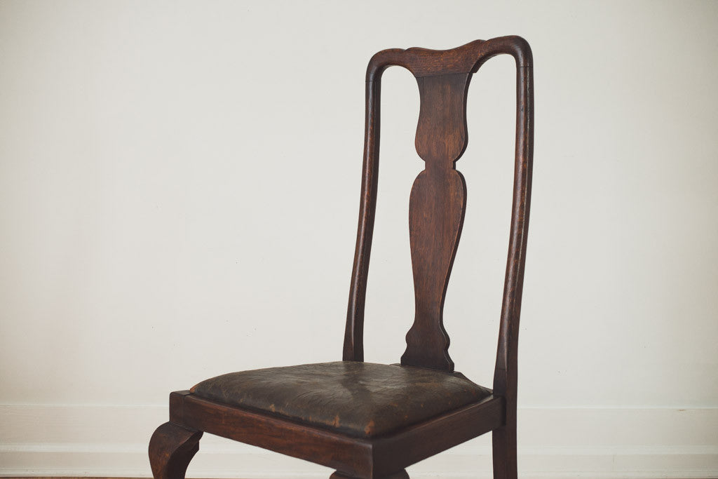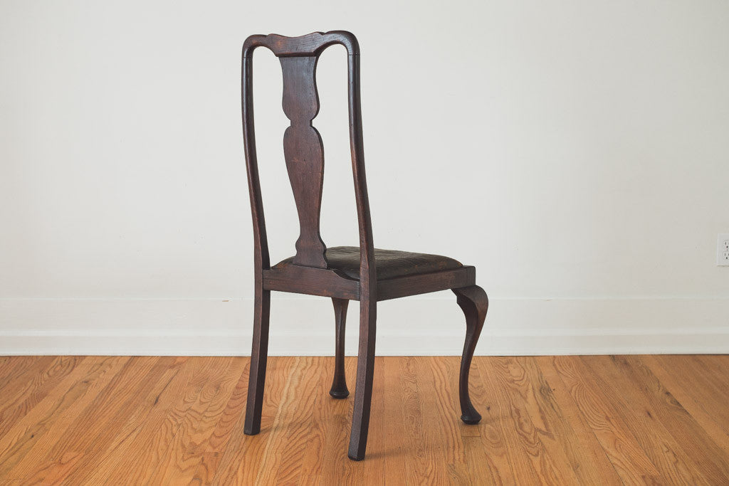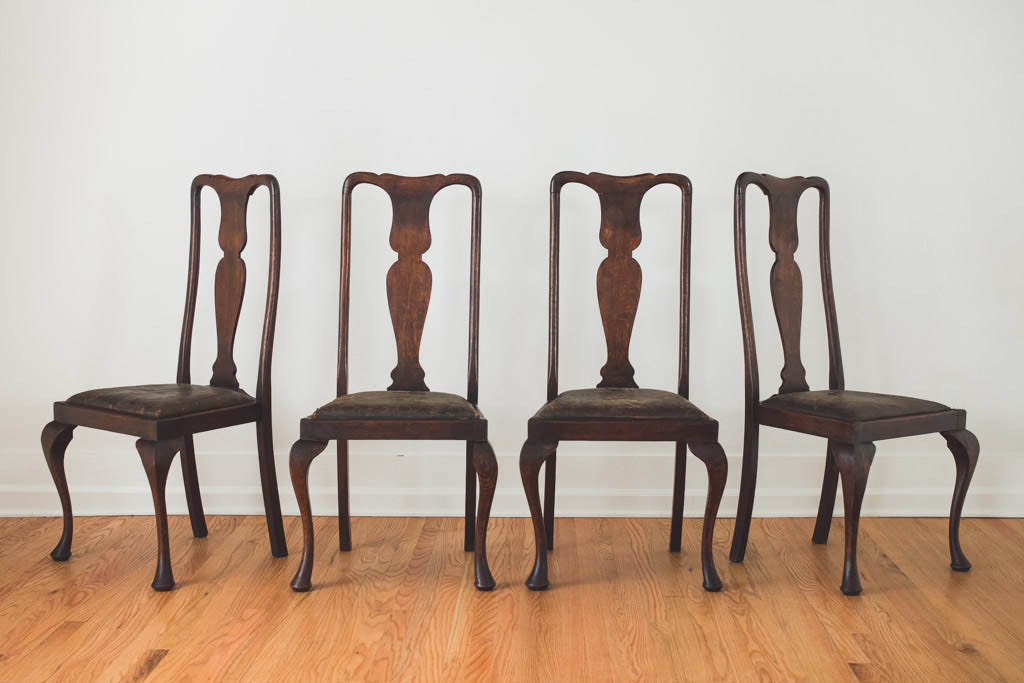 This set of four antique dining chairs have distressed leather seats on dark wood frames. They're in good overall shape with age related wear. See pictures for detailed condition. Price is for the set.