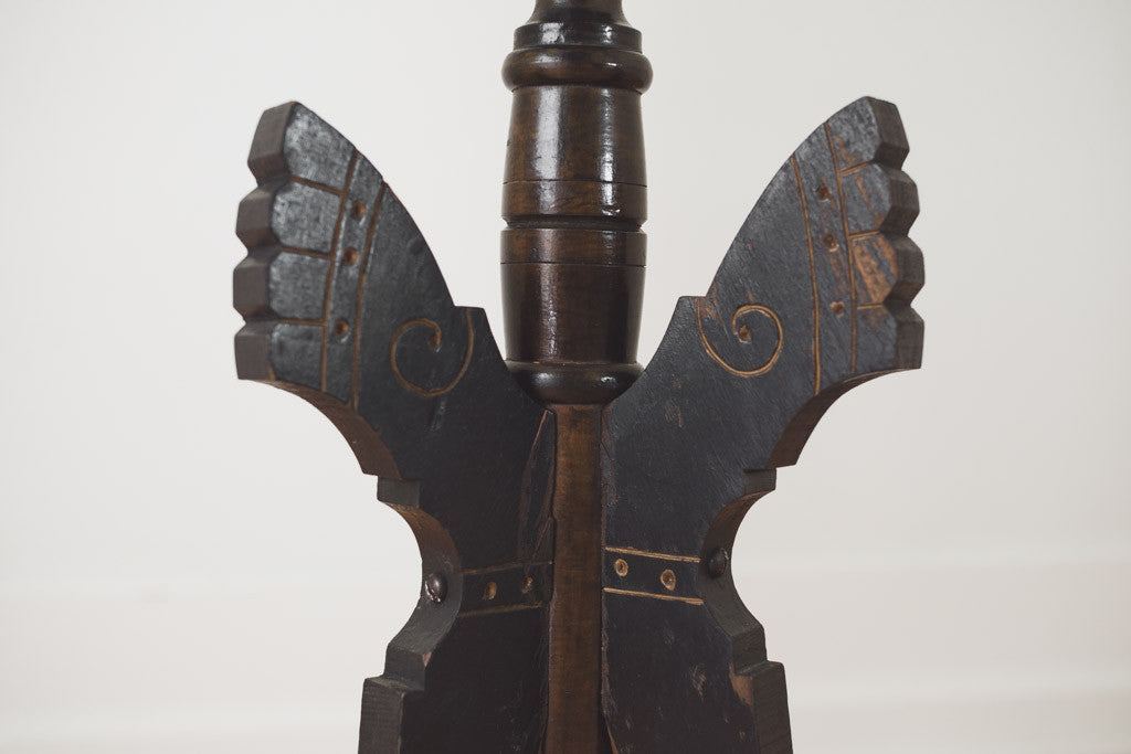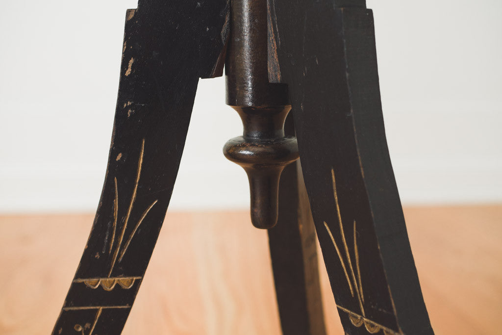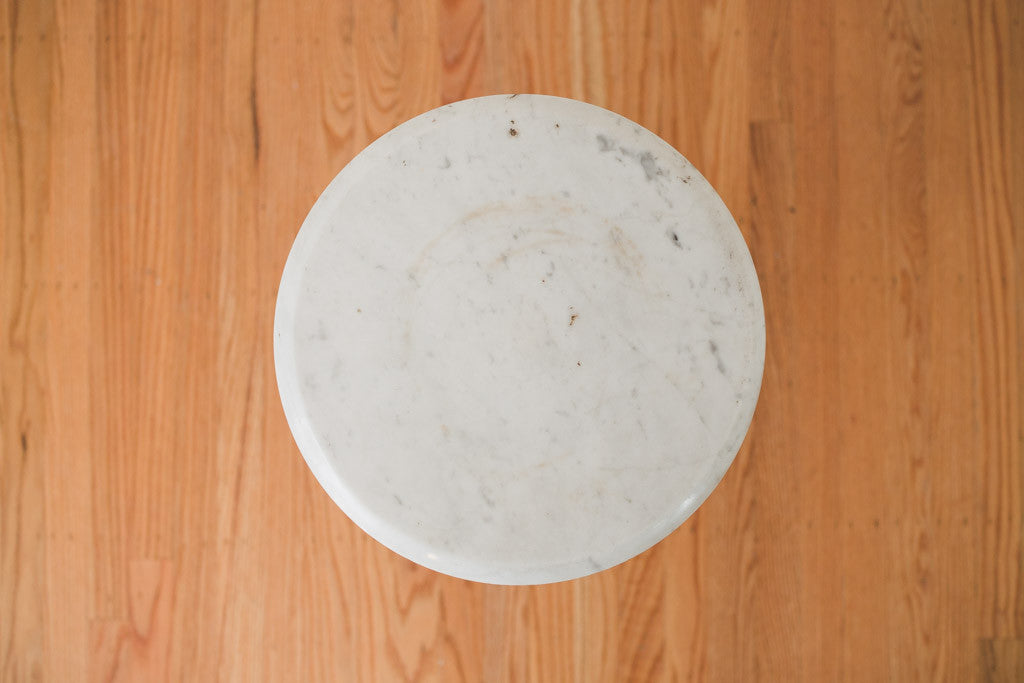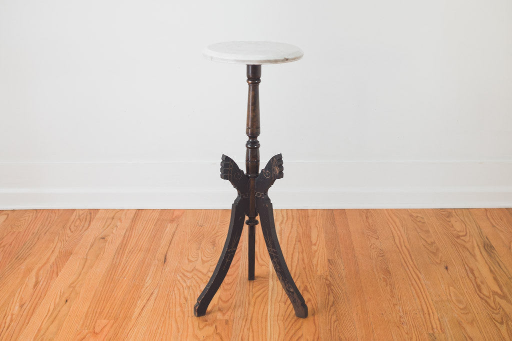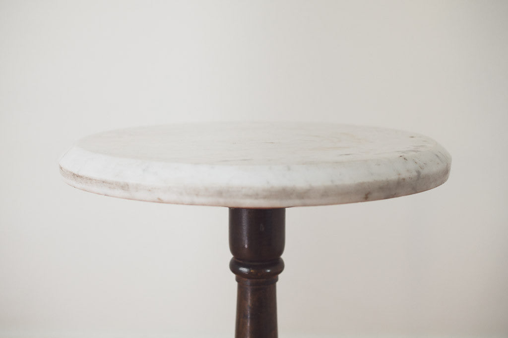 This antique table has a white and black marble top with a carved wood base. It's in good overall shape with age related wear. See pictures for detailed condition.