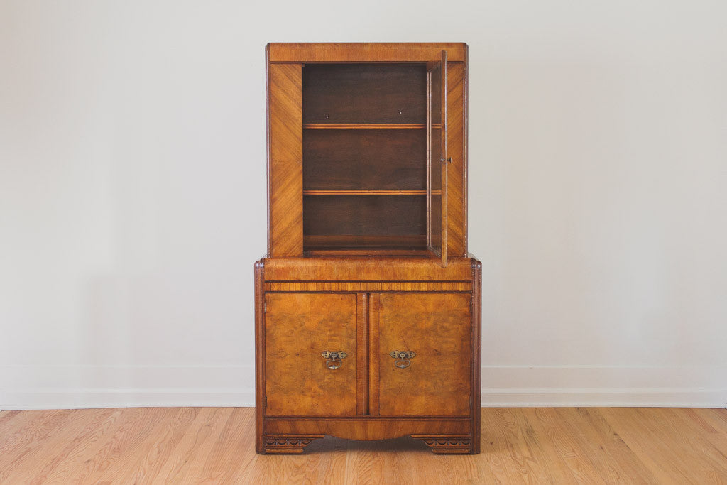 This vintage Art Deco cabinet is oak veneer with inlayed and carved details and metal pulls. The top has three shelves behind a wood and glass door, and the bottom has open storage behind two wood doors. It's in good shape with age related wear including some missing veneer on the back edges. The back panel was modified with holes for electric wires. Please see pictures for detailed condition.