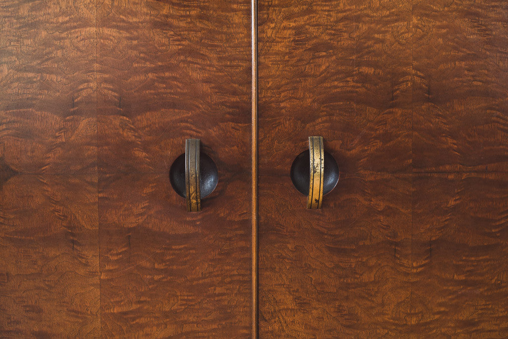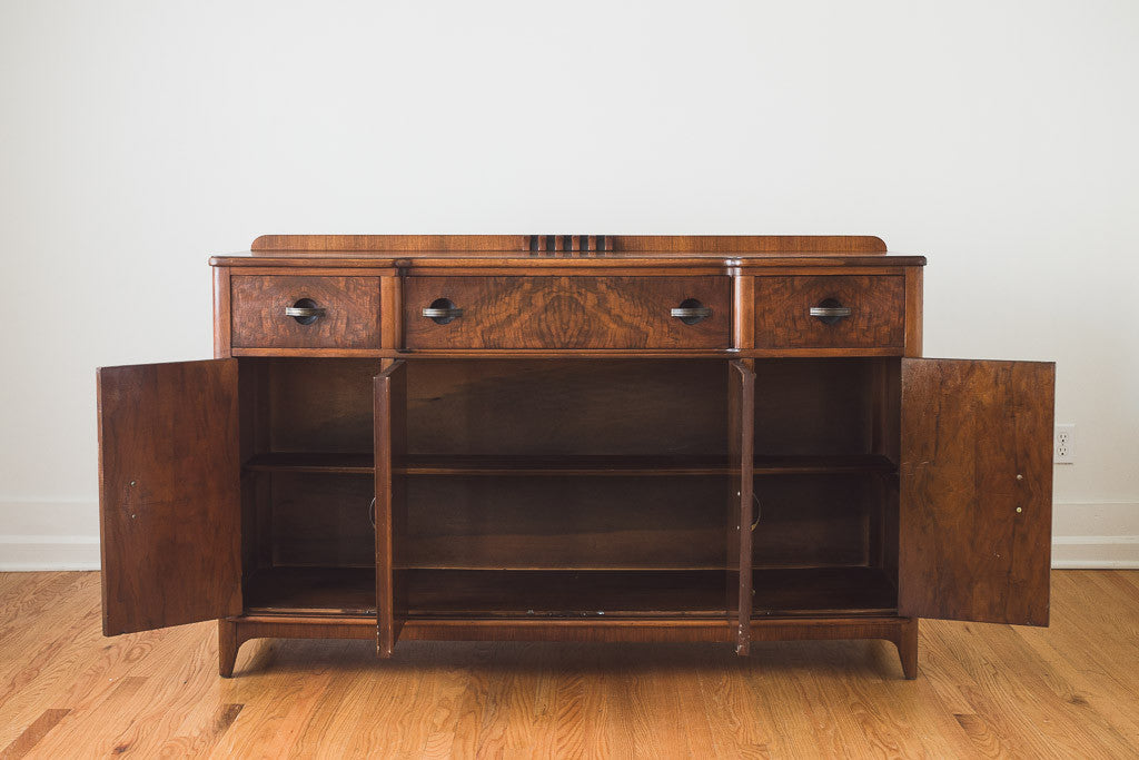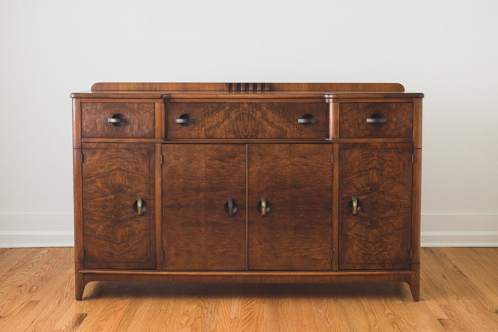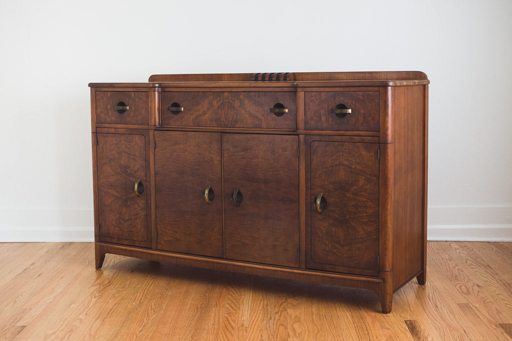 This Art Deco era buffet was manufactured in the US. It has metal pulls and carved wood details. It's in good shape with age related wear and could also be used as a sideboard, buffet or dresser. See pictures for detailed condition.