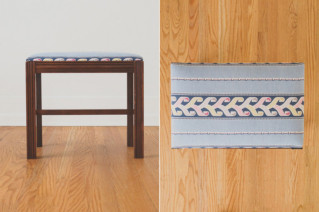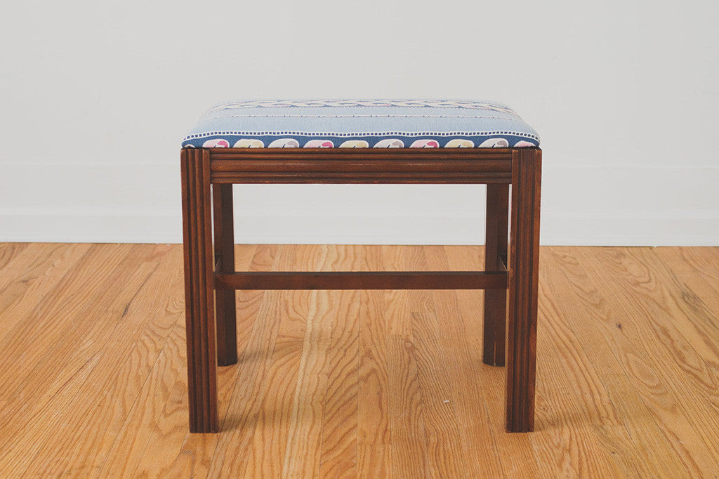This Mid Century piano bench is part of our HS Collection. It has a dark wood frame and Art Deco era barkcloth upholstery. It would be perfect for bench seating, used as an ottoman or side table. It's sturdy and in great shape with age related wear. Please see pictures for detailed condition.