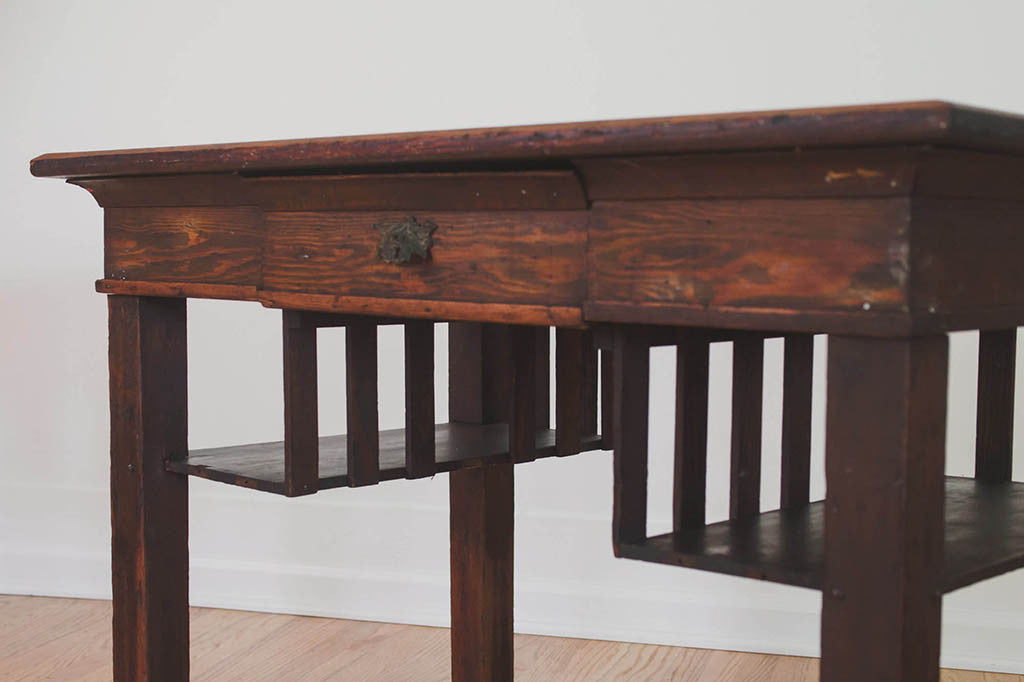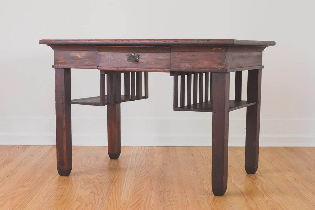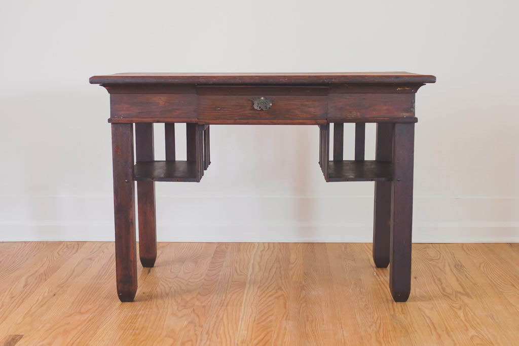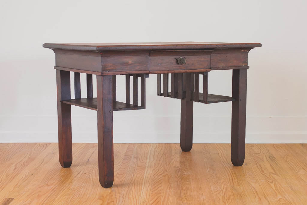 This vintage Arts and Crafts era library desk is fir with two shelves and one drawer with a carved metal drawer pull. It's in good shape with age related wear and an old non-structural modification to the back. See pictures for detailed condition.