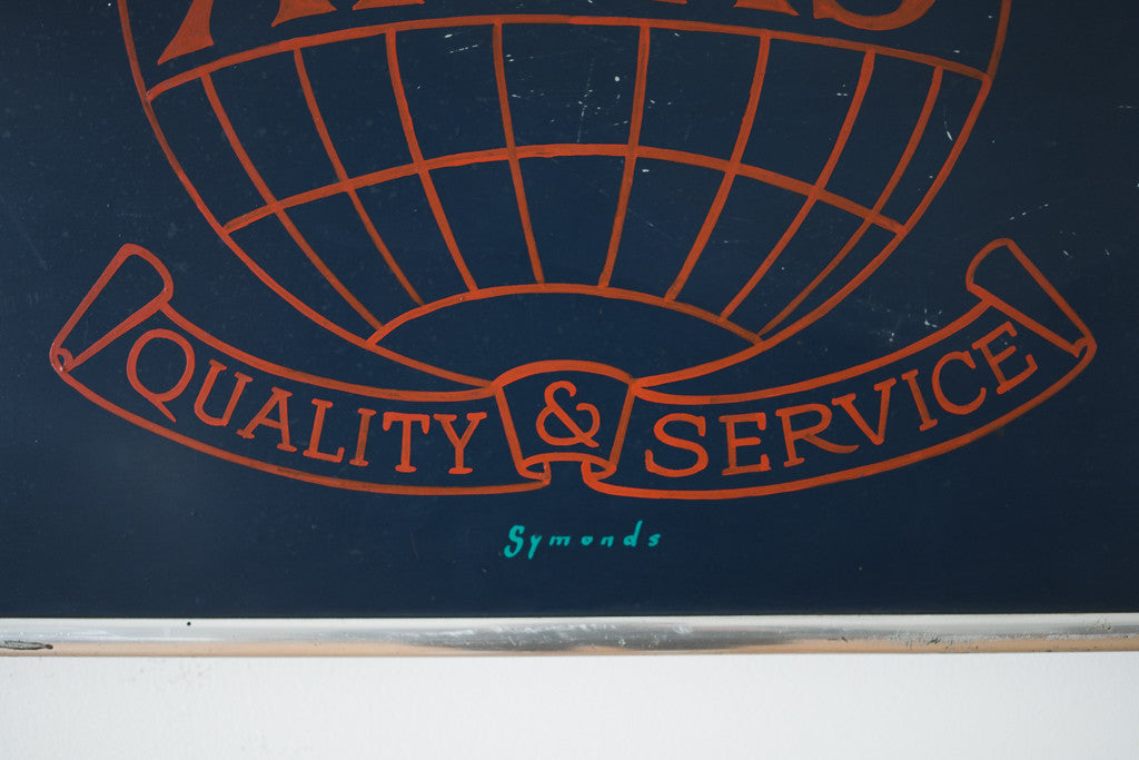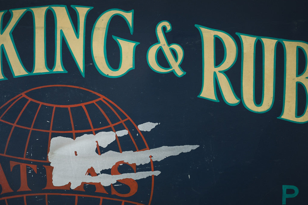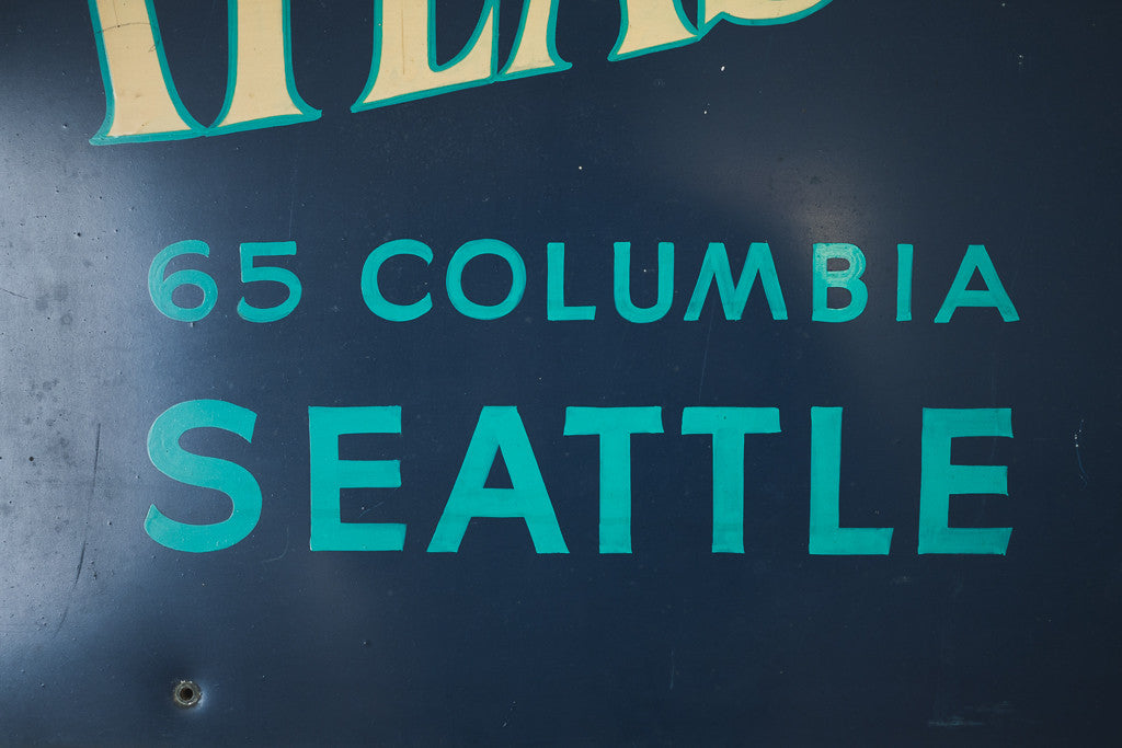 This hand-painted steel sign has navy, red, yellow and teal paint that reads, "Atlas Packing & Rubber Co. 65 Columbia Seattle". It's in good shape with age related distressing and wear. See pictures for detailed condition.