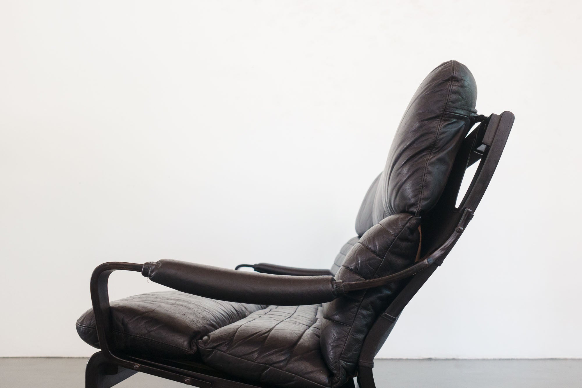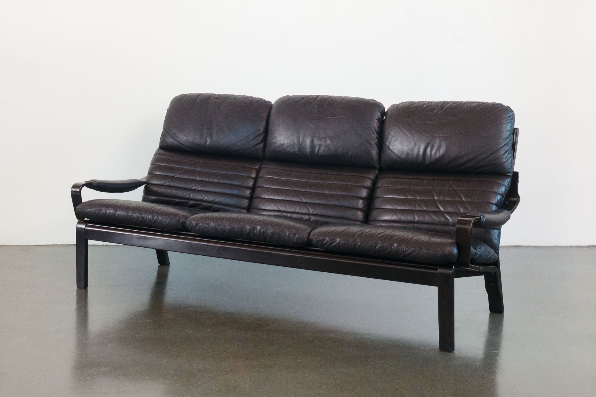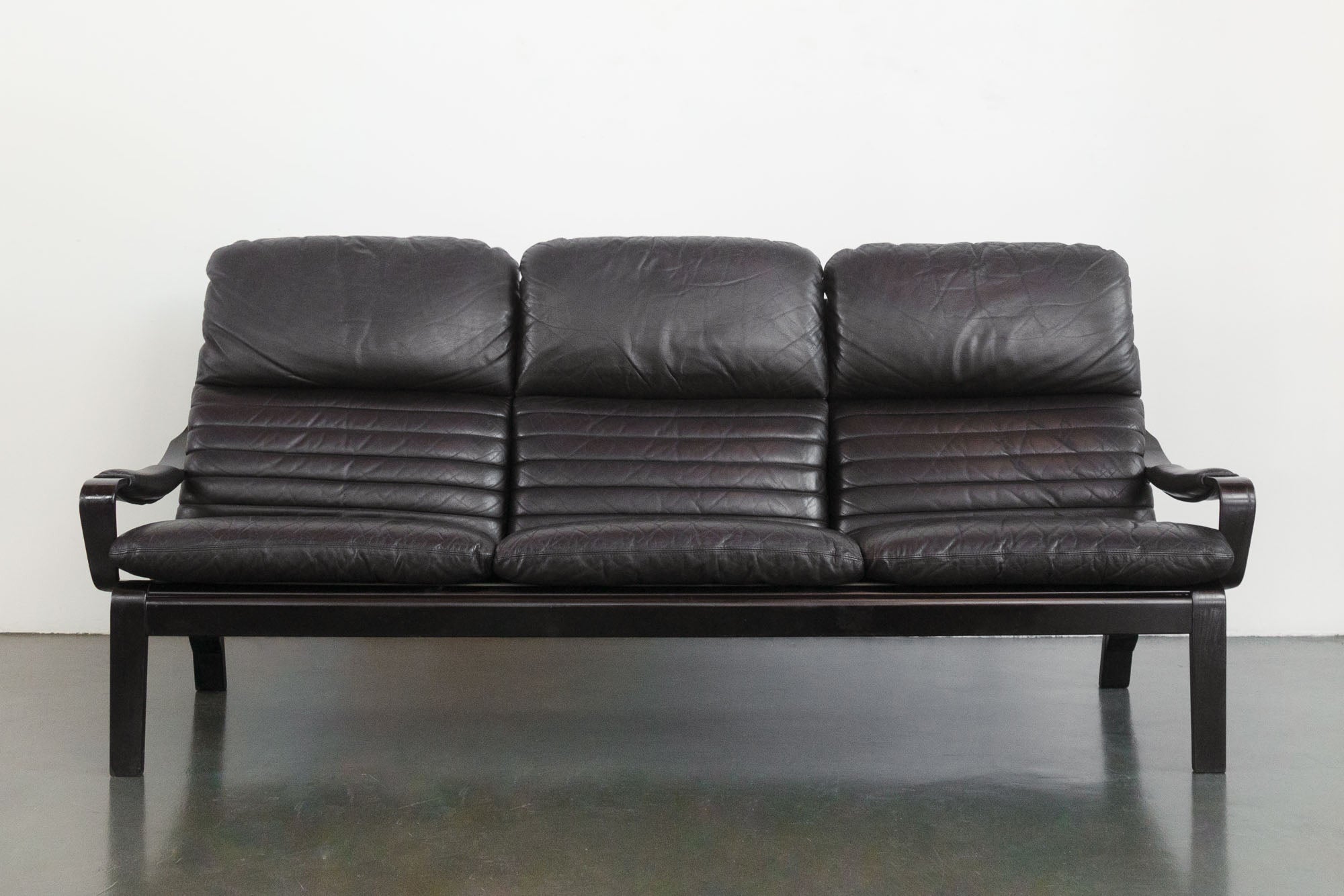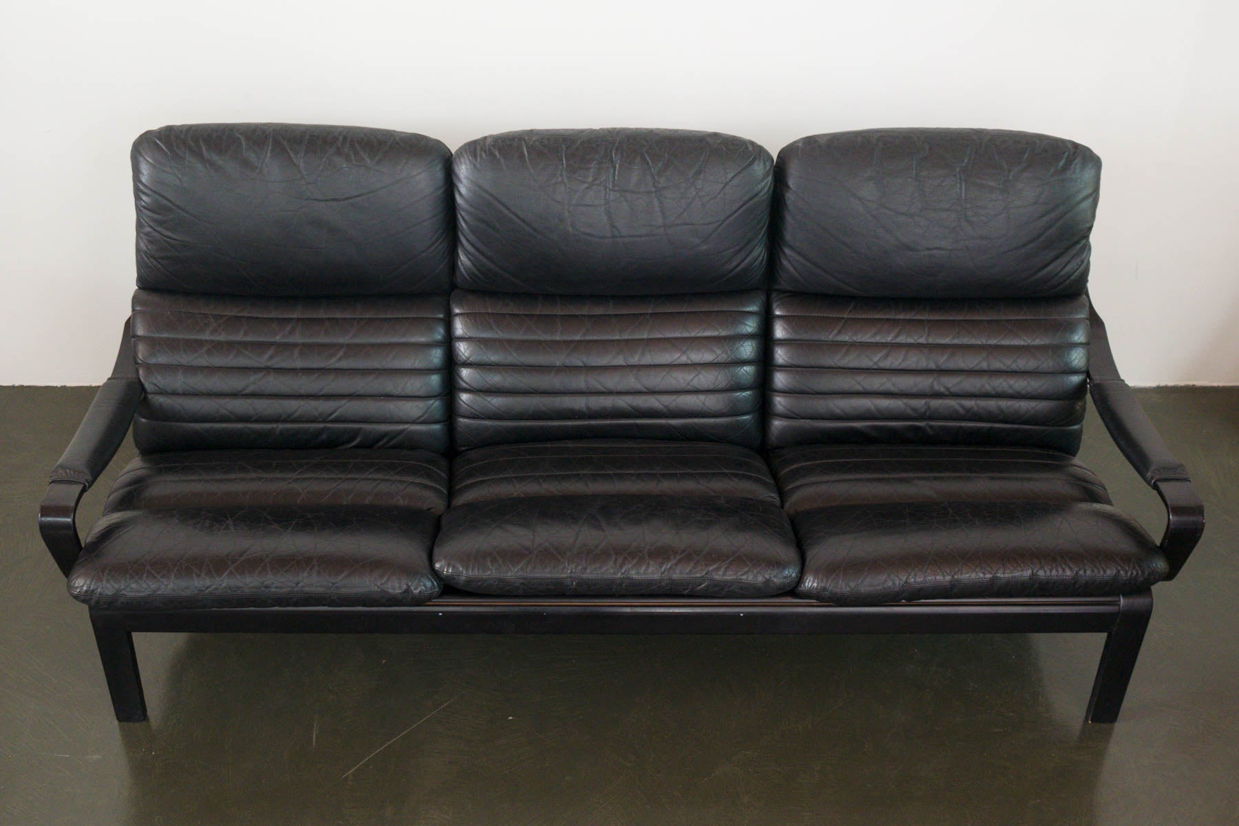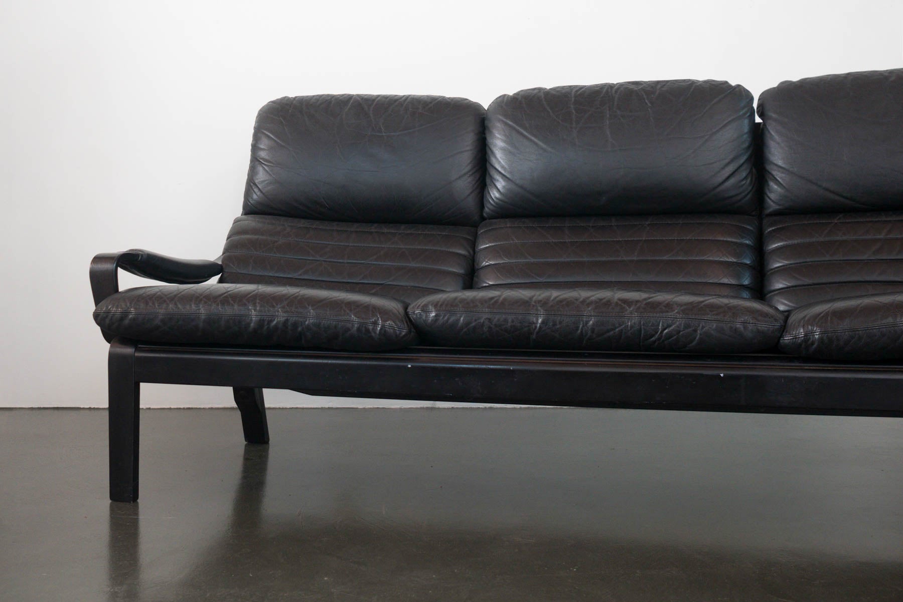 style: modern, mod, high-back, sofa, couch, 3 seat material: black leather, black stained wood age: vintage, 1970s-80s origin: Made in Australia condition: good, age related wear - see pictures sku: hs-107