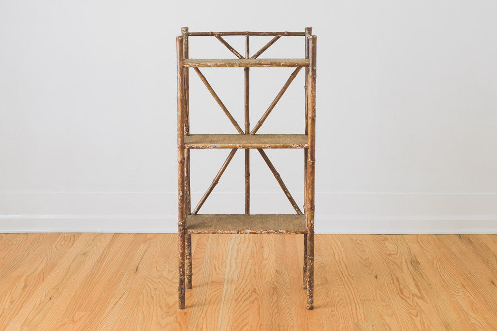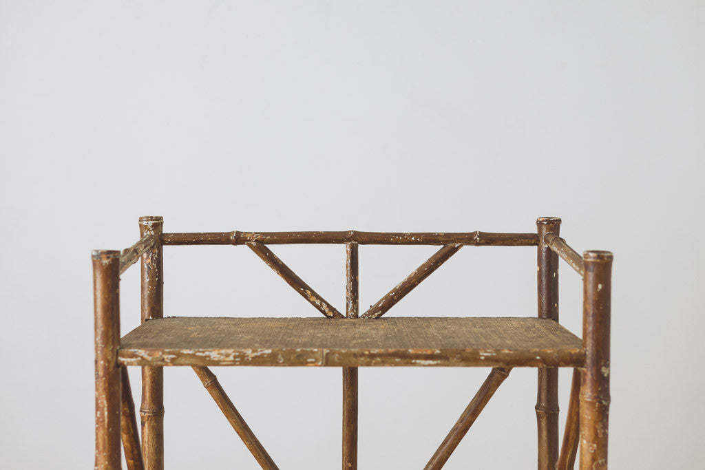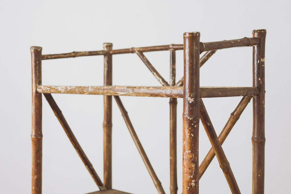 This vintage bamboo shelf has three tiers for plants, books or whatever you collect. It's sturdy and in good shape with age related wear. See pictures for detailed condition.