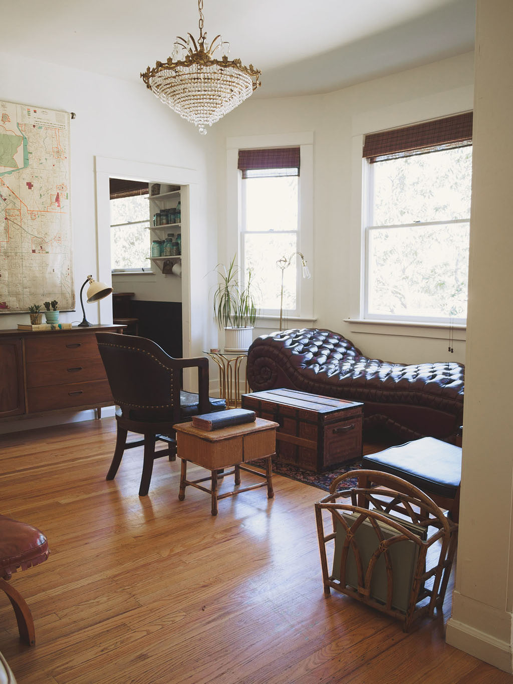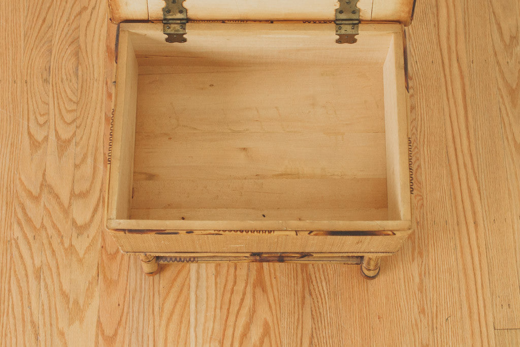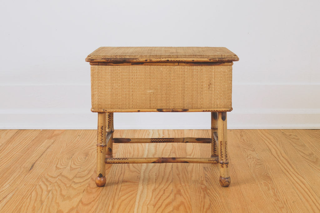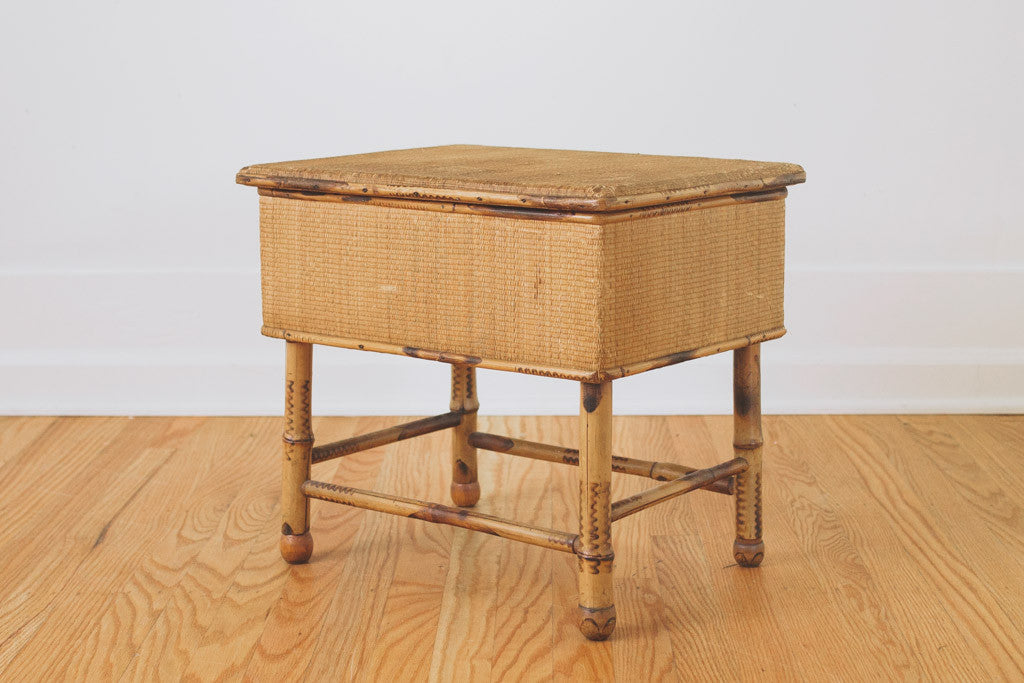 This vintage bamboo stool has four sturdy legs and a top that lifts to store smaller goods. It's in good shape with age related wear. See pictures for detailed condition.