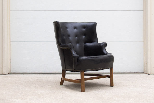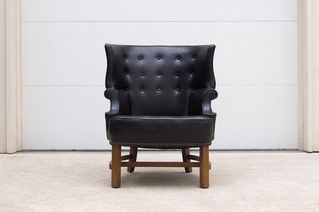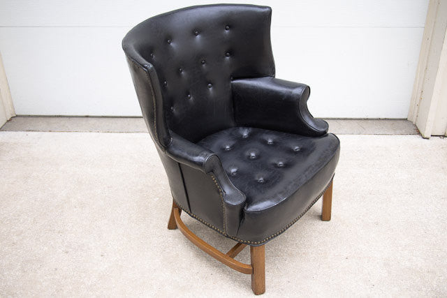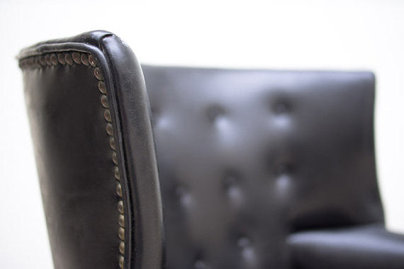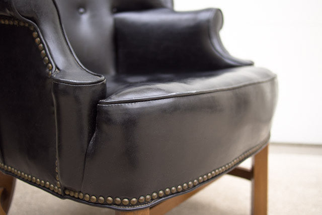 This vintage tufted wingback club chair is one of our favorites. It's upholstered in black Naugahyde with dark wood accents and nailhead trim surrounding almost the entire piece. It's a substantial chair in excellent condition, but for a club chair it's slightly more petite so please check measurements.