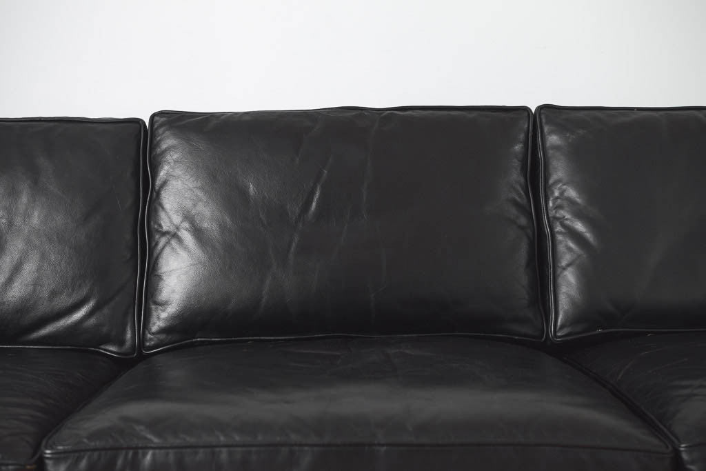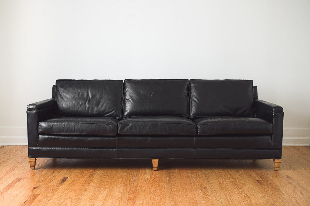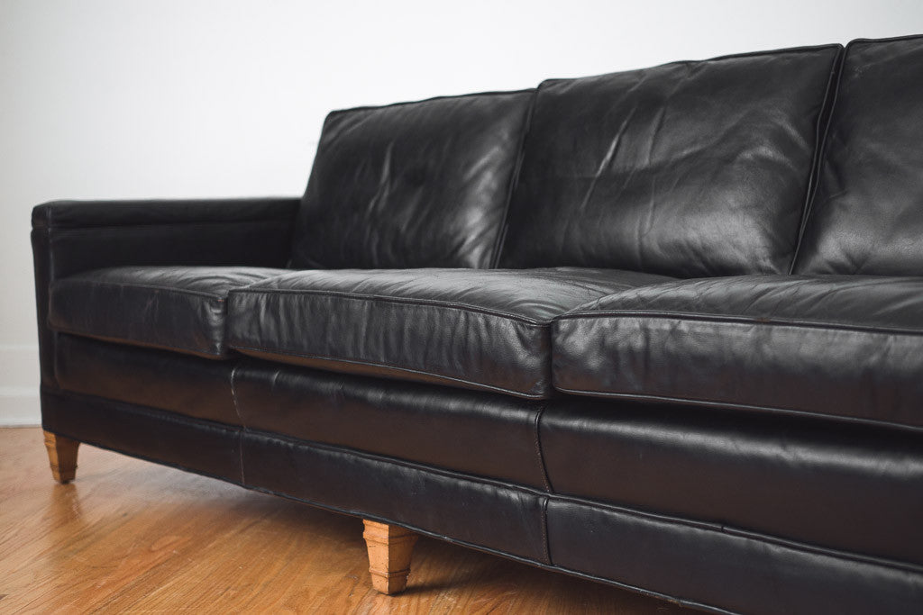 This vintage black leather sofa was made in the USA by Drexel. It has a three over three cushion arrangement and is great for napping. It was polished, conditioned and is in good shape with age related distressing and wear. See pictures for detailed condition.