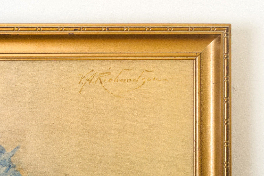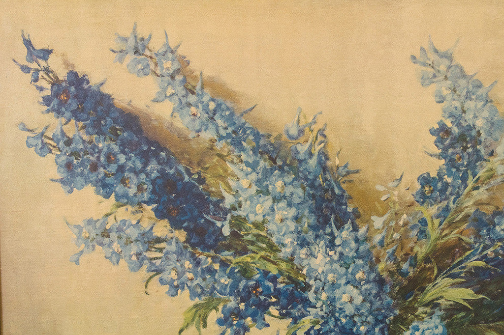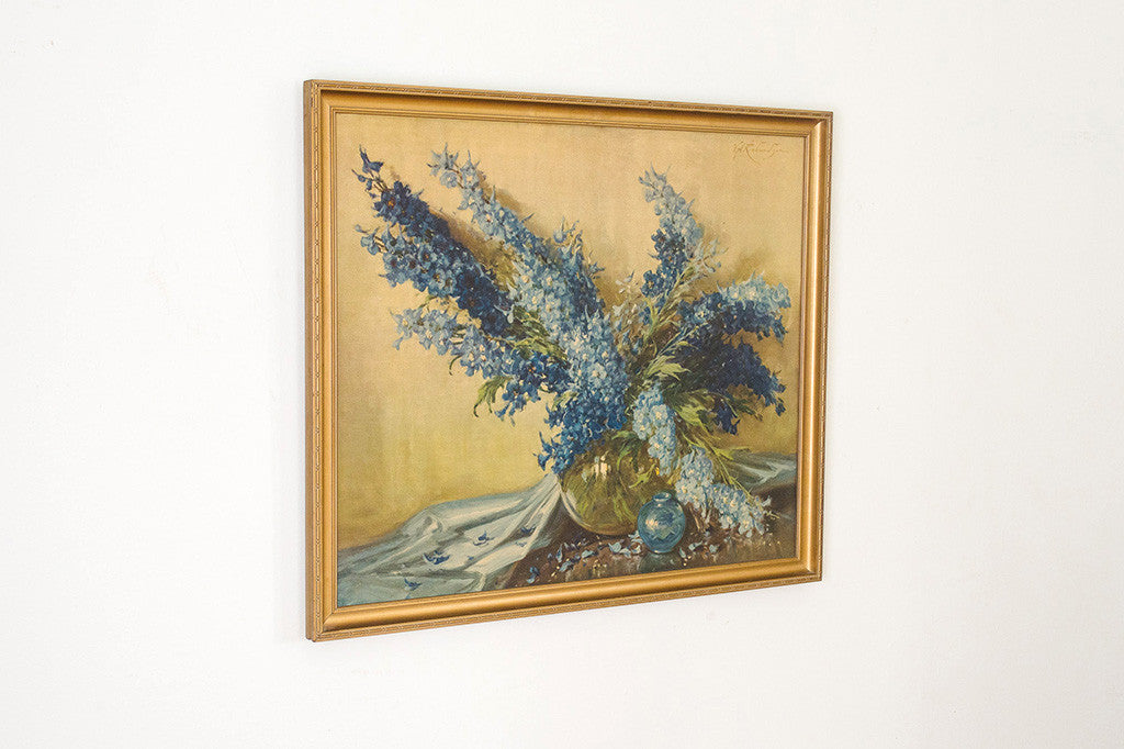 This large framed vintage print has a gold wood frame. It features a floral still life of a vase filled with blue lilacs on a table. It's in great overall shape and is ready to hang. Please see pictures for detailed condition of this piece.
