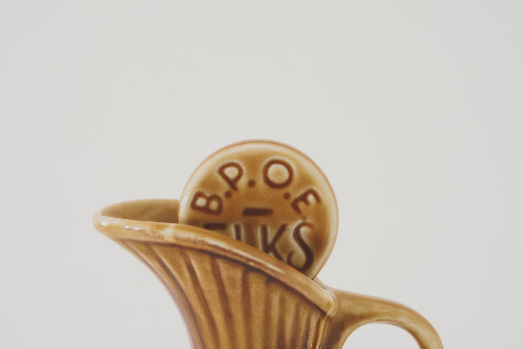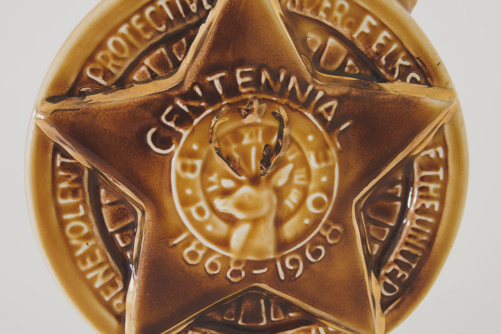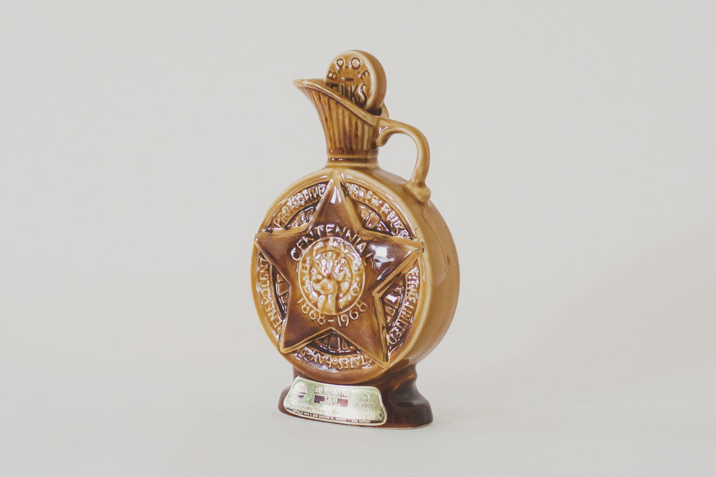 This vintage Jim Beam decanter is ceramic with a shiny brown finish and reads, "Centennial 1868-1968". It has a stopper that reads, "B.P.O.E. Elks" and is in good shape with light age related wear. Please see pictures for detailed condition.