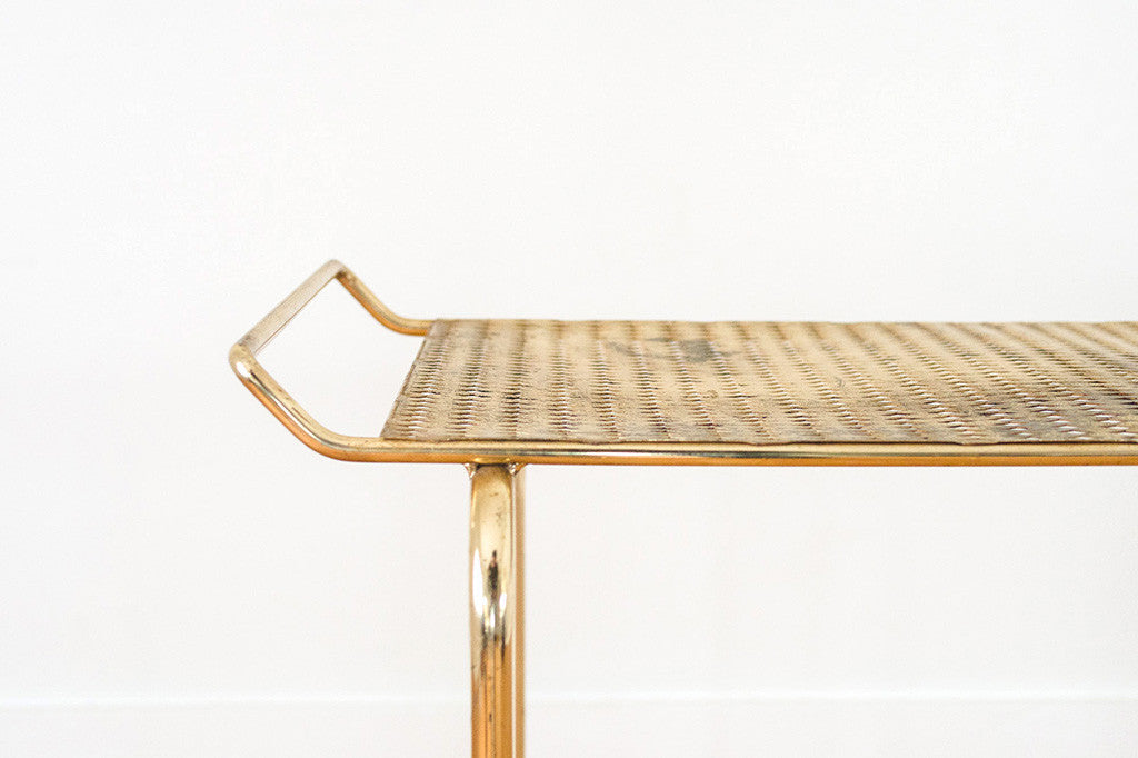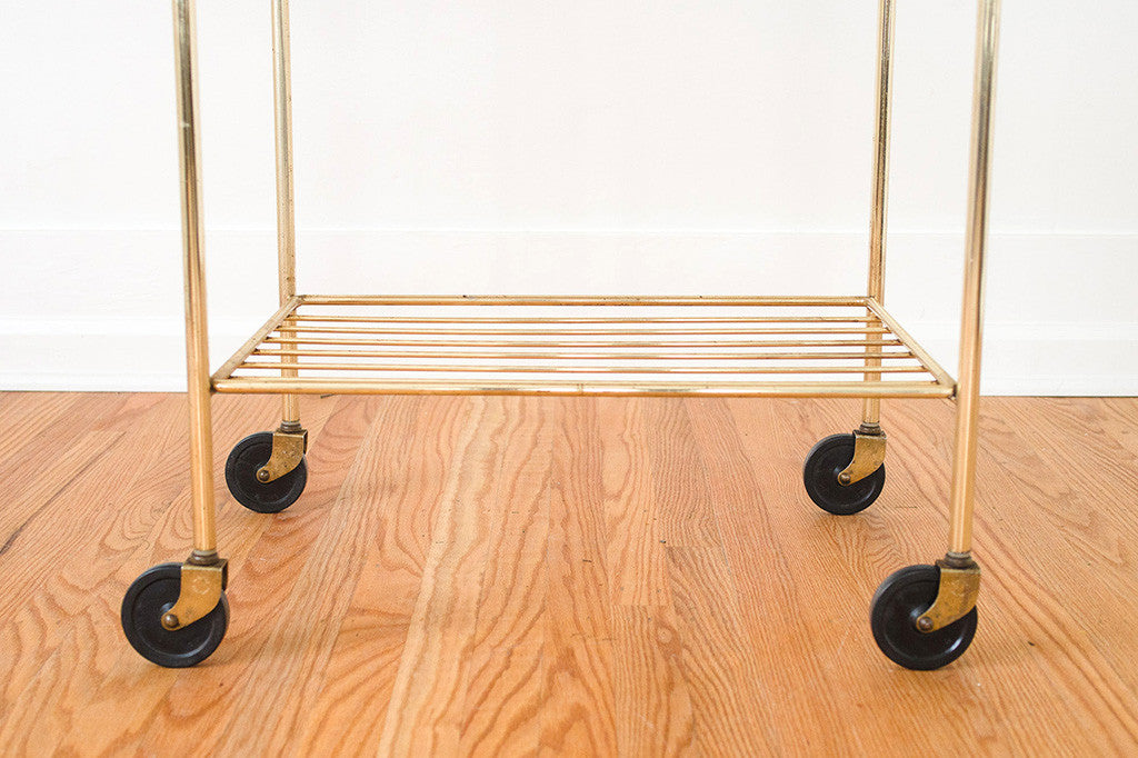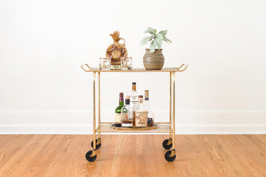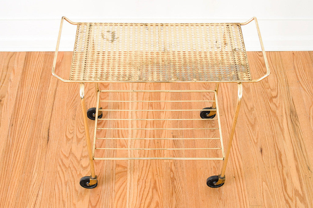 This Mid Century bar cart has a brass frame with two shelves. It's in great shape and would look good with a variety of decorating styles. Please see pictures for detailed condition of this piece. Please see pictures for detailed condition of this piece.