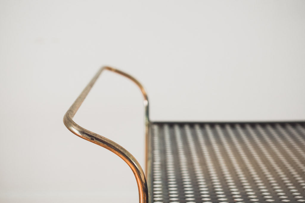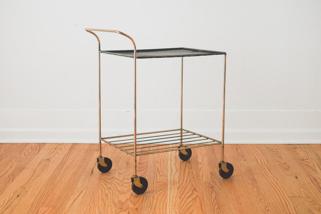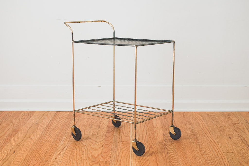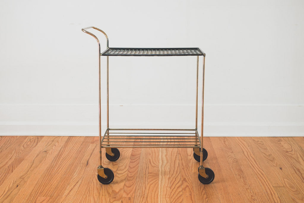This vintage bar cart has a brass frame with two shelves. It's in good shape with age related wear. See pictures for detailed condition.