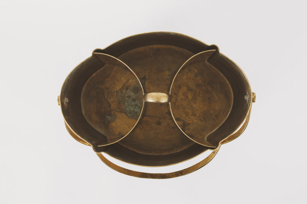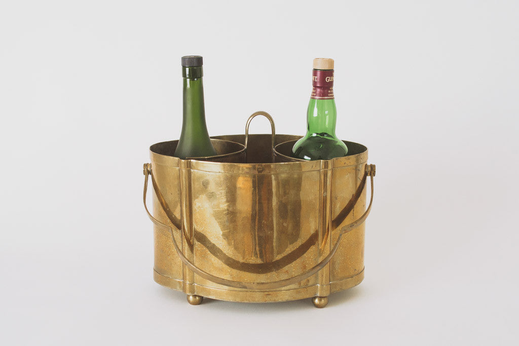 This vintage brass chiller holds two larger bottles. The center is made to hold ice. Please see pictures for detailed condition.