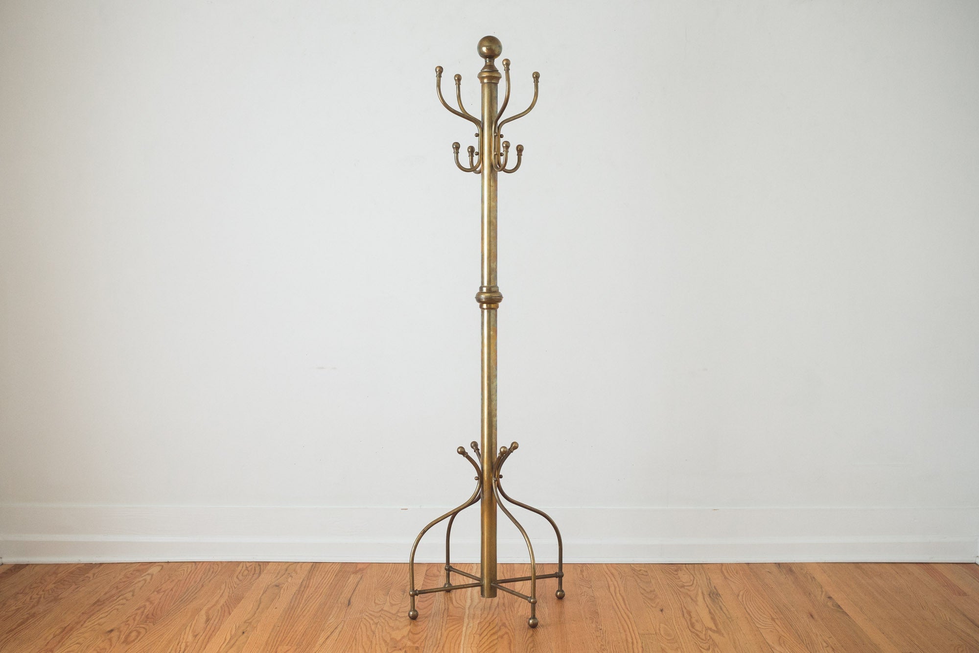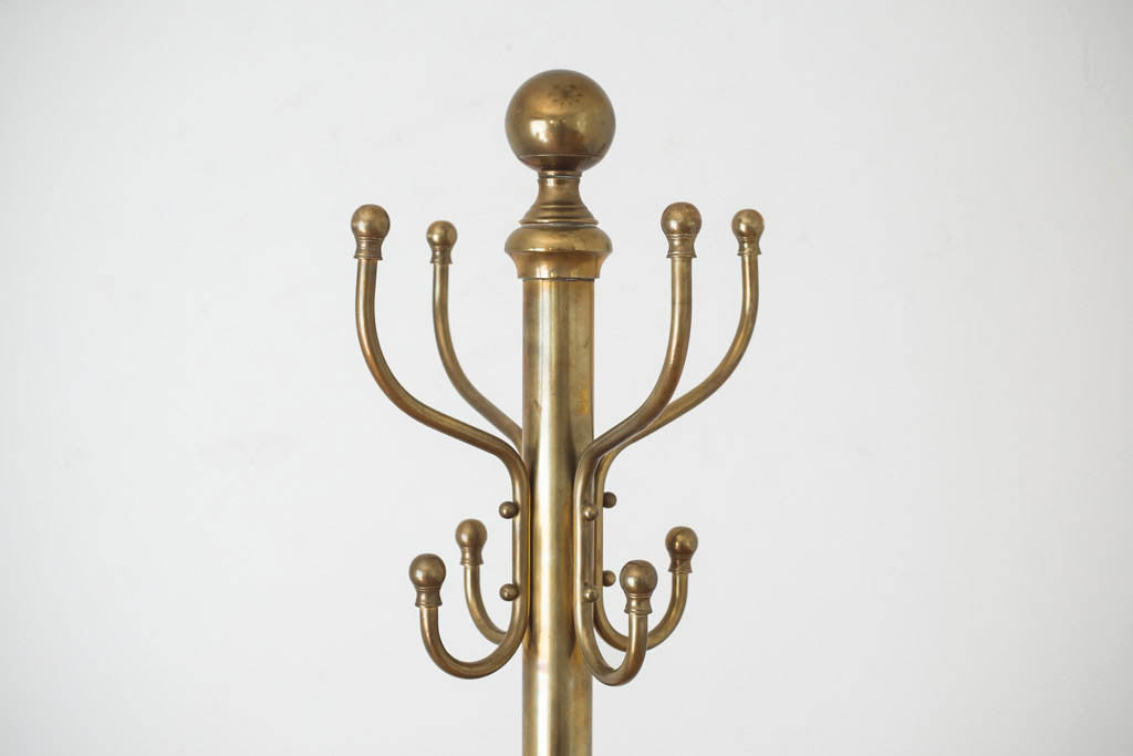This vintage brass coat rack has four double hooks and four lower hooks as well. It would be great in an entryway, mudroom or used as a towel rack in a bathroom. It's in good shape with age related wear. See pictures for detailed condition.