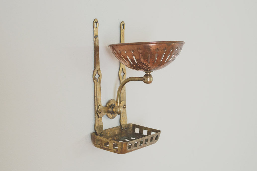 This antique brass and copper wall mount tray holds soap and a sponge. It would look nice in an old kitchen or bathroom and is in great shape with age related wear. Please see pictures for detailed condition.