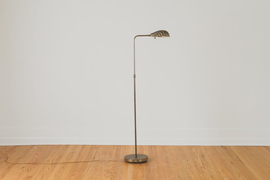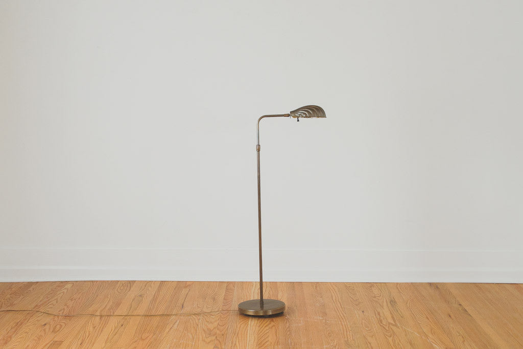 This Vintage Art Deco style floor lamp has a brass finish and is adjustable in height and direction. It's in great shape with age related wear. Please see picture for detailed condition.
