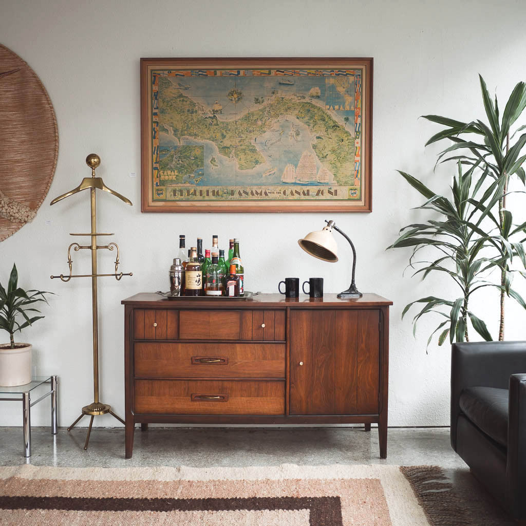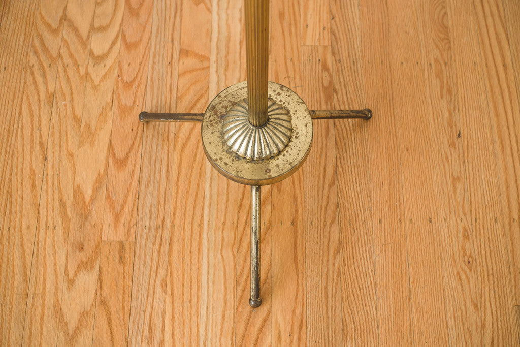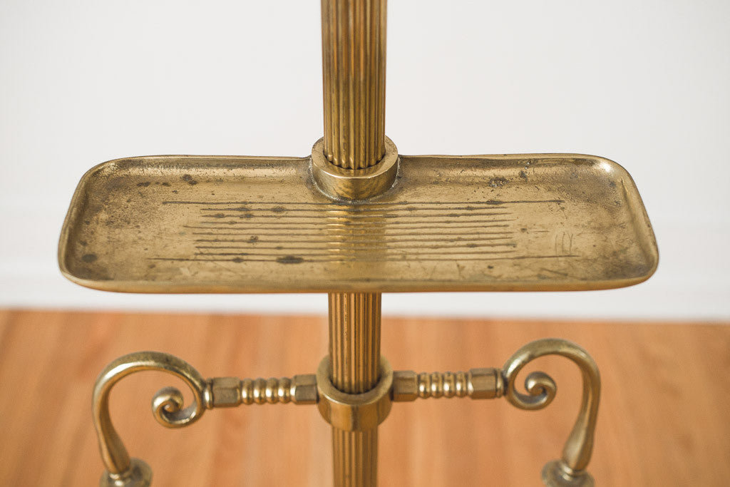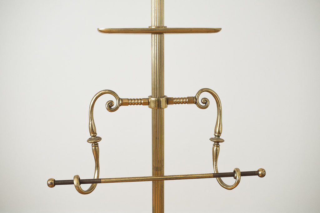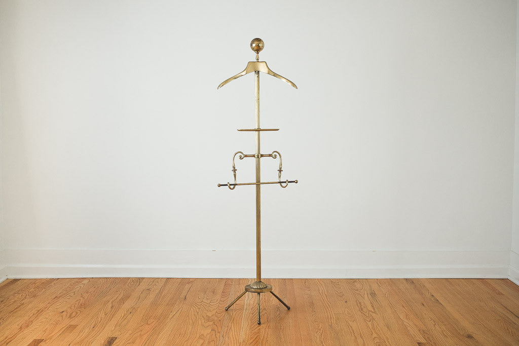 This vintage brass valet has a hat rest, jacket hanger, pants hanger, tray for small pocket items and tripod base. It's in great shape with age related wear. See pictures for detailed condition.