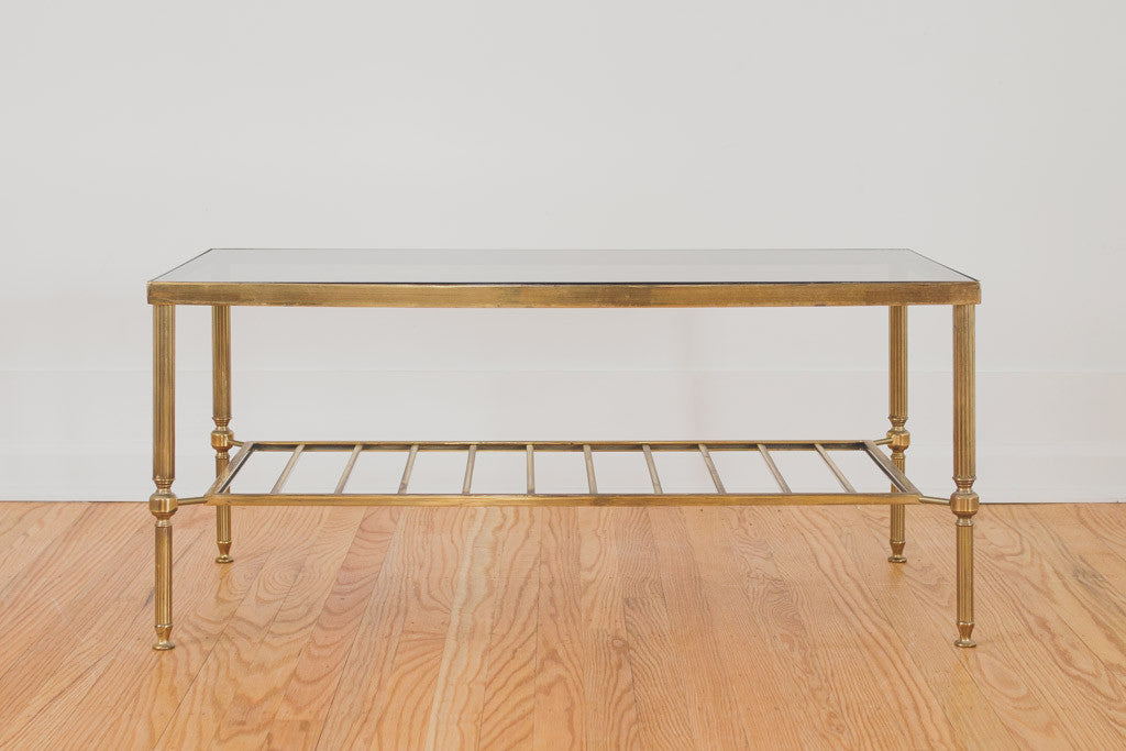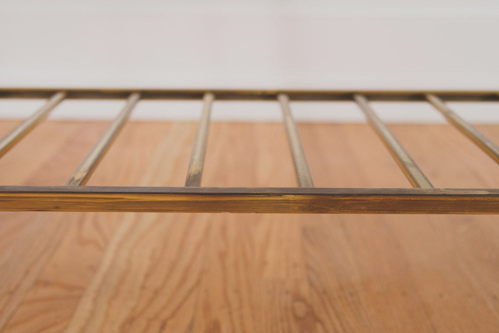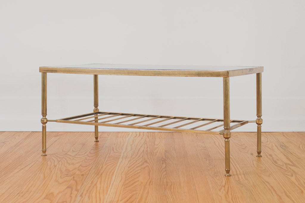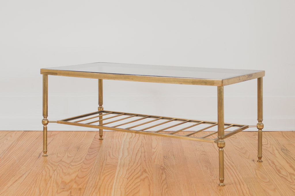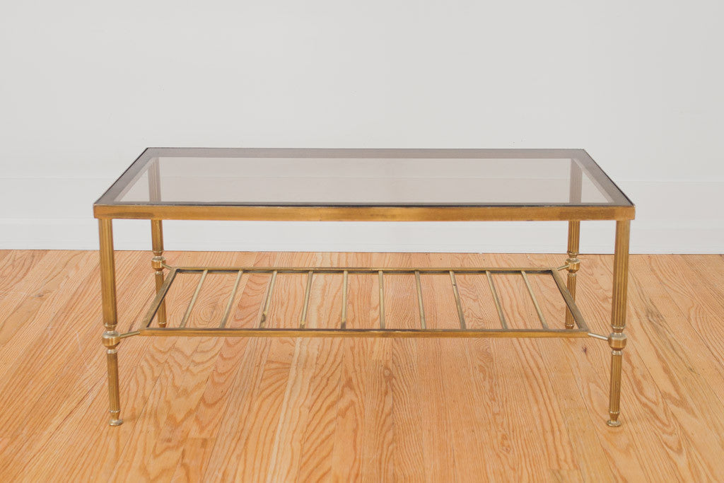 This vintage hollywood regency style coffee table has a brass frame, lower slat shelf and smoked glass top. It's in good shape with some age related wear. Please see pictures for detailed condition.