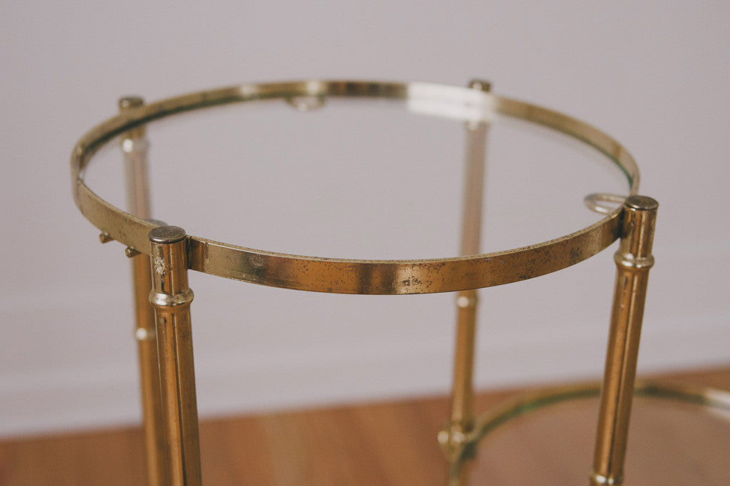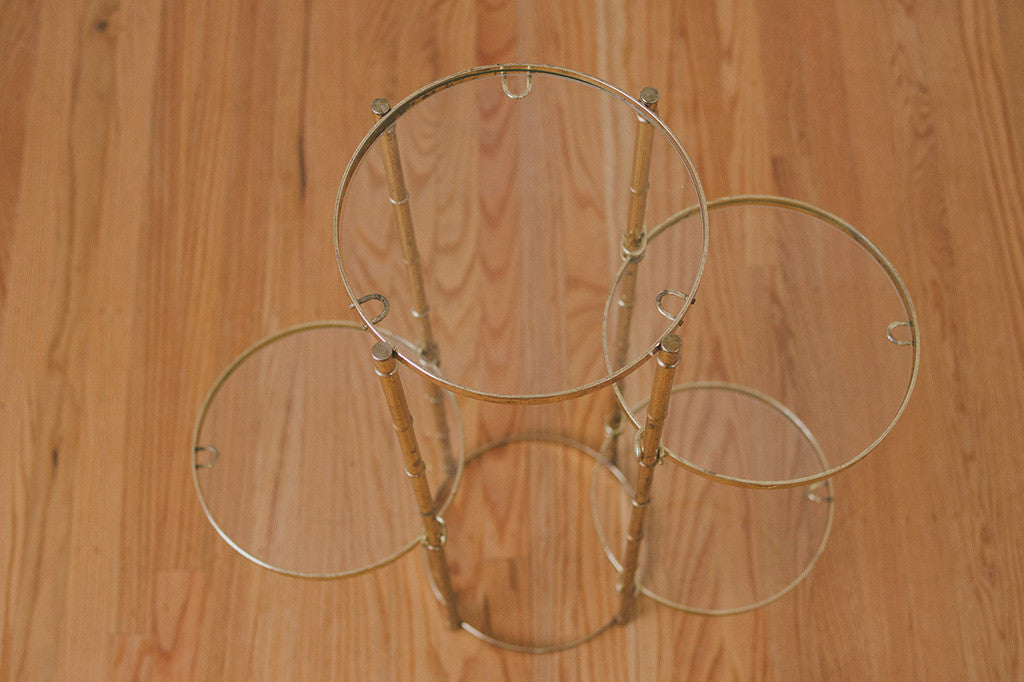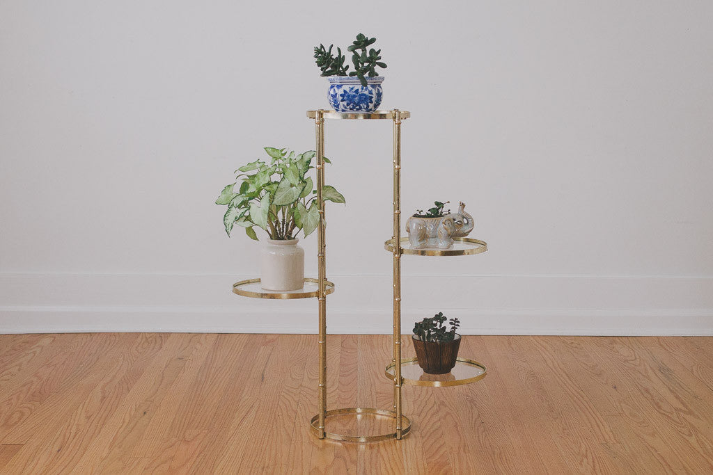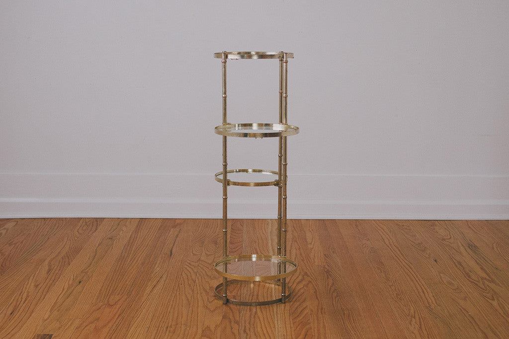 This vintage Hollywood Regency style plant stand has a gold frame with four modular glass shelves. It's in overall great shape with light age related wear. It would also make a nice side table or nightstand. Please see pictures for detailed condition.