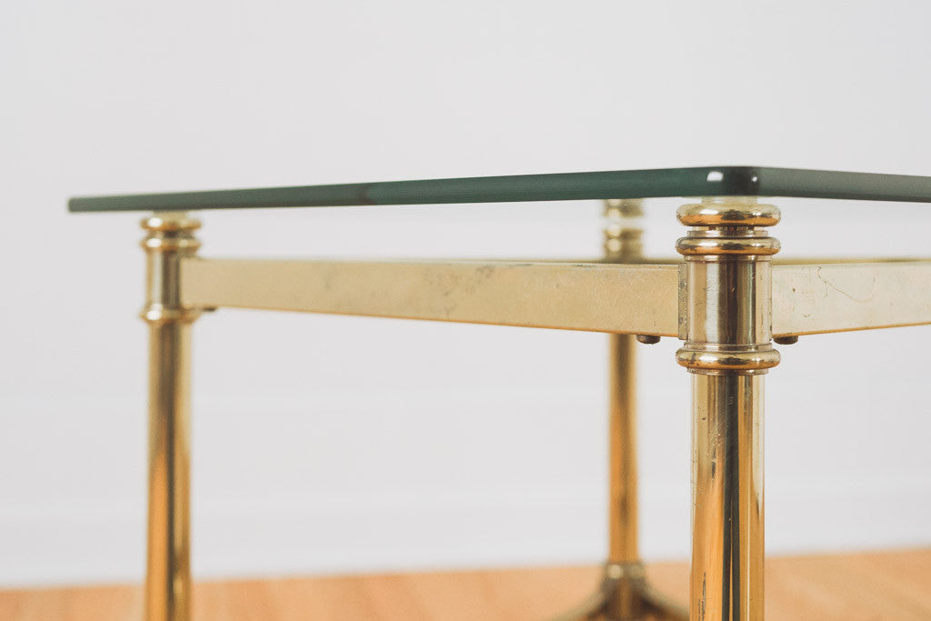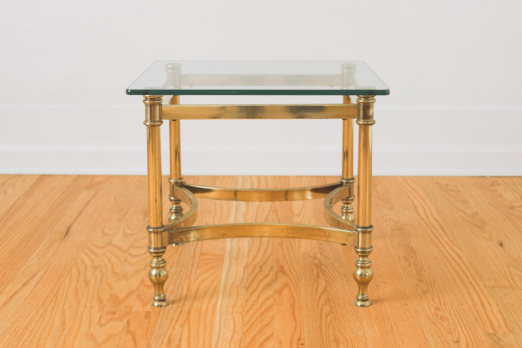 This vintage side table has a brass frame and 1/4" thick glass top. It's in good shape with age related wear. See pictures for detailed condition.