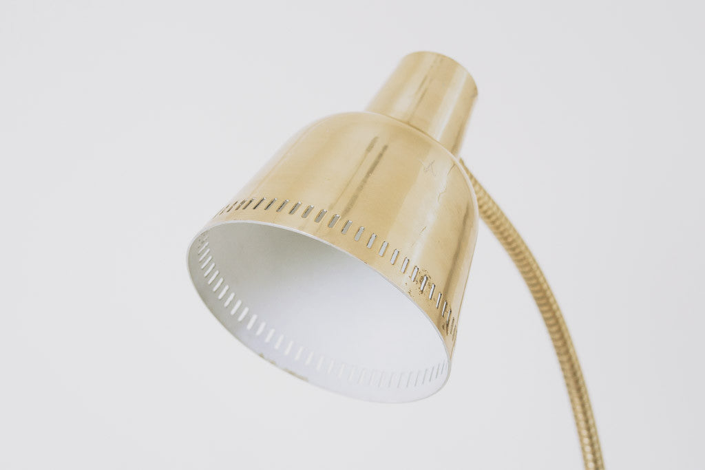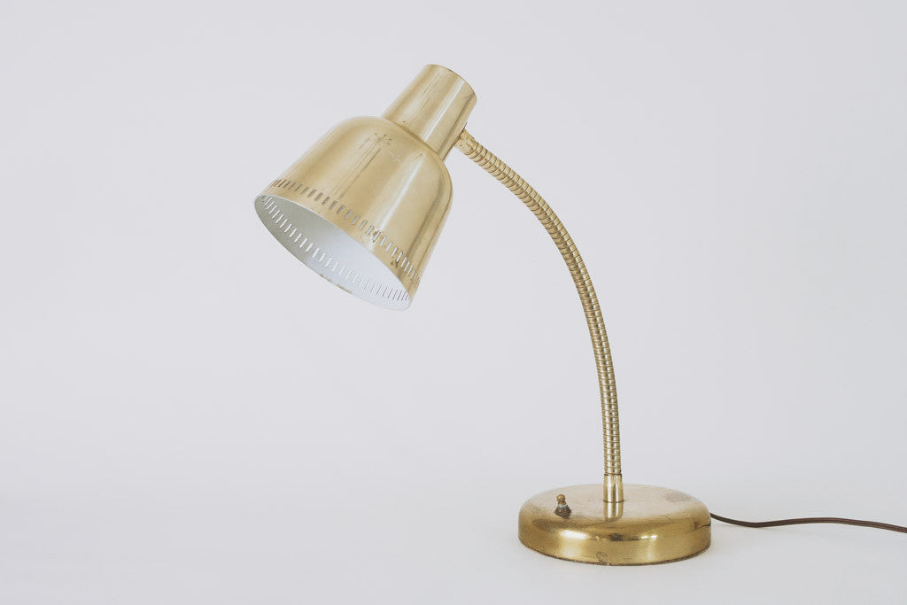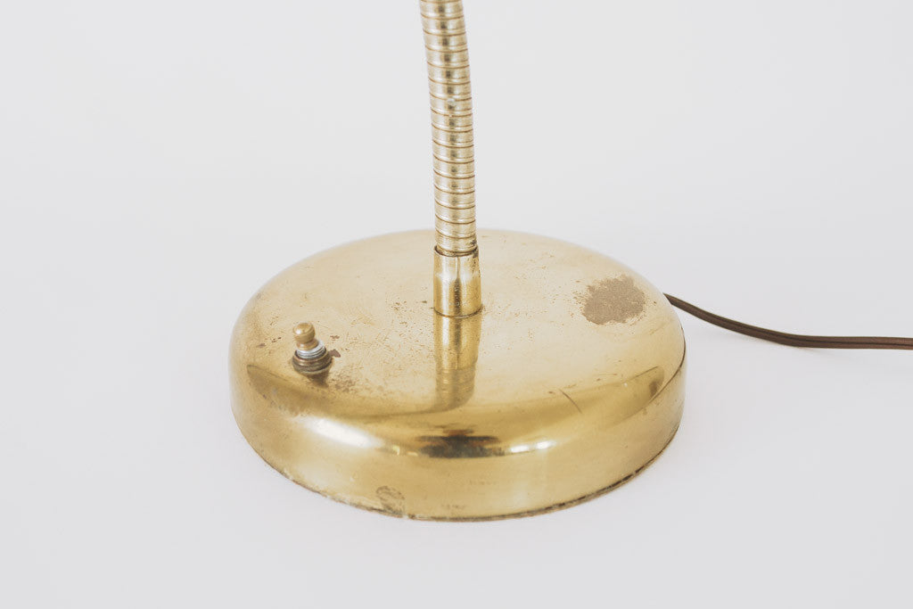 This vintage brass gooseneck lamp holds an individual bulb. It would work well as a desk or reading light. It's in good shape with age related wear. See pictures for detailed condition.