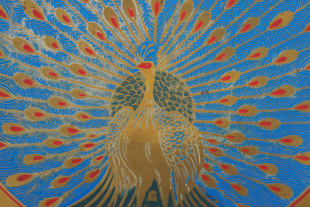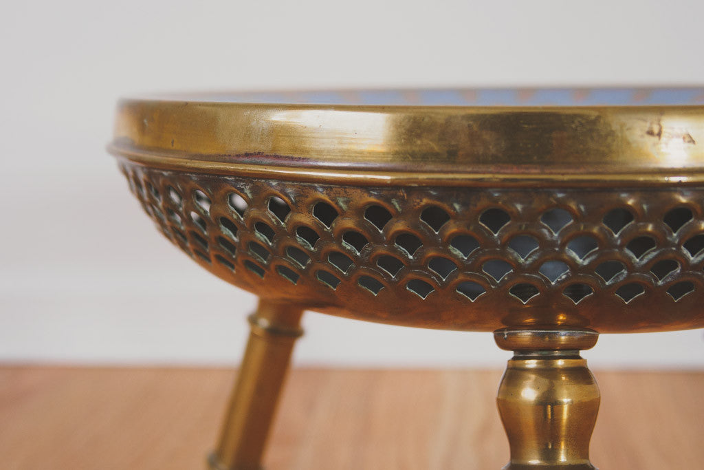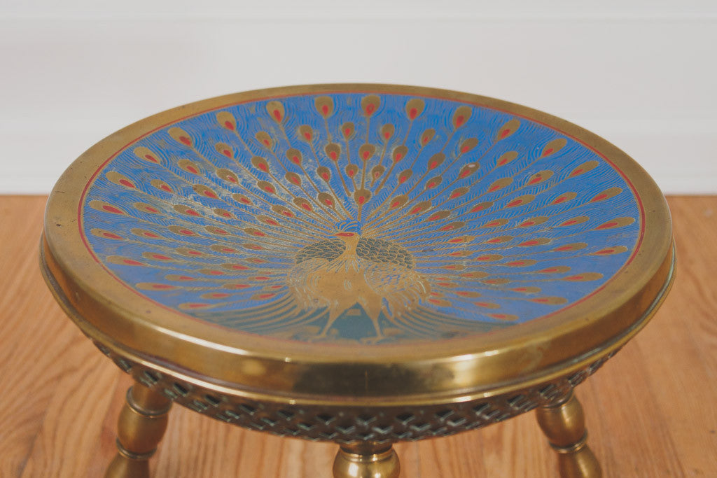 This vintage plant stand is brass with a bright peacock design on the top and a tripod base. It's in good shape with natural age related wear. Please see pictures for detailed condition.