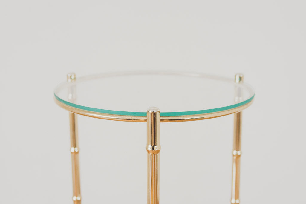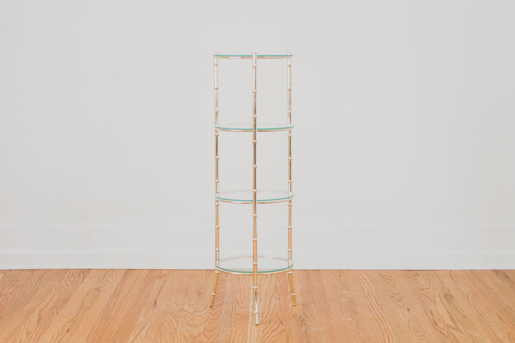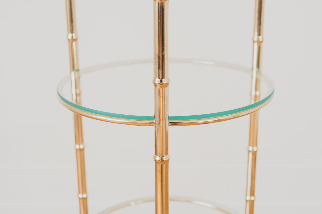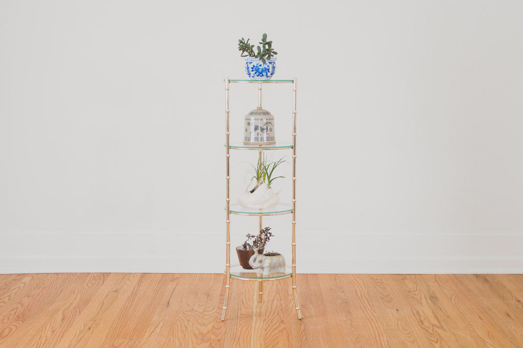 This vintage plant stand has a gold bamboo style frame with four glass shelves. It's in good shape with light age related wear. Please see pictures for detailed condition.