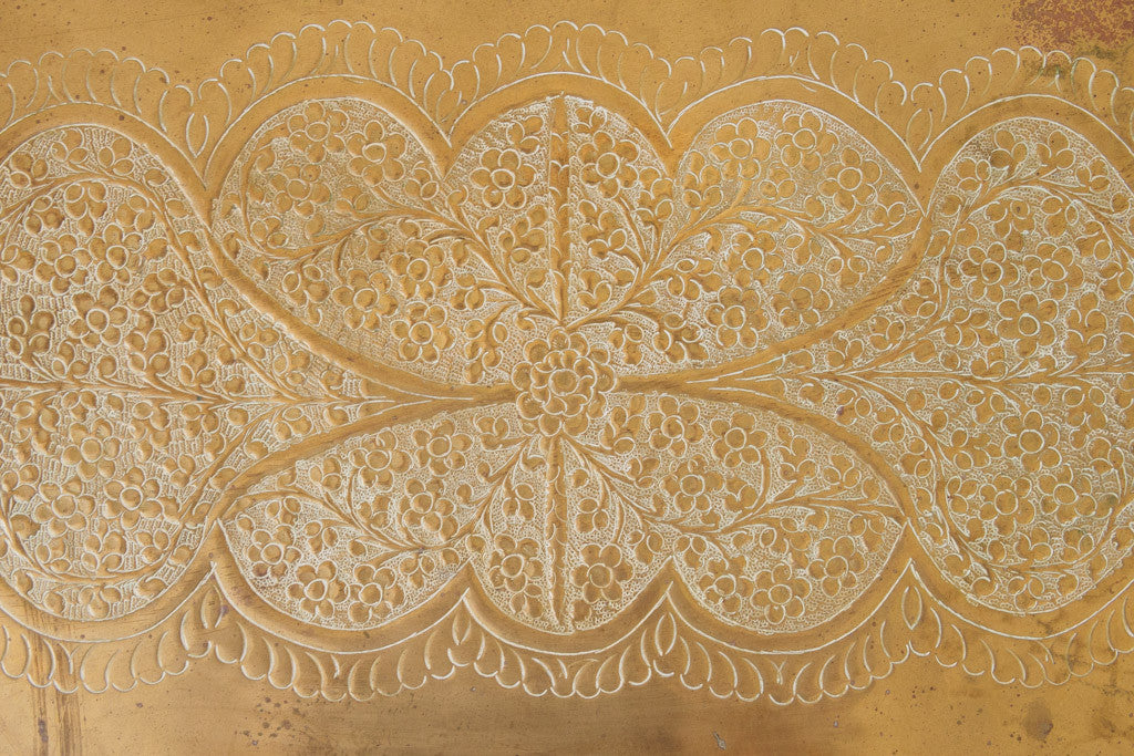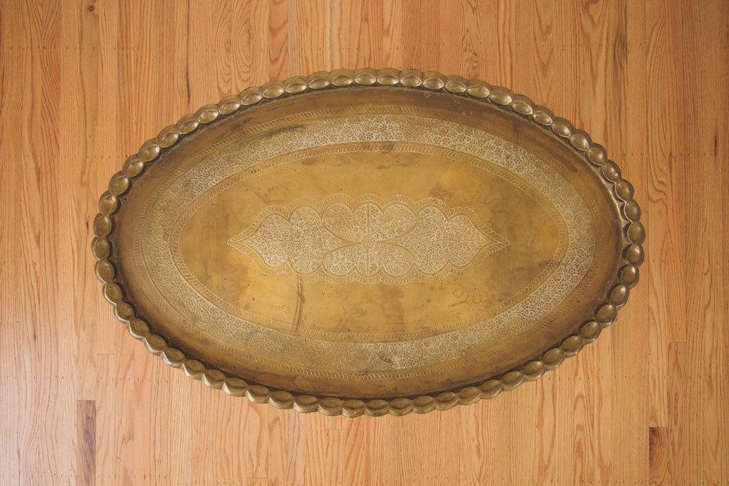 This vintage coffee table has a heavy brass oval tray top that rests on a folding wood frame with four legs. The tray has a very detailed carved design and the legs are brass capped. It's in good shape with age related wear including a professional repair to the base. Please see pictures for detailed condition.