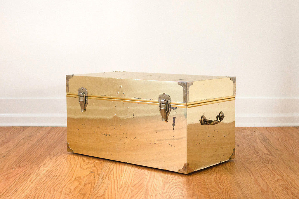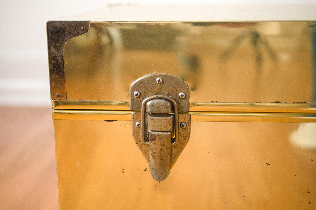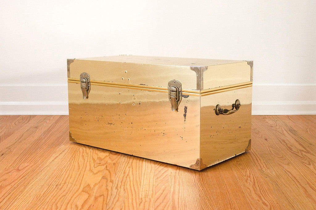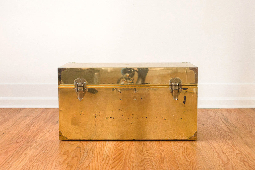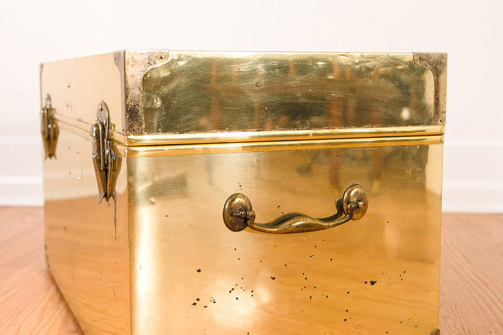 This old brass chest has a nicely distressed patina, solid metal hardware and a clean cedar-lined interior. It's in good shape and would make a great coffee table, end of the bed storage piece or bench. Please see pictures for detailed condition of this piece.